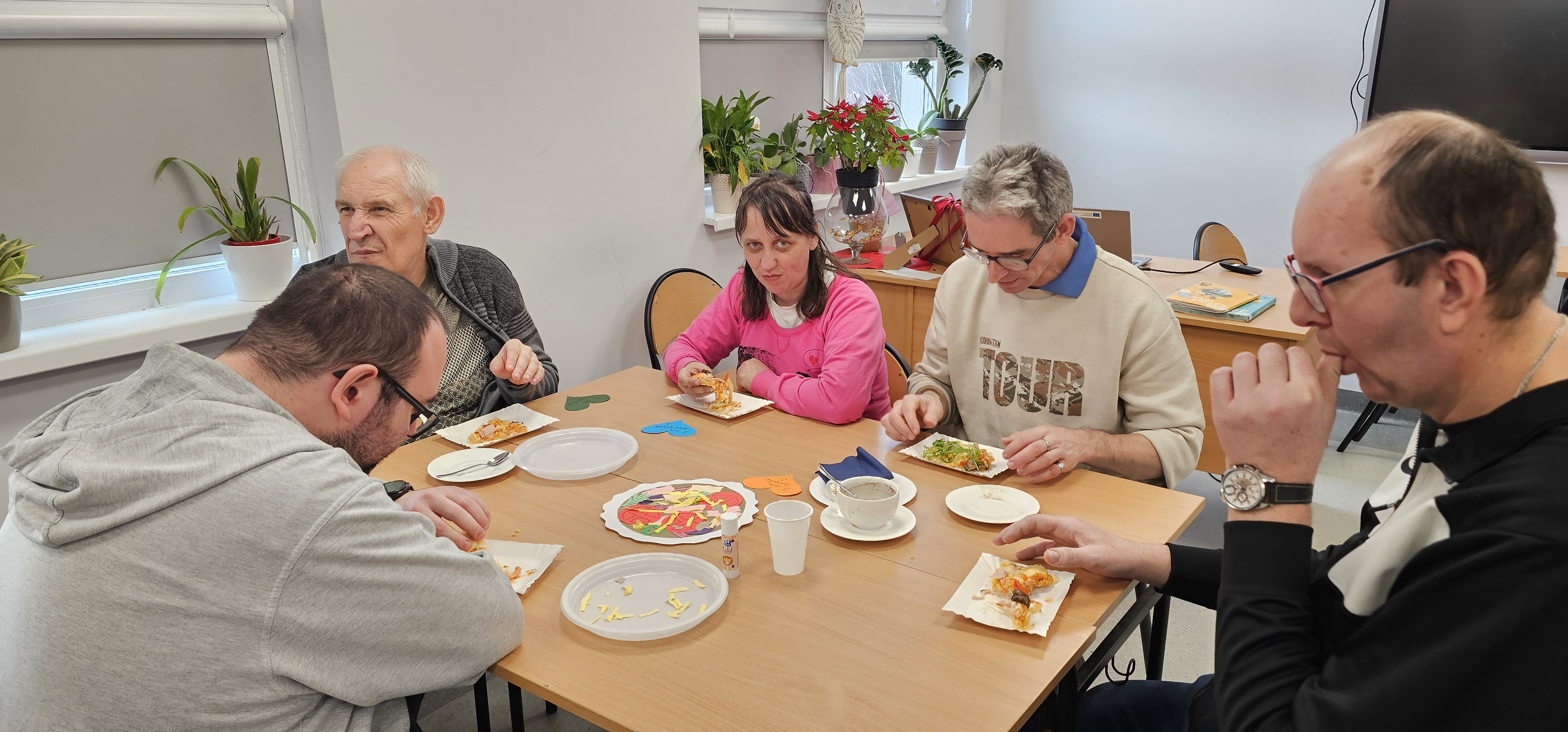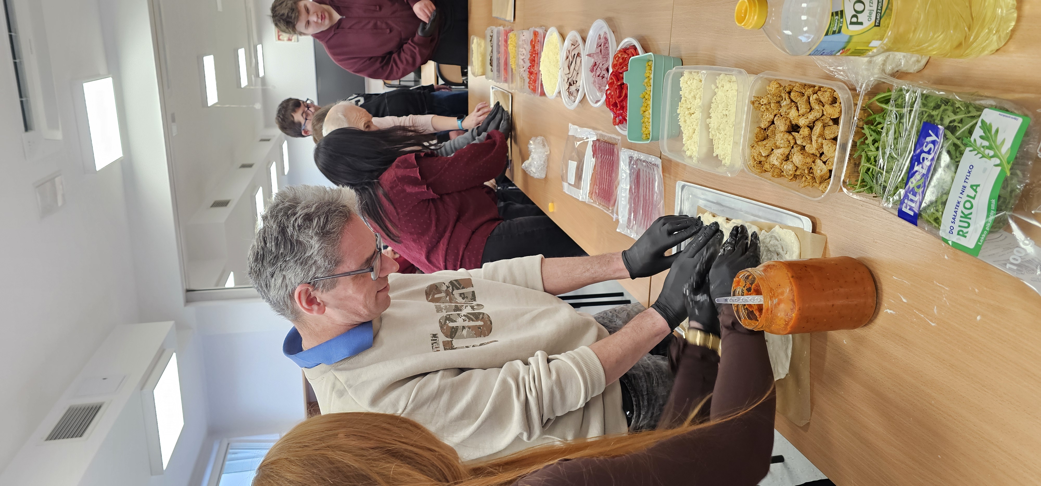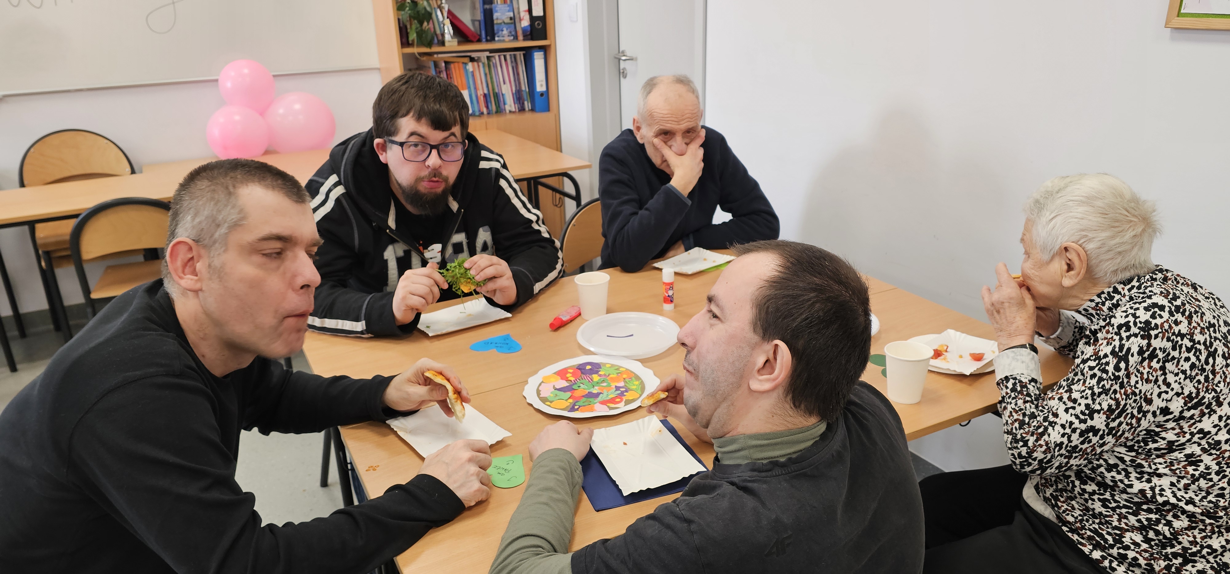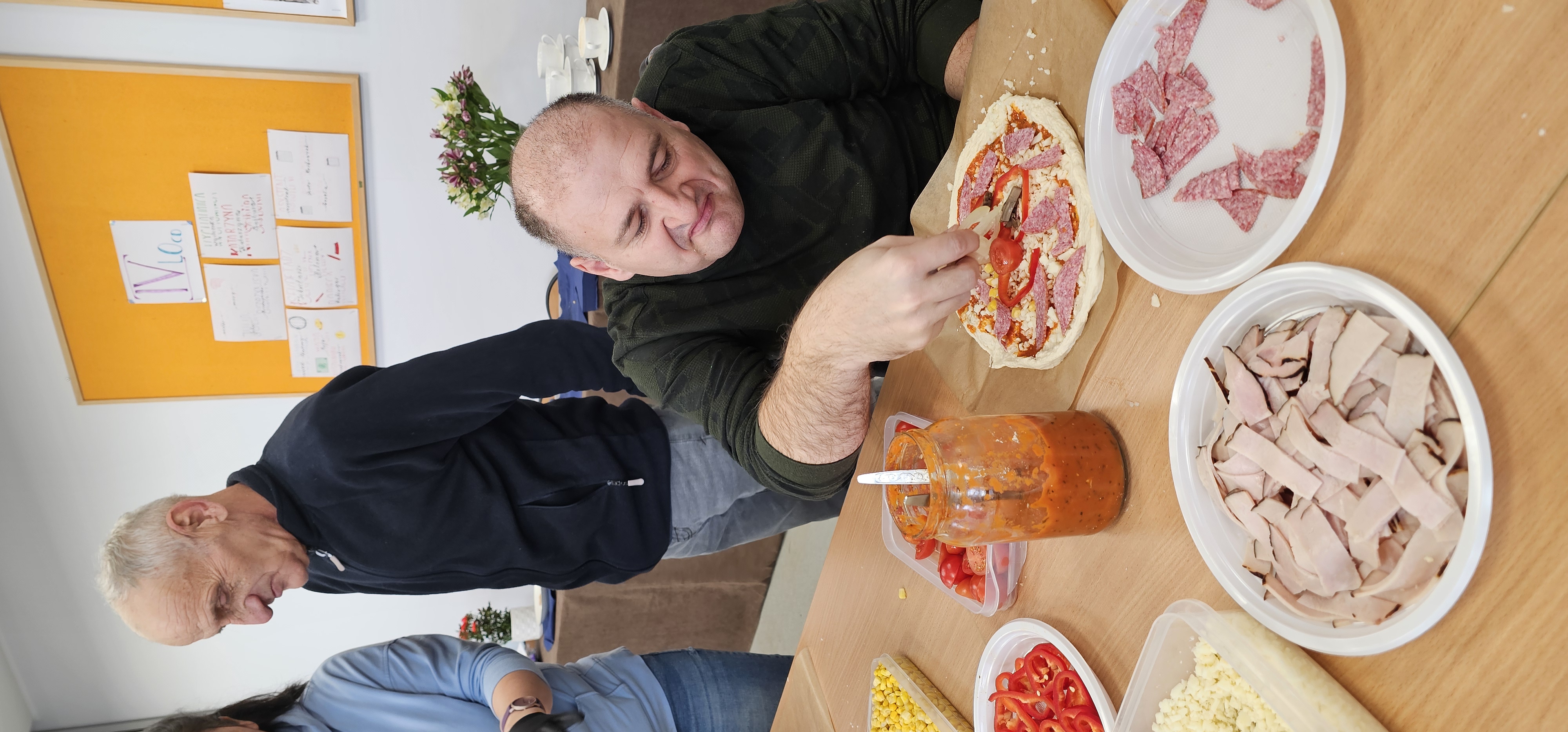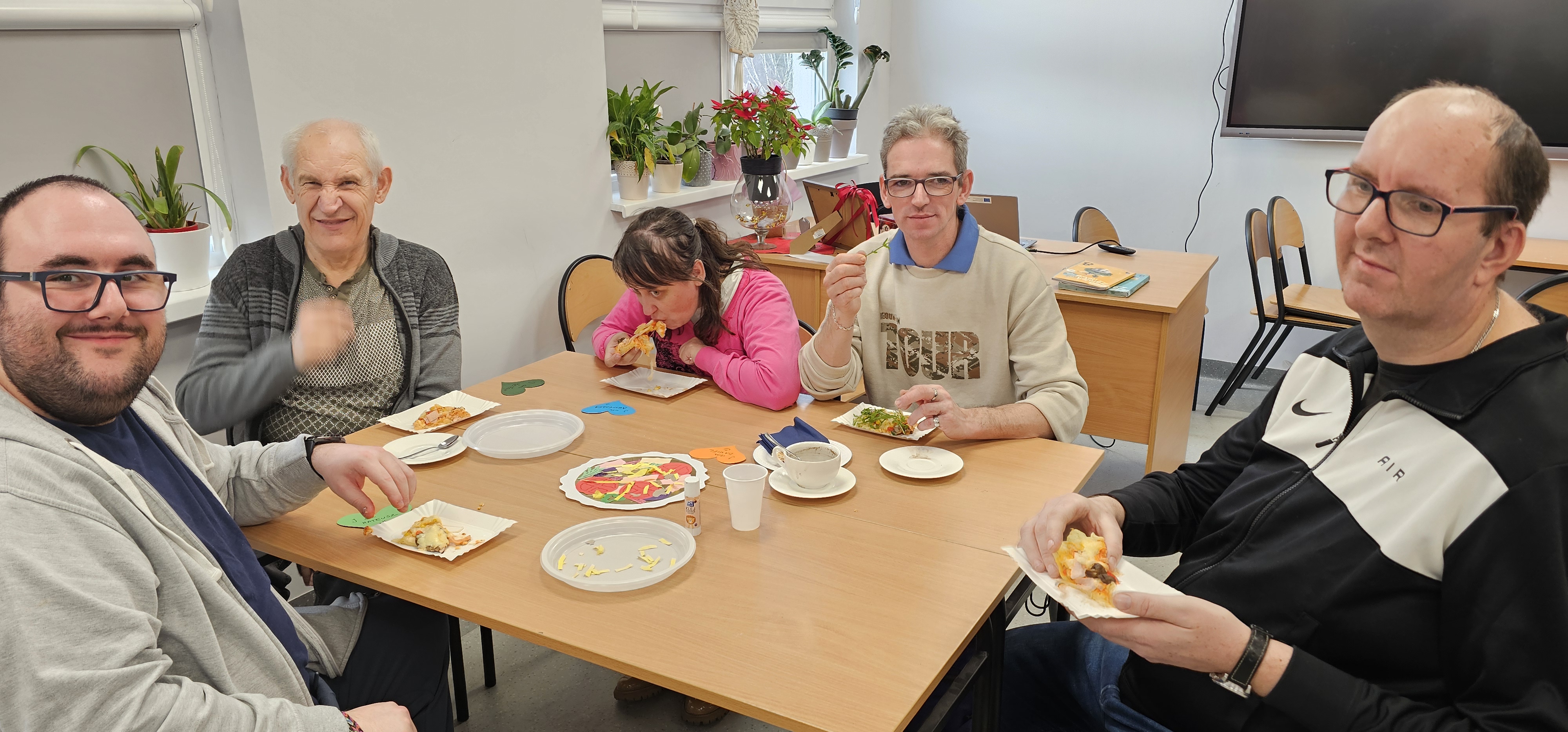 Już od progu zostaliśmy serdecznie powitani i oprowadzeni po placówce, dzięki czemu od razu poczuliśmy się swobodnie i mile widziani. Po zwiedzaniu udaliśmy się do sali lekcyjnej na piętrze, gdzie czekał na nas słodki poczęstunek oraz ulubiona przez wszystkich kawa. W miłej atmosferze rozpoczęliśmy wspólne świętowanie. Każdy z nas otrzymał serduszko ze swoim imieniem, żeby łatwiej było się porozumieć z gospodarzami. Przy wsparciu wolontariuszy bawiliśmy się w komponowanie pizzy przy użyciu elementów z papieru. Po warsztatach plastycznych nastąpiła część artystyczna. Dziewczyny ze Szkoły Podstawowej zachwyciły nas efektownym pokazem akrobatyki sportowej. Dodatkową niespodzianką była autorska piosenka o pizzy, która wywołała uśmiech i gromkie brawa. Po występach razem z wolontariuszami dekorowaliśmy wcześniej przygotowane ciasto różnorodnymi prawdziwymi składnikami, tworząc własne kompozycje smakowe. Następnie nasze pizze trafiły do pieca, a chwilę później na nasze talerze. Smakowały wyśmienicie, zwłaszcza że były przygotowane własnoręcznie. Normalnie palce lizać