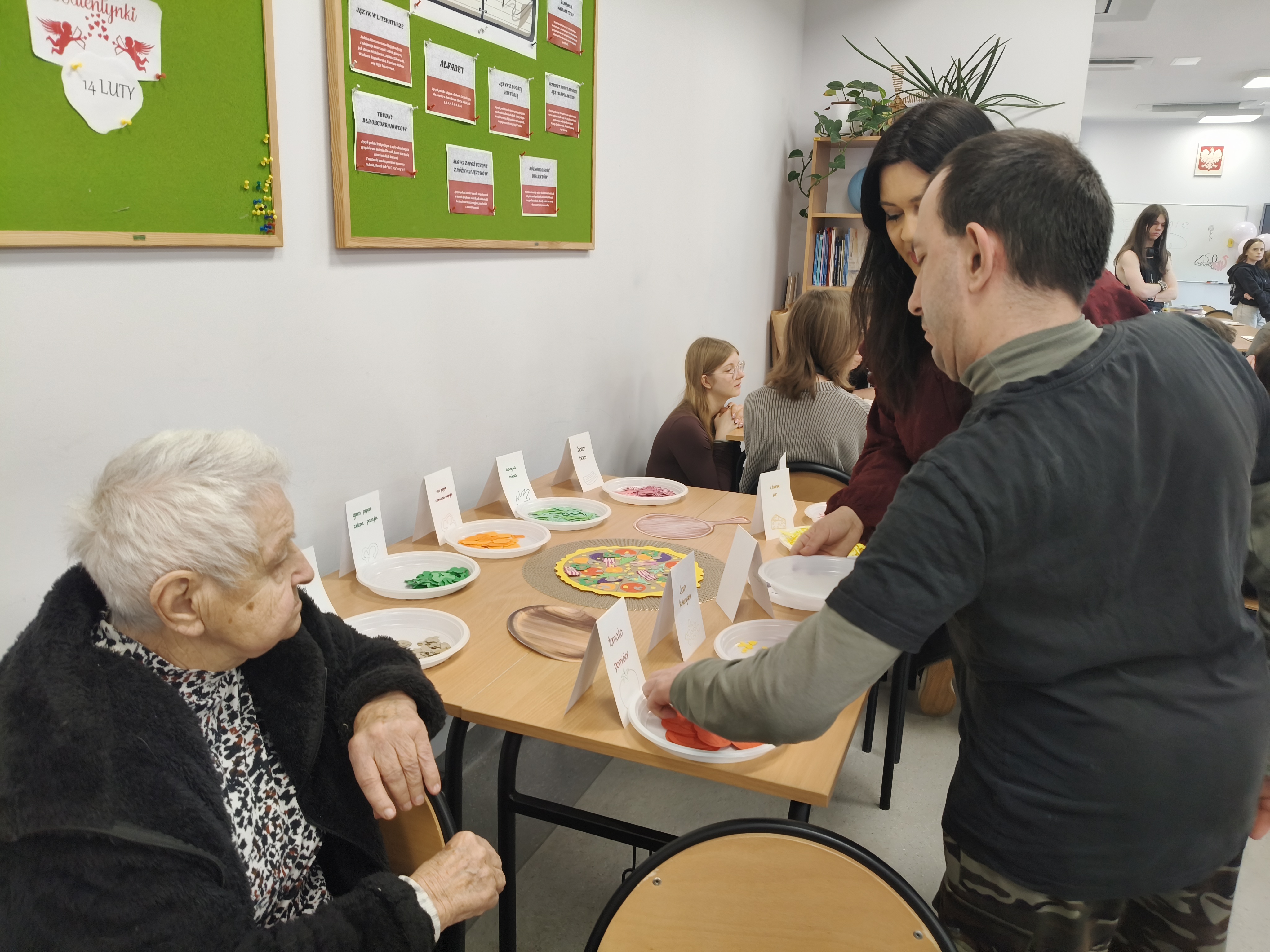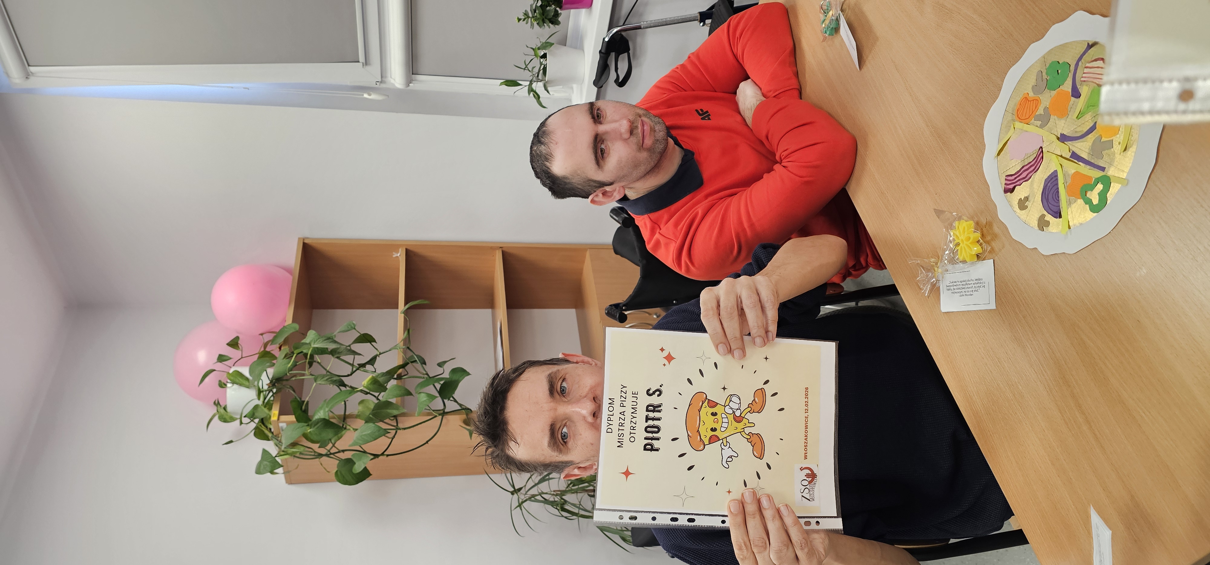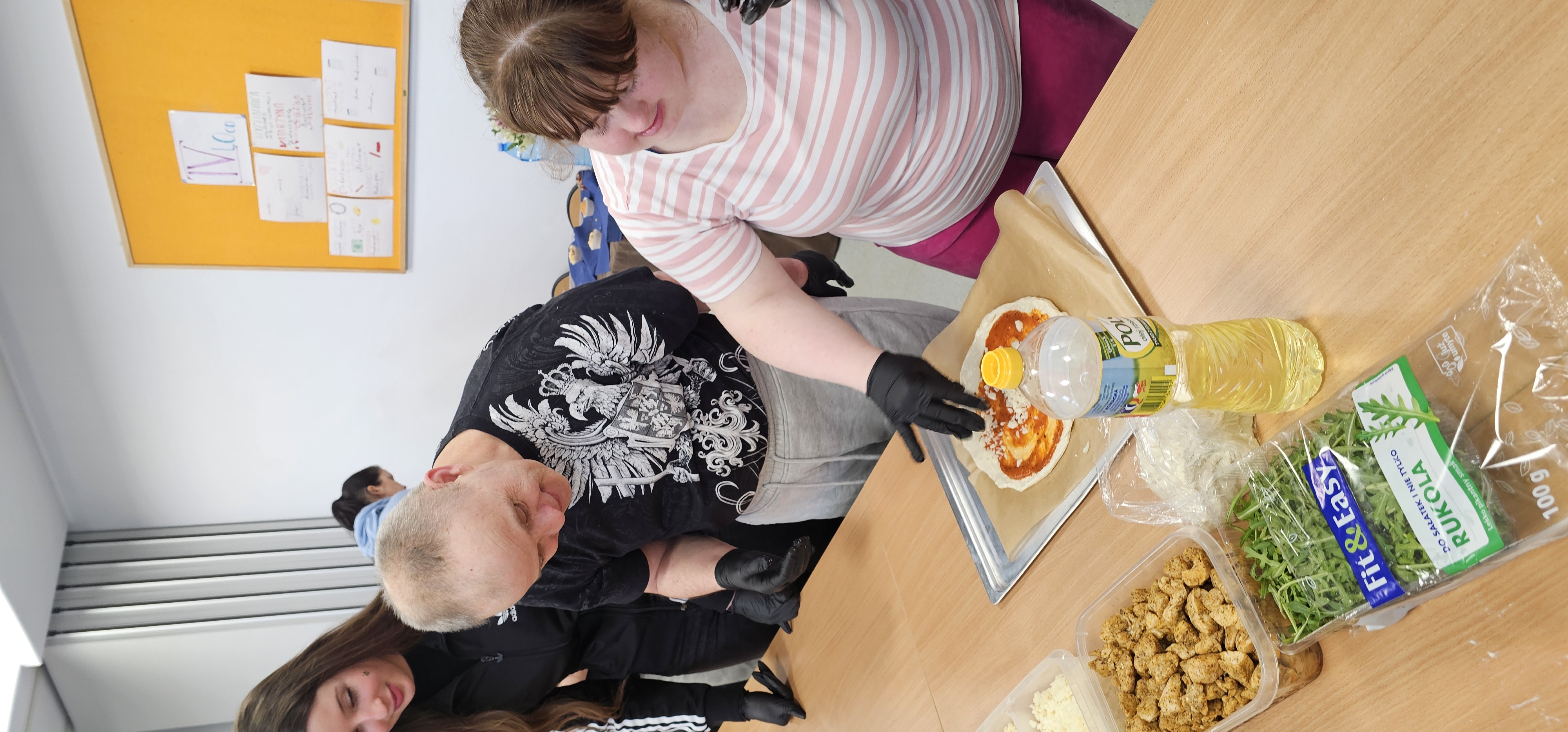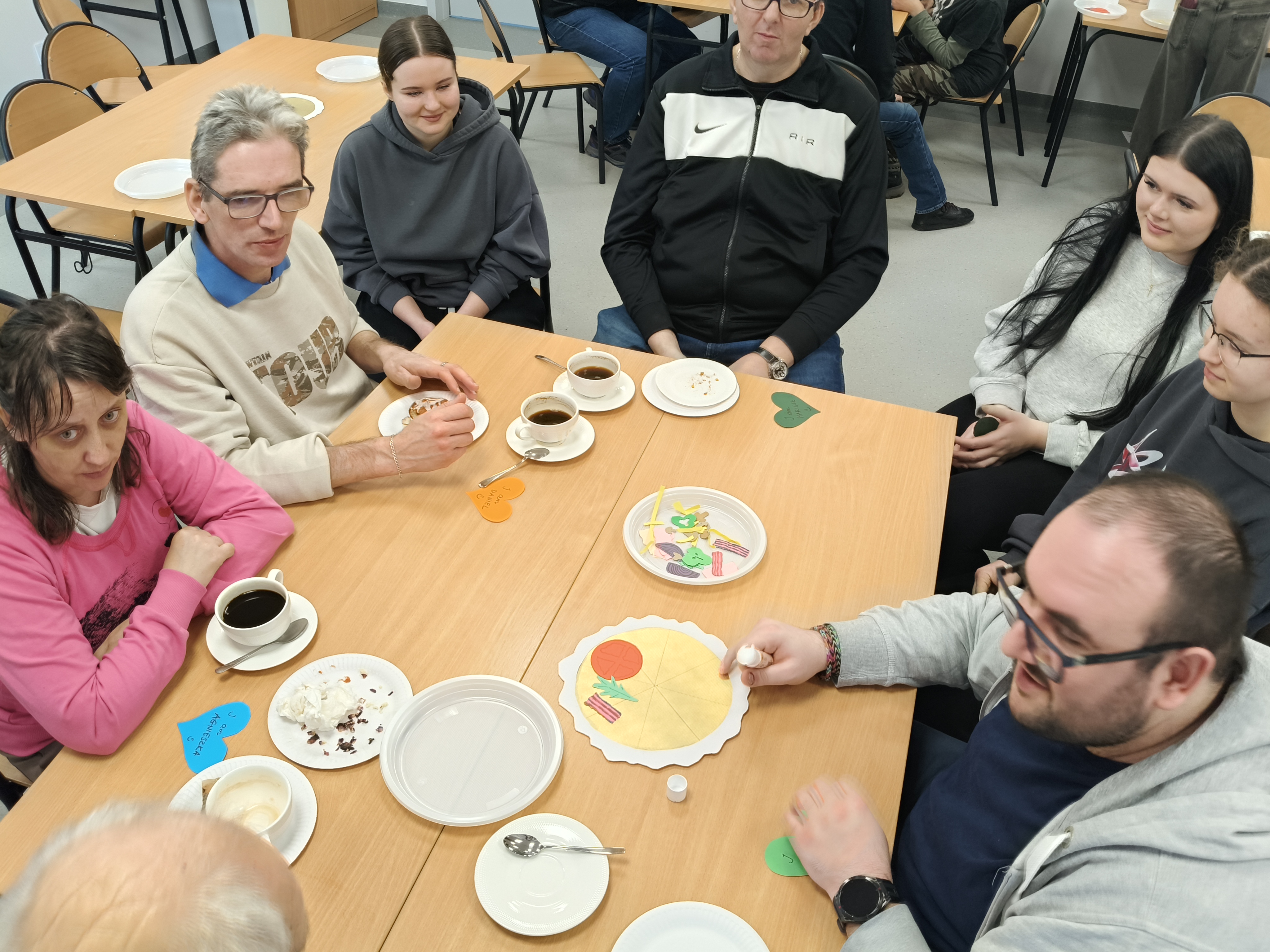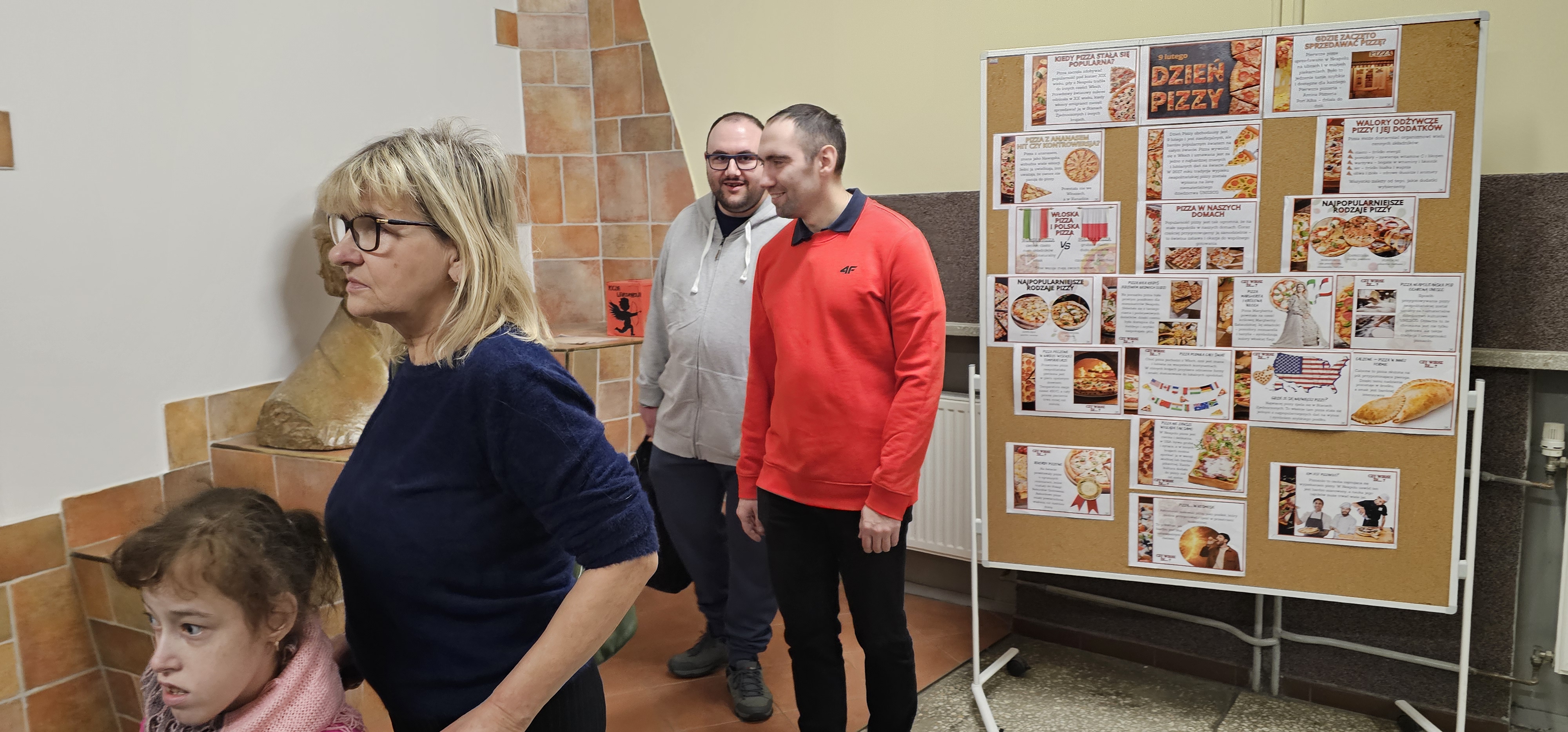 Już od progu zostaliśmy serdecznie powitani i oprowadzeni po placówce, dzięki czemu od razu poczuliśmy się swobodnie i mile widziani. Po zwiedzaniu udaliśmy się do sali lekcyjnej na piętrze, gdzie czekał na nas słodki poczęstunek oraz ulubiona przez wszystkich kawa. W miłej atmosferze rozpoczęliśmy wspólne świętowanie. Każdy z nas otrzymał serduszko ze swoim imieniem, żeby łatwiej było się porozumieć z gospodarzami. Przy wsparciu wolontariuszy bawiliśmy się w komponowanie pizzy przy użyciu elementów z papieru. Po warsztatach plastycznych nastąpiła część artystyczna. Dziewczyny ze Szkoły Podstawowej zachwyciły nas efektownym pokazem akrobatyki sportowej. Dodatkową niespodzianką była autorska piosenka o pizzy, która wywołała uśmiech i gromkie brawa. Po występach razem z wolontariuszami dekorowaliśmy wcześniej przygotowane ciasto różnorodnymi prawdziwymi składnikami, tworząc własne kompozycje smakowe. Następnie nasze pizze trafiły do pieca, a chwilę później na nasze talerze. Smakowały wyśmienicie, zwłaszcza że były przygotowane własnoręcznie. Normalnie palce lizać