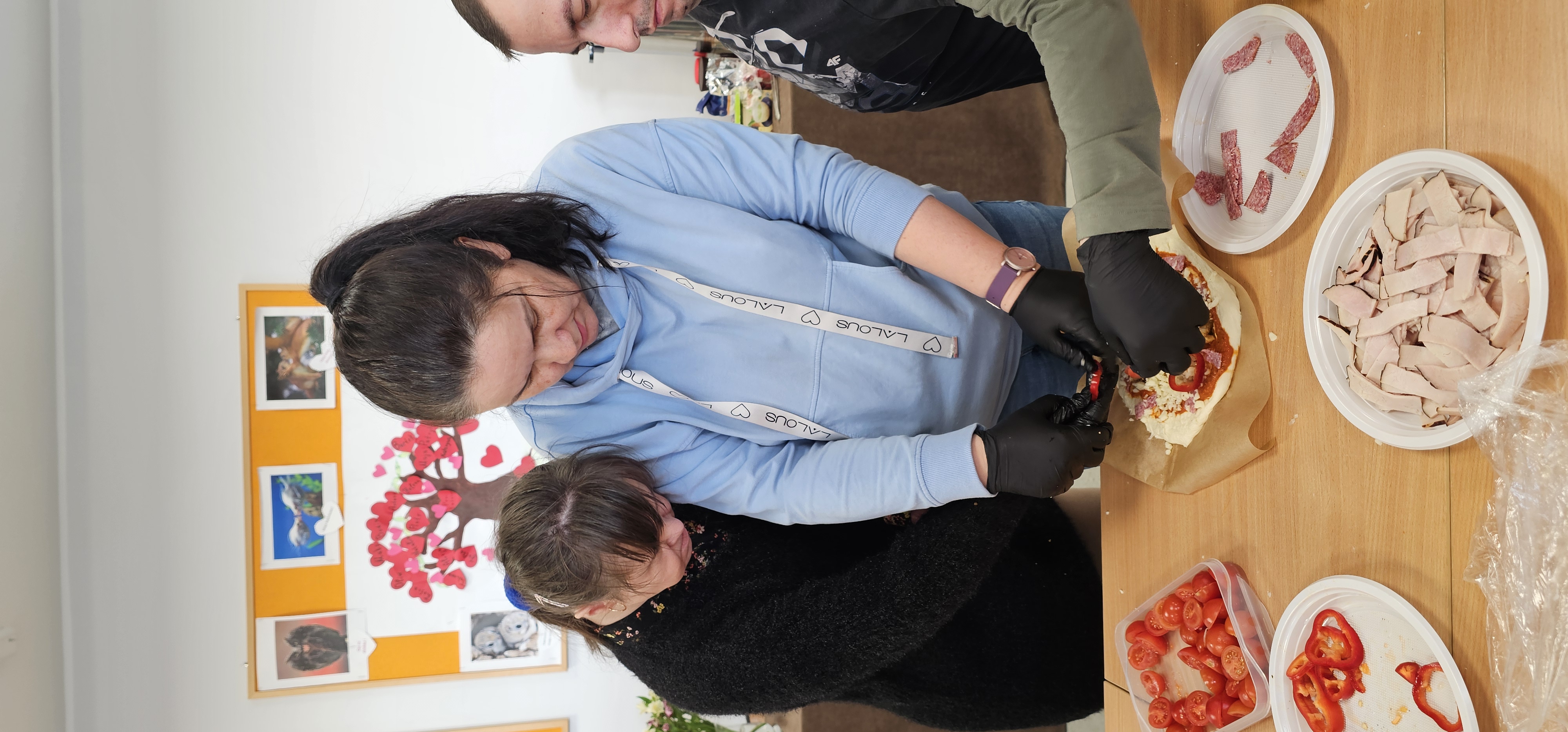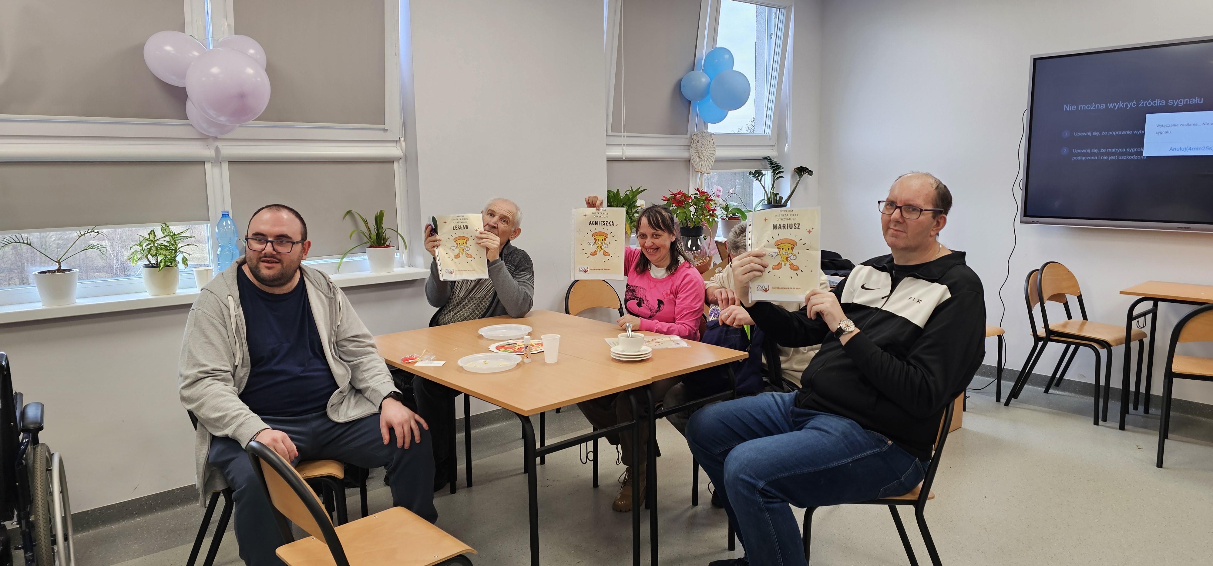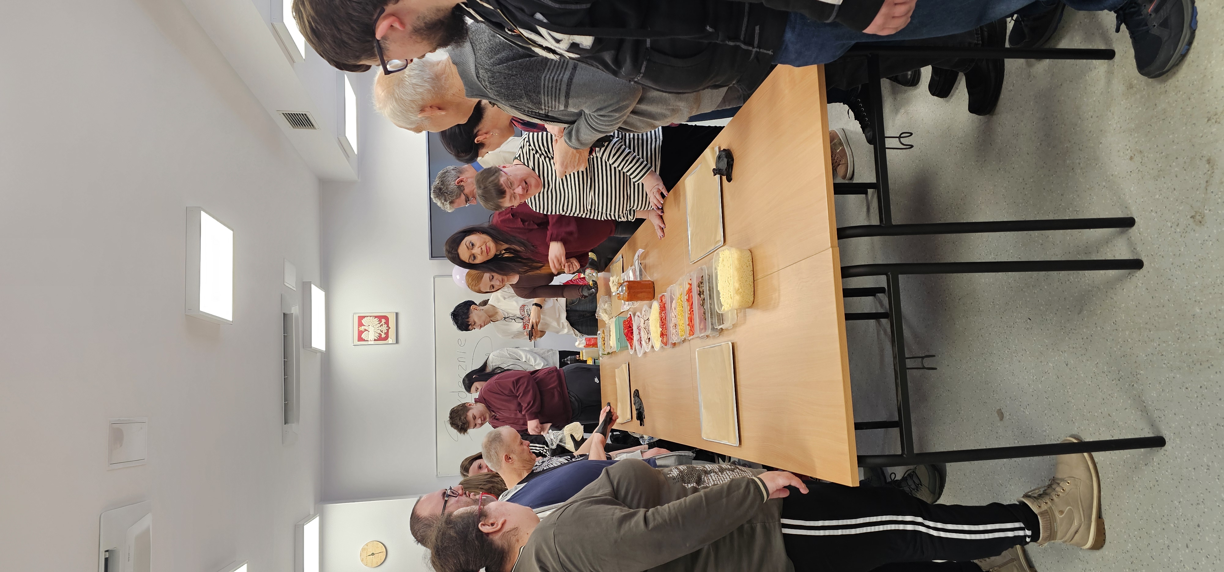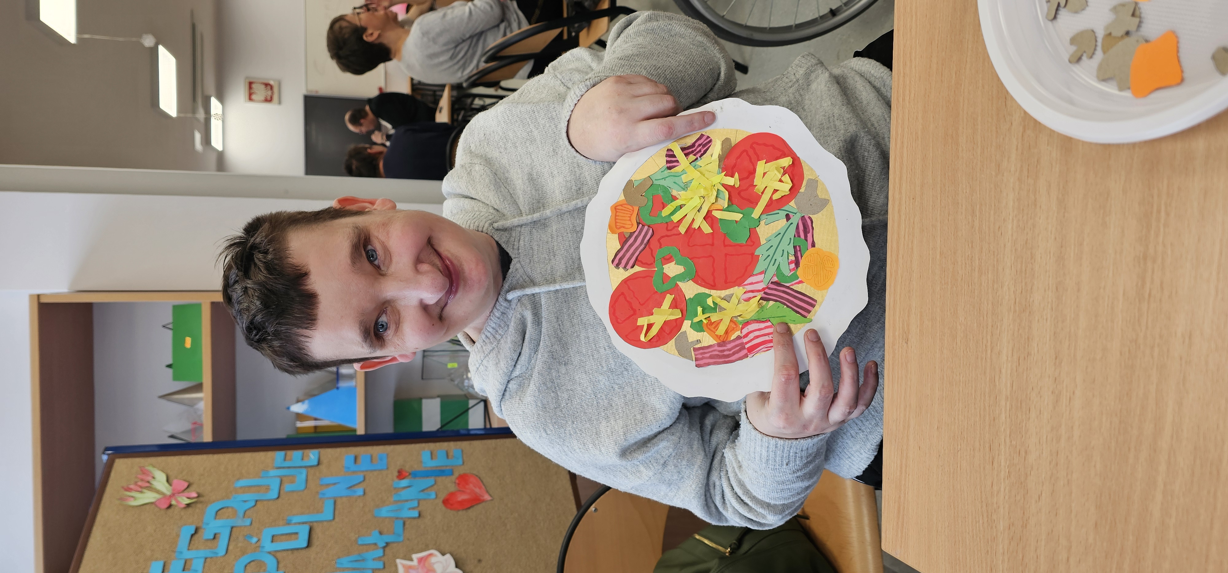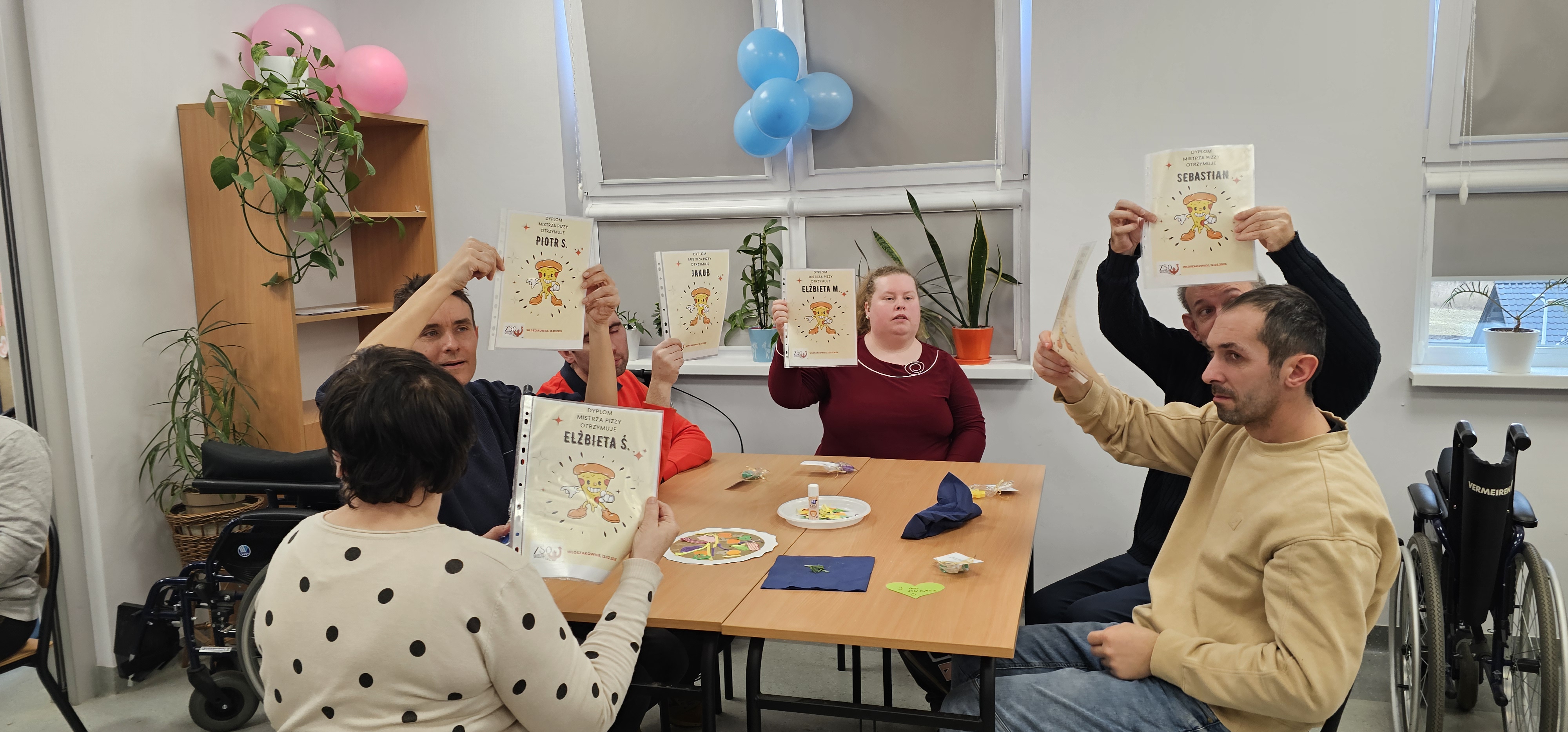 Już od progu zostaliśmy serdecznie powitani i oprowadzeni po placówce, dzięki czemu od razu poczuliśmy się swobodnie i mile widziani. Po zwiedzaniu udaliśmy się do sali lekcyjnej na piętrze, gdzie czekał na nas słodki poczęstunek oraz ulubiona przez wszystkich kawa. W miłej atmosferze rozpoczęliśmy wspólne świętowanie. Każdy z nas otrzymał serduszko ze swoim imieniem, żeby łatwiej było się porozumieć z gospodarzami. Przy wsparciu wolontariuszy bawiliśmy się w komponowanie pizzy przy użyciu elementów z papieru. Po warsztatach plastycznych nastąpiła część artystyczna. Dziewczyny ze Szkoły Podstawowej zachwyciły nas efektownym pokazem akrobatyki sportowej. Dodatkową niespodzianką była autorska piosenka o pizzy, która wywołała uśmiech i gromkie brawa. Po występach razem z wolontariuszami dekorowaliśmy wcześniej przygotowane ciasto różnorodnymi prawdziwymi składnikami, tworząc własne kompozycje smakowe. Następnie nasze pizze trafiły do pieca, a chwilę później na nasze talerze. Smakowały wyśmienicie, zwłaszcza że były przygotowane własnoręcznie. Normalnie palce lizać