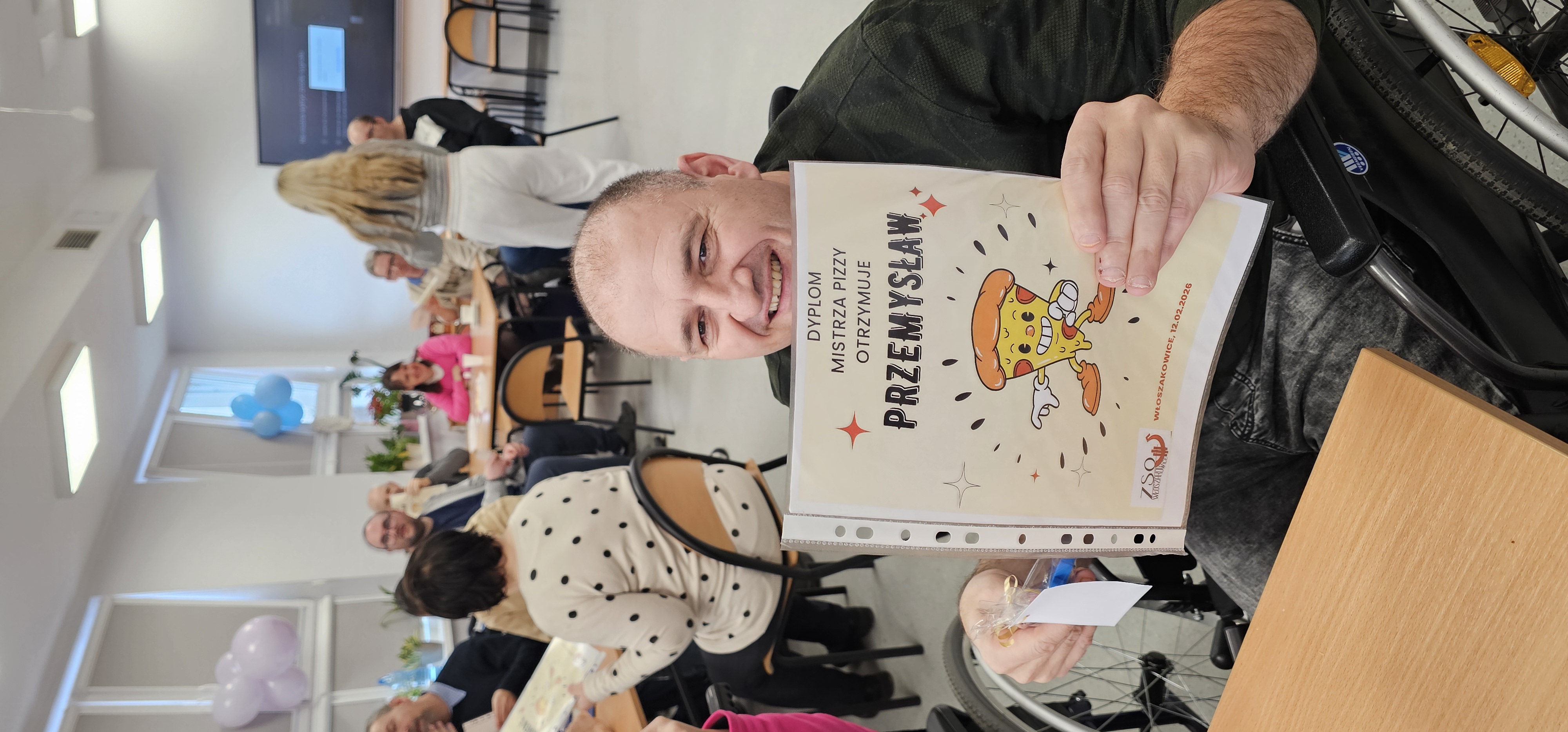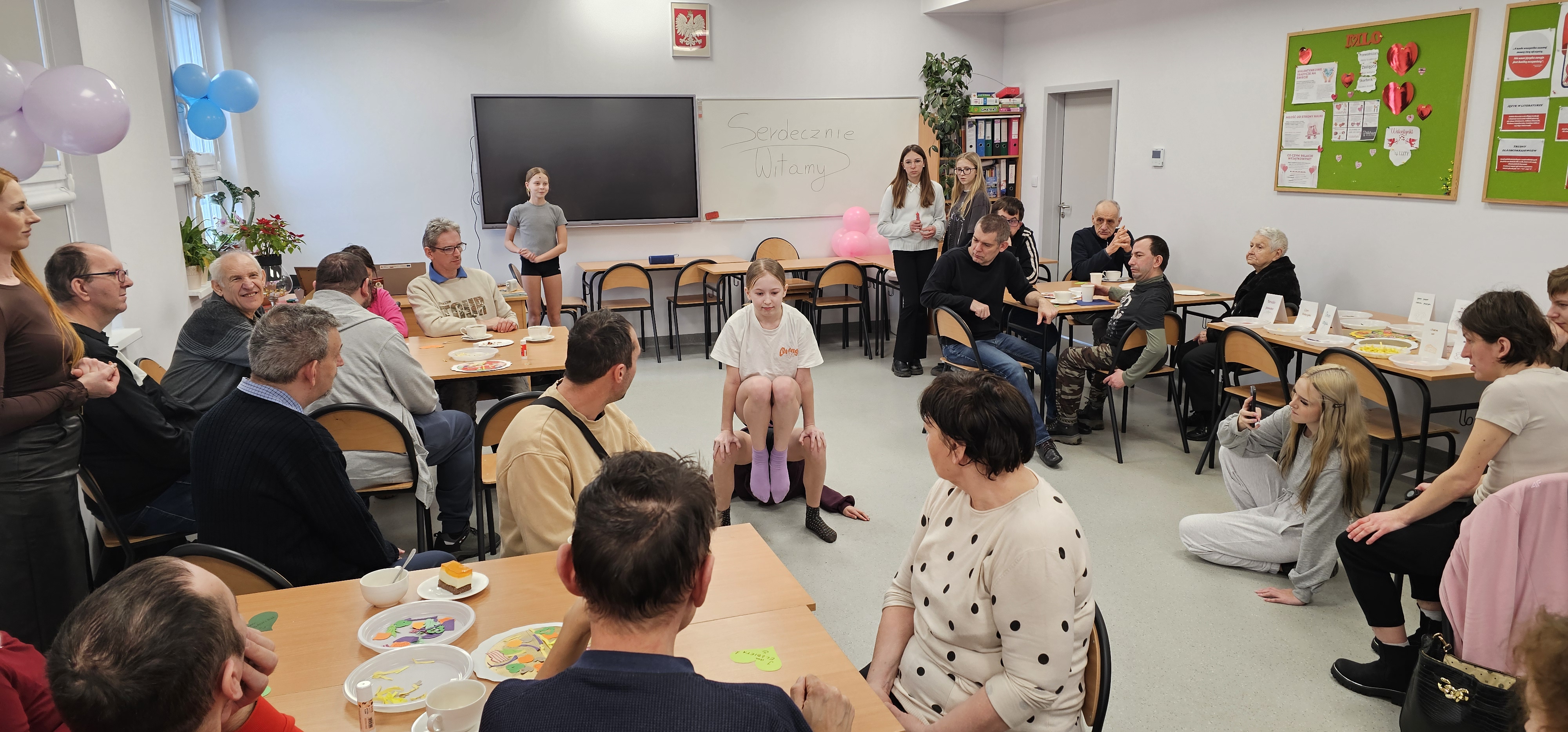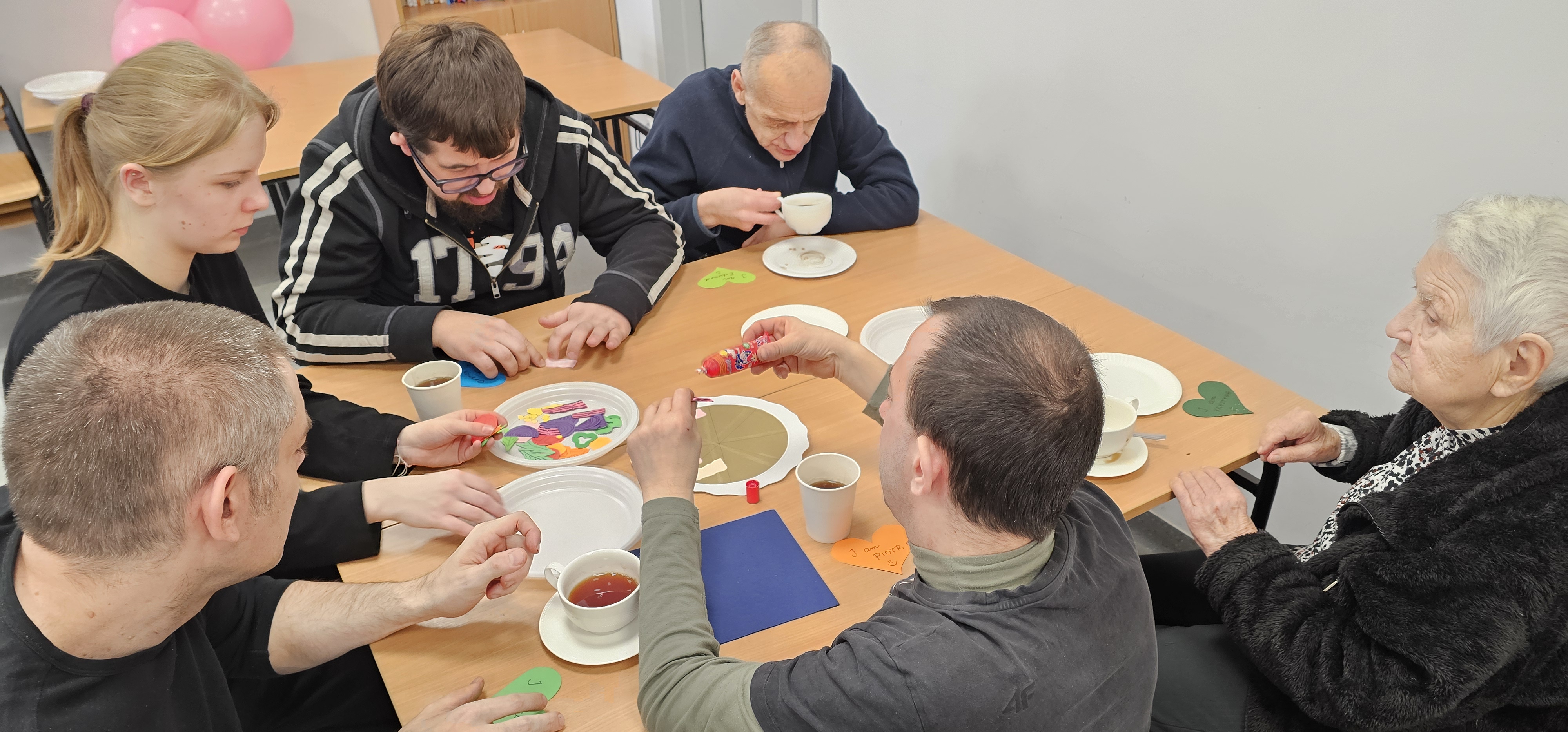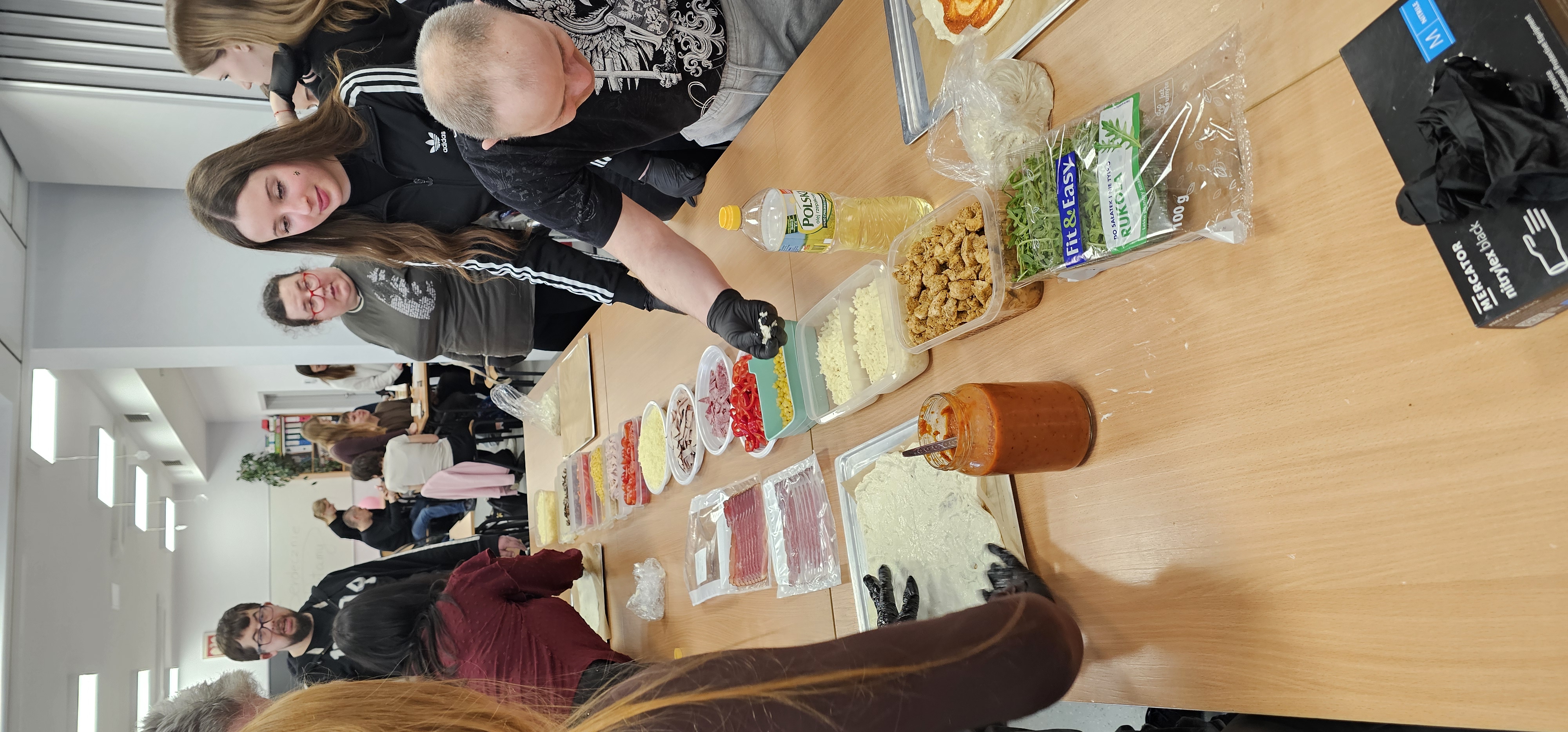 Już od progu zostaliśmy serdecznie powitani i oprowadzeni po placówce, dzięki czemu od razu poczuliśmy się swobodnie i mile widziani. Po zwiedzaniu udaliśmy się do sali lekcyjnej na piętrze, gdzie czekał na nas słodki poczęstunek oraz ulubiona przez wszystkich kawa. W miłej atmosferze rozpoczęliśmy wspólne świętowanie. Każdy z nas otrzymał serduszko ze swoim imieniem, żeby łatwiej było się porozumieć z gospodarzami. Przy wsparciu wolontariuszy bawiliśmy się w komponowanie pizzy przy użyciu elementów z papieru. Po warsztatach plastycznych nastąpiła część artystyczna. Dziewczyny ze Szkoły Podstawowej zachwyciły nas efektownym pokazem akrobatyki sportowej. Dodatkową niespodzianką była autorska piosenka o pizzy, która wywołała uśmiech i gromkie brawa. Po występach razem z wolontariuszami dekorowaliśmy wcześniej przygotowane ciasto różnorodnymi prawdziwymi składnikami, tworząc własne kompozycje smakowe. Następnie nasze pizze trafiły do pieca, a chwilę później na nasze talerze. Smakowały wyśmienicie, zwłaszcza że były przygotowane własnoręcznie. Normalnie palce lizać