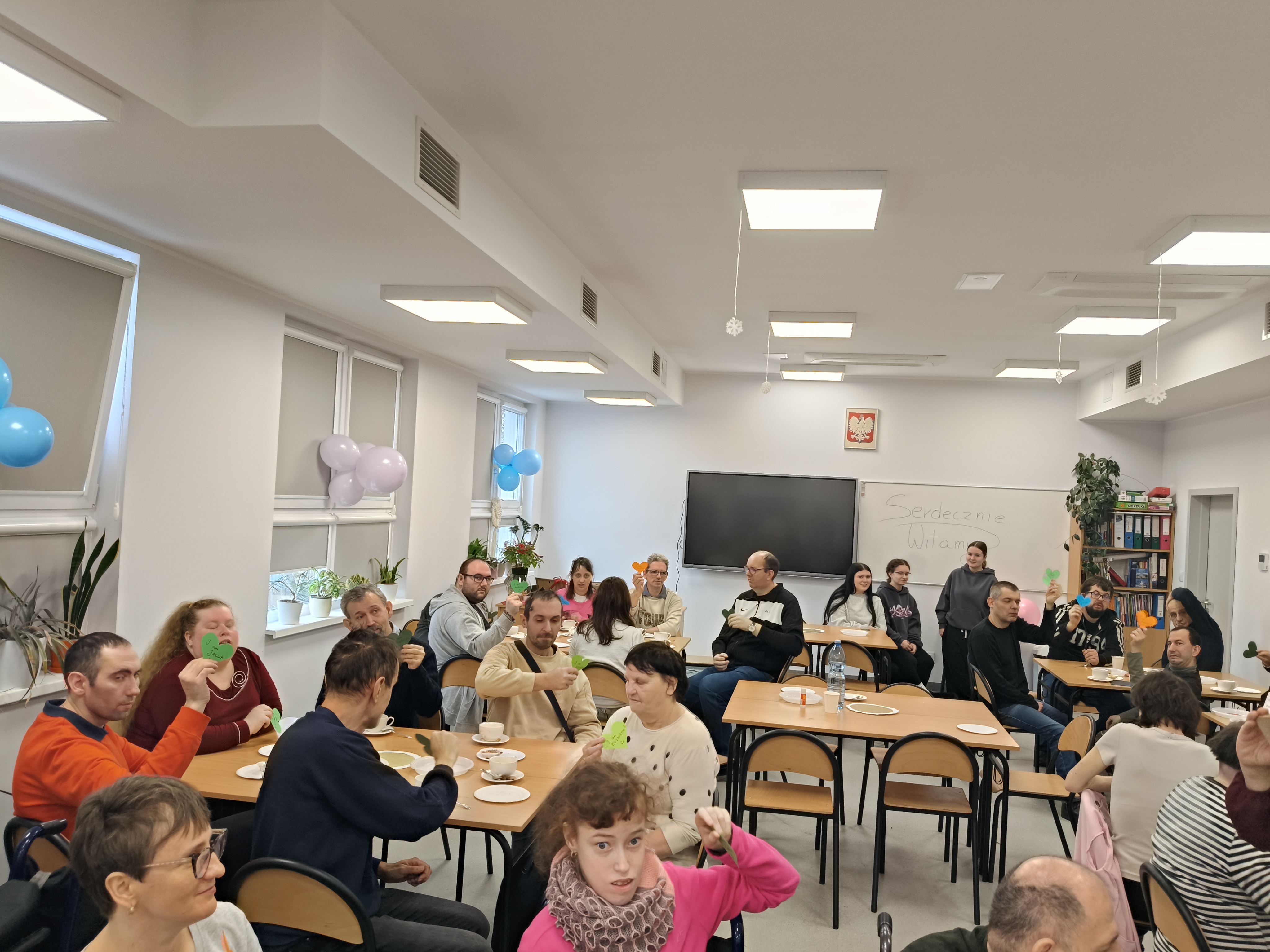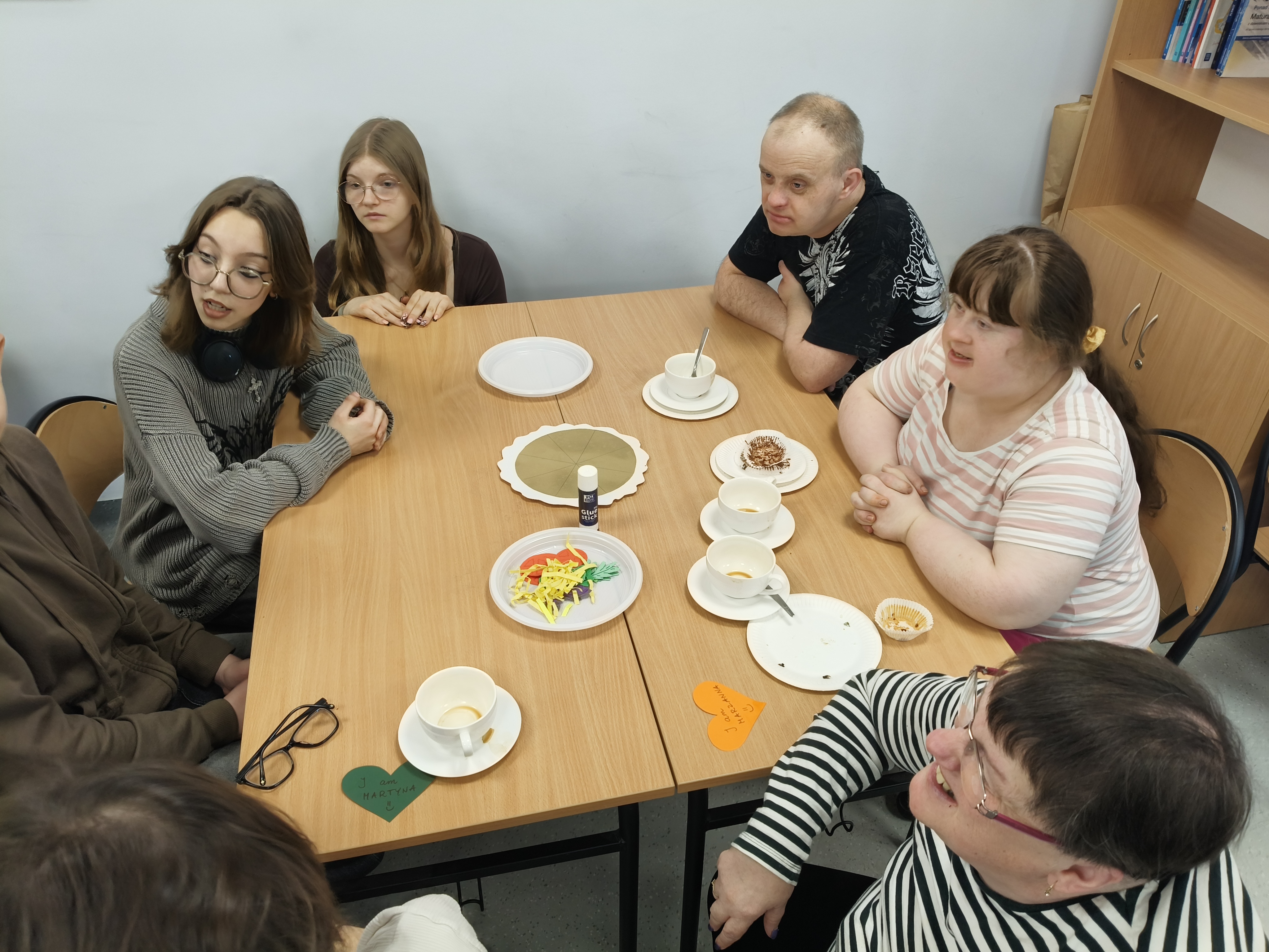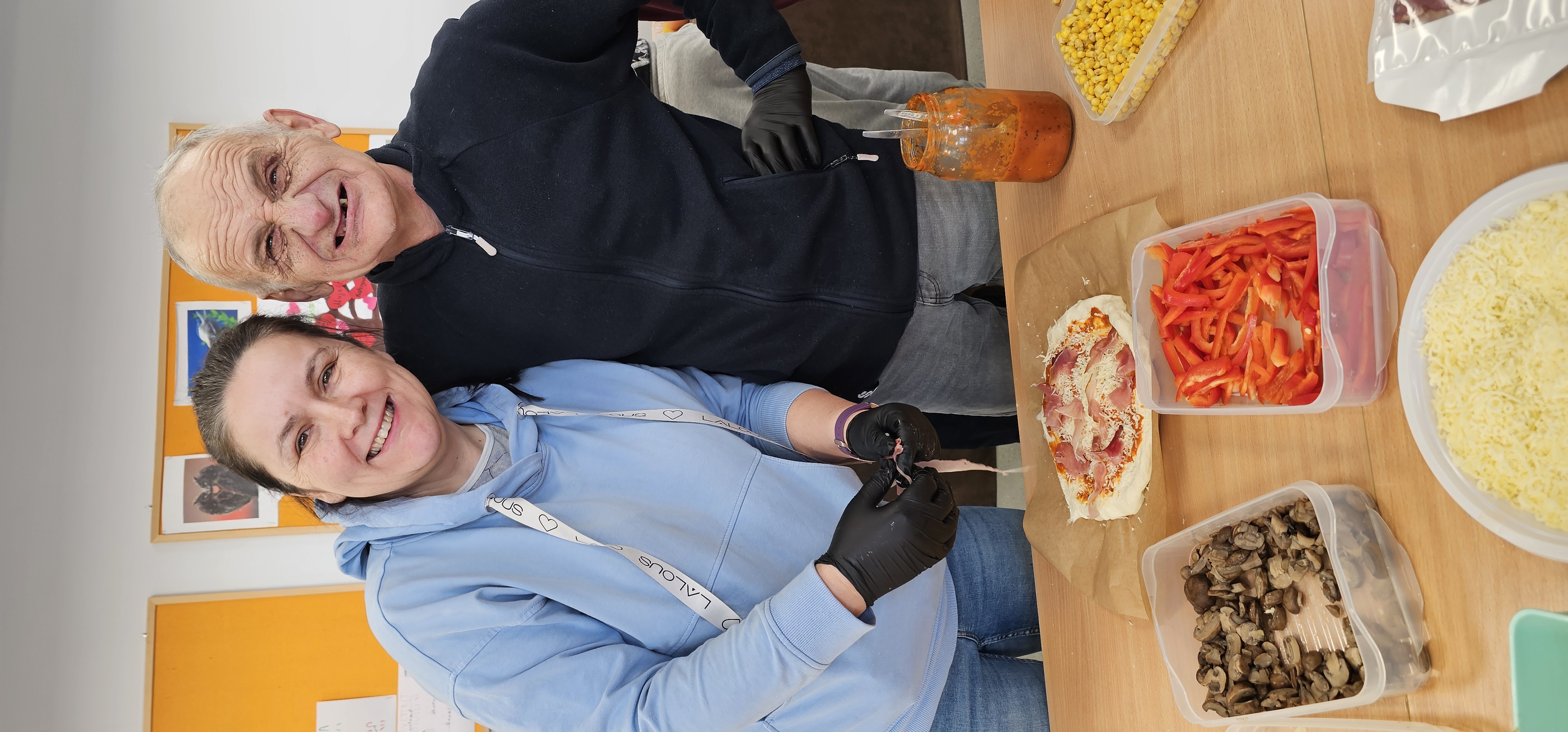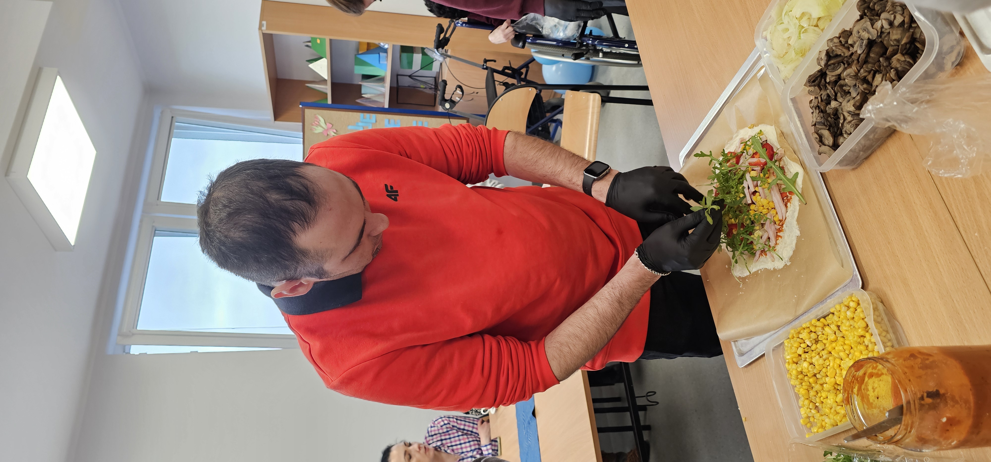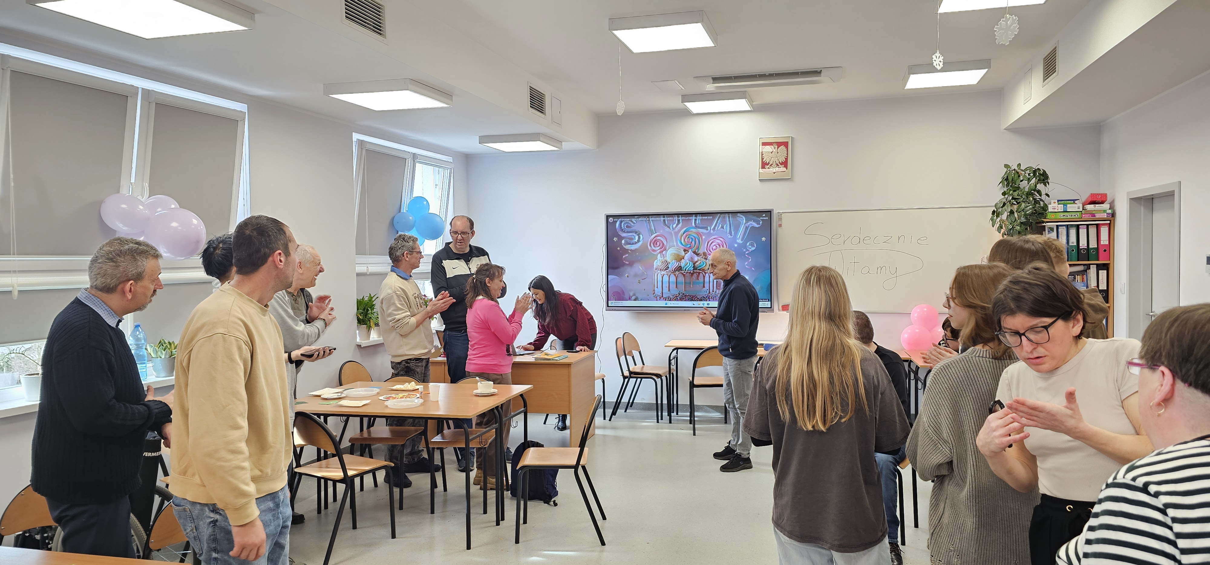 Już od progu zostaliśmy serdecznie powitani i oprowadzeni po placówce, dzięki czemu od razu poczuliśmy się swobodnie i mile widziani. Po zwiedzaniu udaliśmy się do sali lekcyjnej na piętrze, gdzie czekał na nas słodki poczęstunek oraz ulubiona przez wszystkich kawa. W miłej atmosferze rozpoczęliśmy wspólne świętowanie. Każdy z nas otrzymał serduszko ze swoim imieniem, żeby łatwiej było się porozumieć z gospodarzami. Przy wsparciu wolontariuszy bawiliśmy się w komponowanie pizzy przy użyciu elementów z papieru. Po warsztatach plastycznych nastąpiła część artystyczna. Dziewczyny ze Szkoły Podstawowej zachwyciły nas efektownym pokazem akrobatyki sportowej. Dodatkową niespodzianką była autorska piosenka o pizzy, która wywołała uśmiech i gromkie brawa. Po występach razem z wolontariuszami dekorowaliśmy wcześniej przygotowane ciasto różnorodnymi prawdziwymi składnikami, tworząc własne kompozycje smakowe. Następnie nasze pizze trafiły do pieca, a chwilę później na nasze talerze. Smakowały wyśmienicie, zwłaszcza że były przygotowane własnoręcznie. Normalnie palce lizać