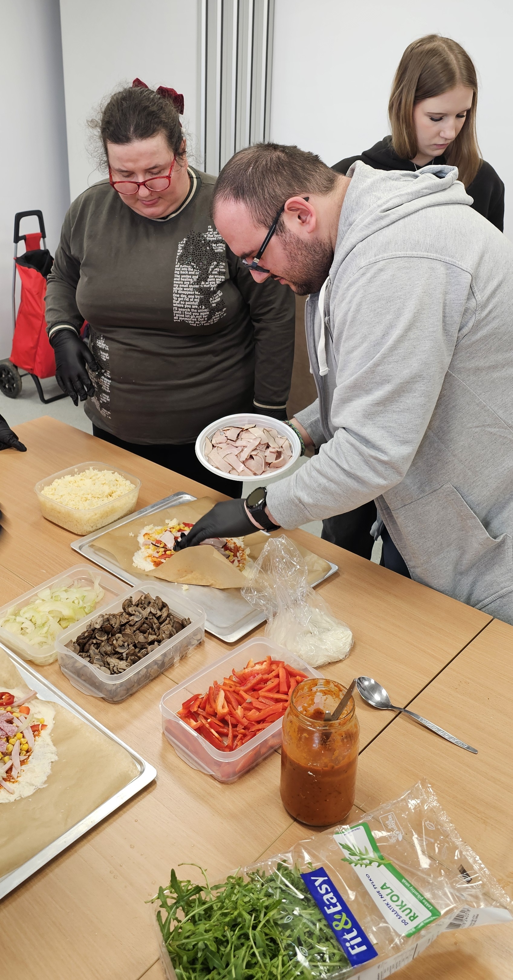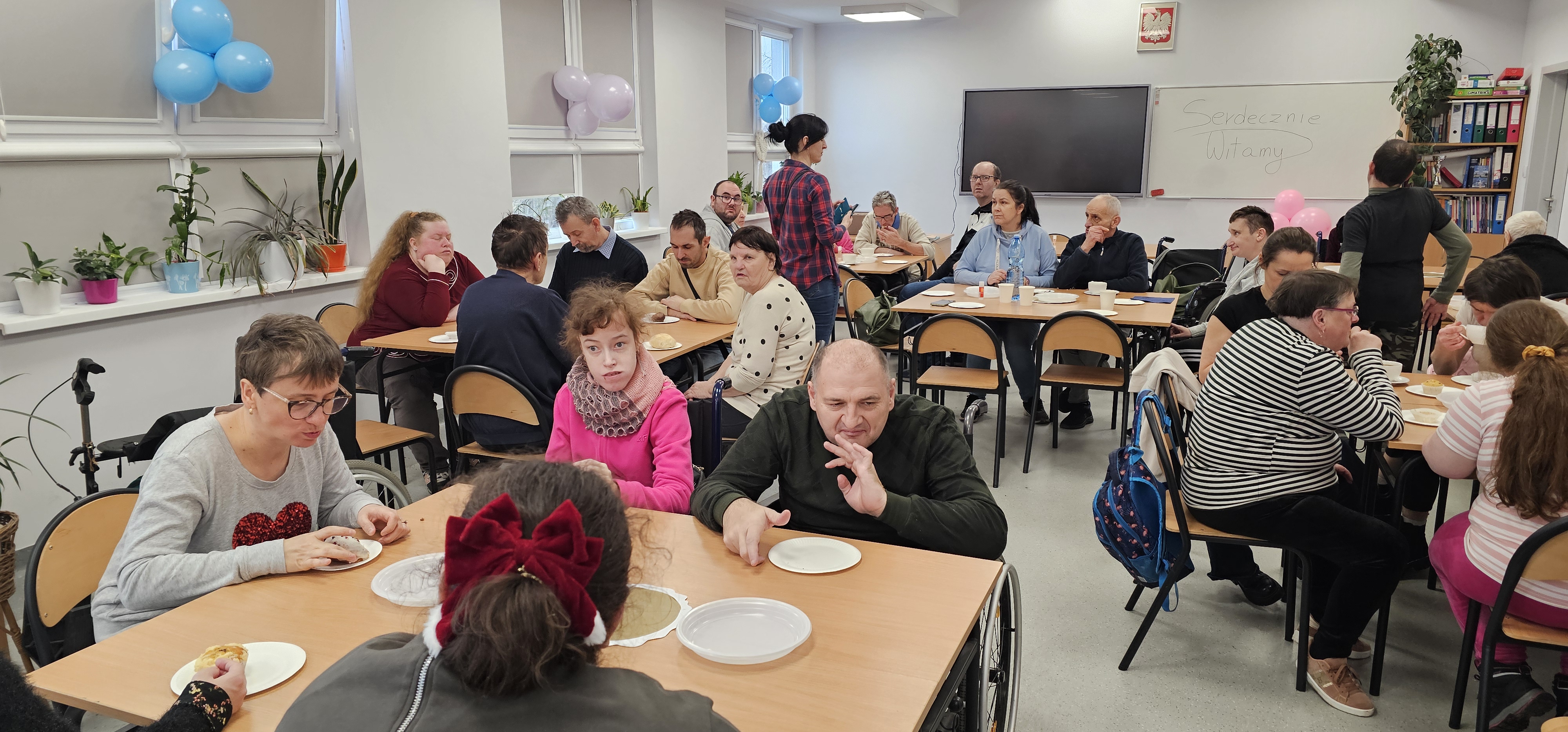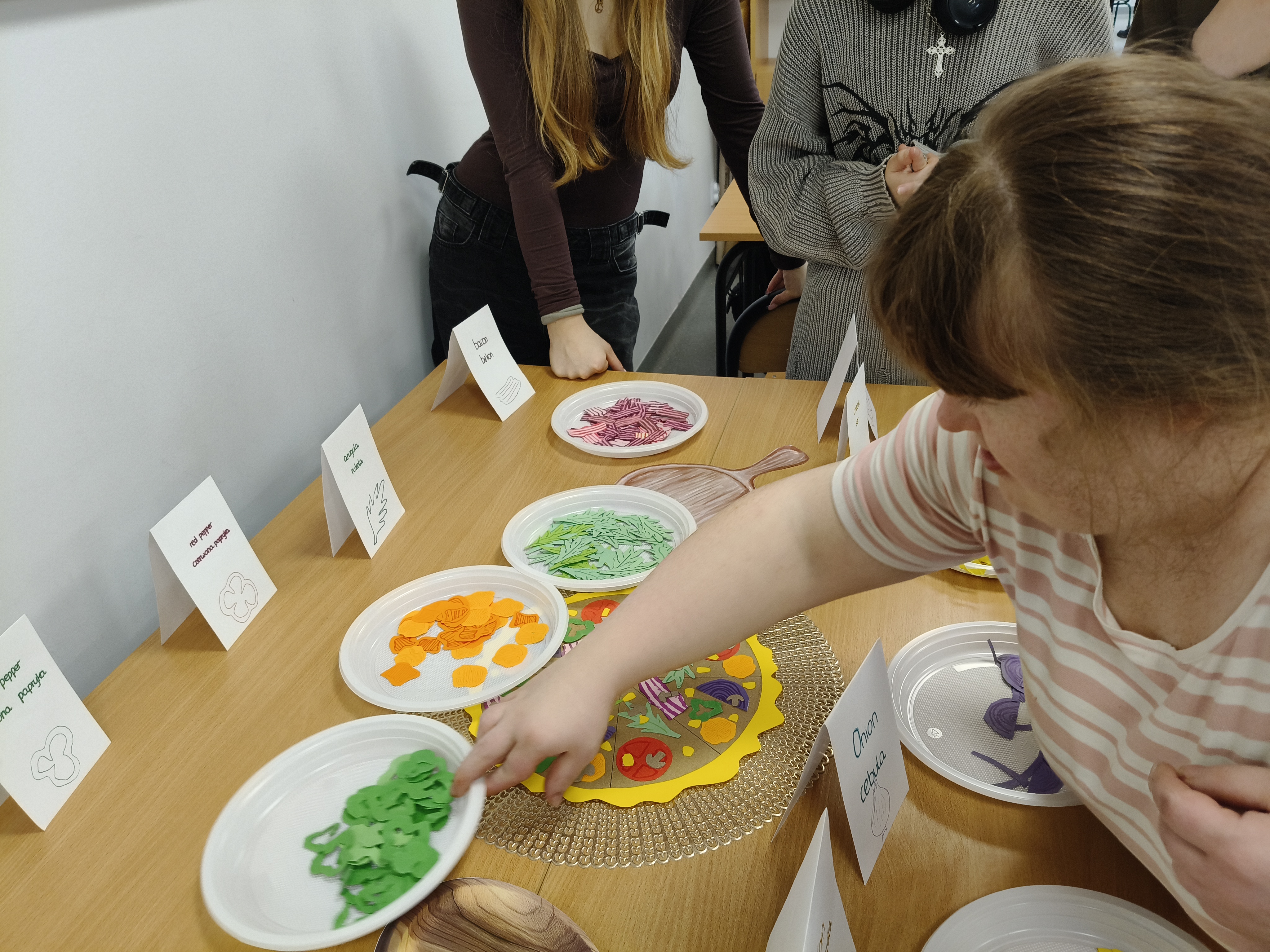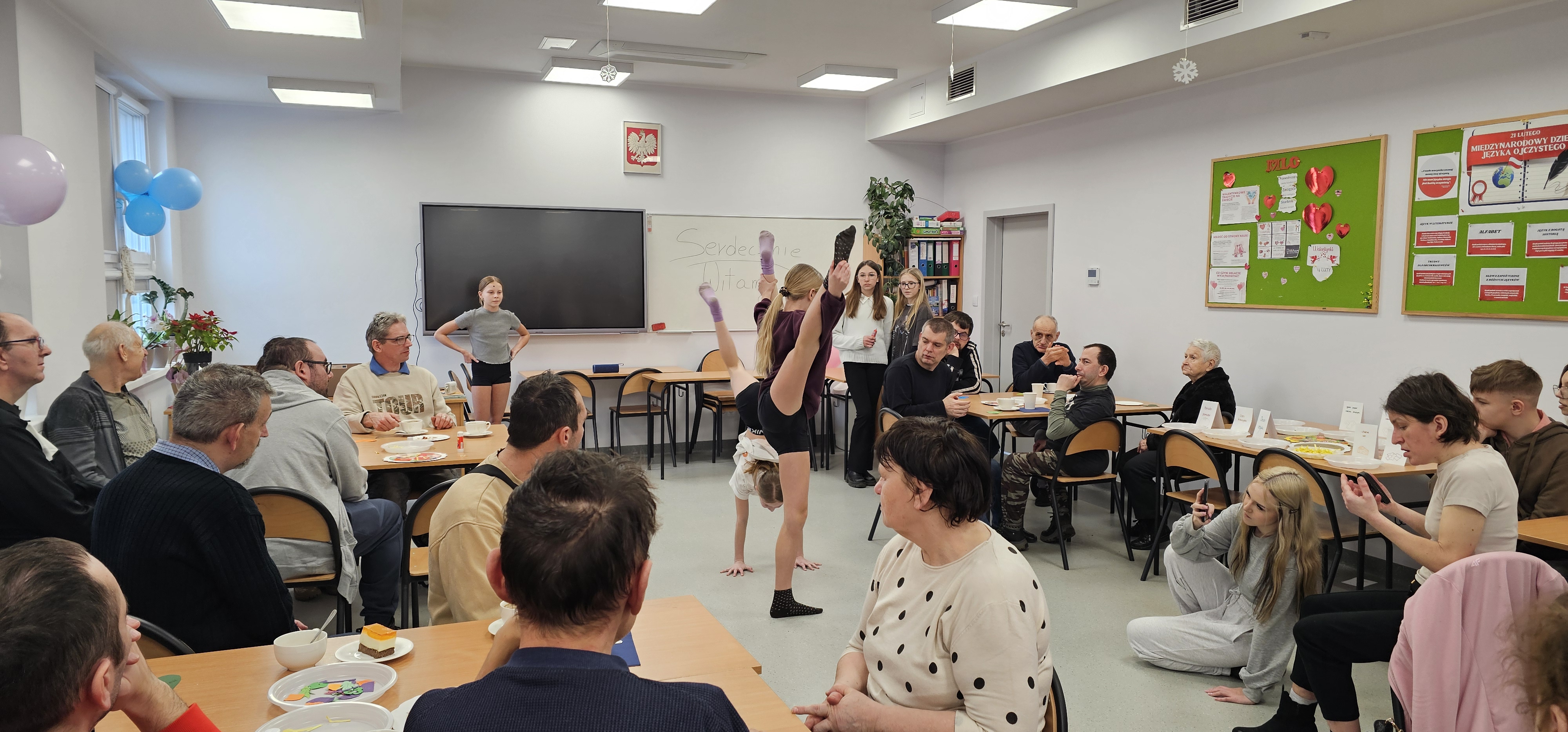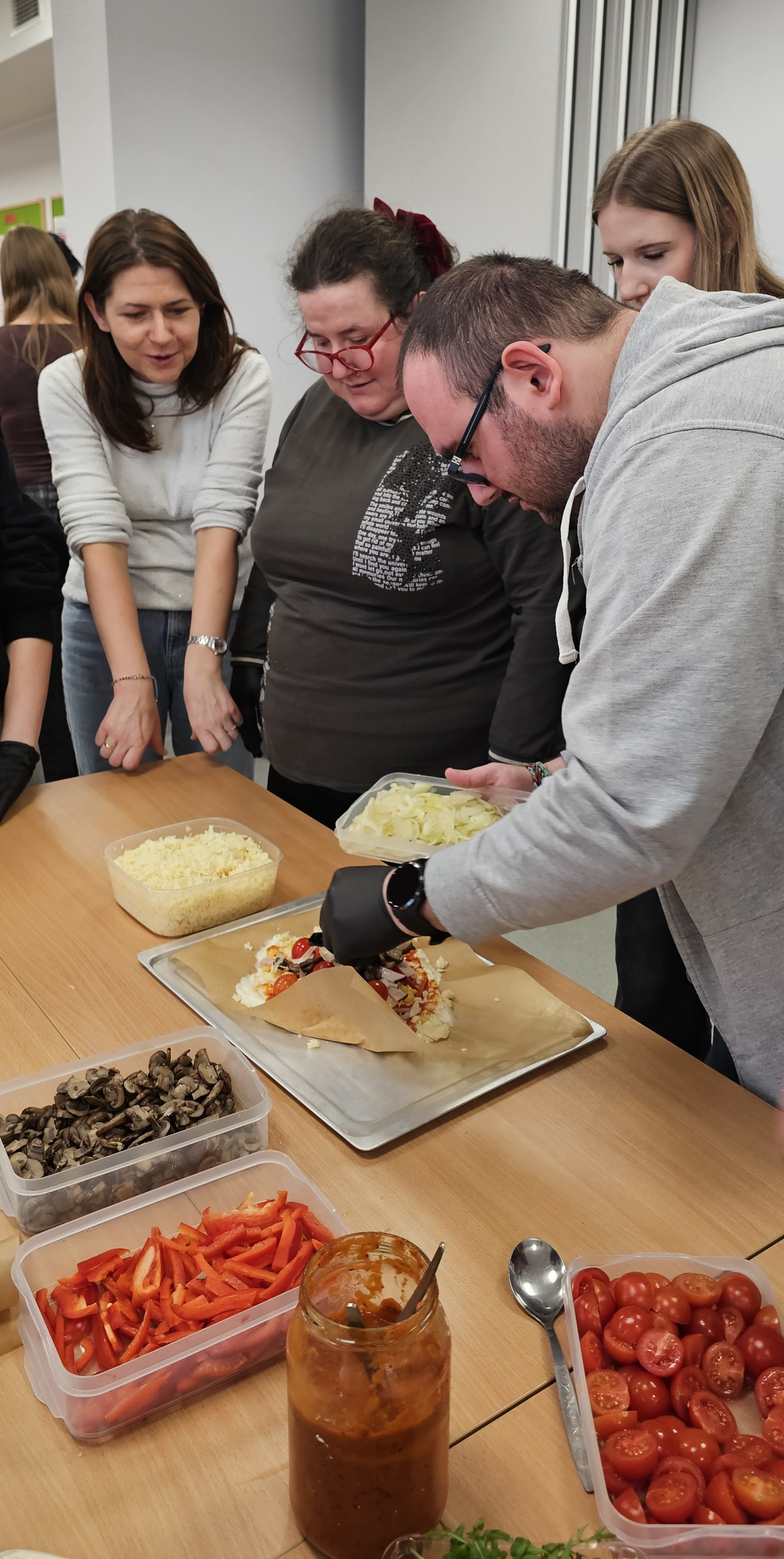 Już od progu zostaliśmy serdecznie powitani i oprowadzeni po placówce, dzięki czemu od razu poczuliśmy się swobodnie i mile widziani. Po zwiedzaniu udaliśmy się do sali lekcyjnej na piętrze, gdzie czekał na nas słodki poczęstunek oraz ulubiona przez wszystkich kawa. W miłej atmosferze rozpoczęliśmy wspólne świętowanie. Każdy z nas otrzymał serduszko ze swoim imieniem, żeby łatwiej było się porozumieć z gospodarzami. Przy wsparciu wolontariuszy bawiliśmy się w komponowanie pizzy przy użyciu elementów z papieru. Po warsztatach plastycznych nastąpiła część artystyczna. Dziewczyny ze Szkoły Podstawowej zachwyciły nas efektownym pokazem akrobatyki sportowej. Dodatkową niespodzianką była autorska piosenka o pizzy, która wywołała uśmiech i gromkie brawa. Po występach razem z wolontariuszami dekorowaliśmy wcześniej przygotowane ciasto różnorodnymi prawdziwymi składnikami, tworząc własne kompozycje smakowe. Następnie nasze pizze trafiły do pieca, a chwilę później na nasze talerze. Smakowały wyśmienicie, zwłaszcza że były przygotowane własnoręcznie. Normalnie palce lizać