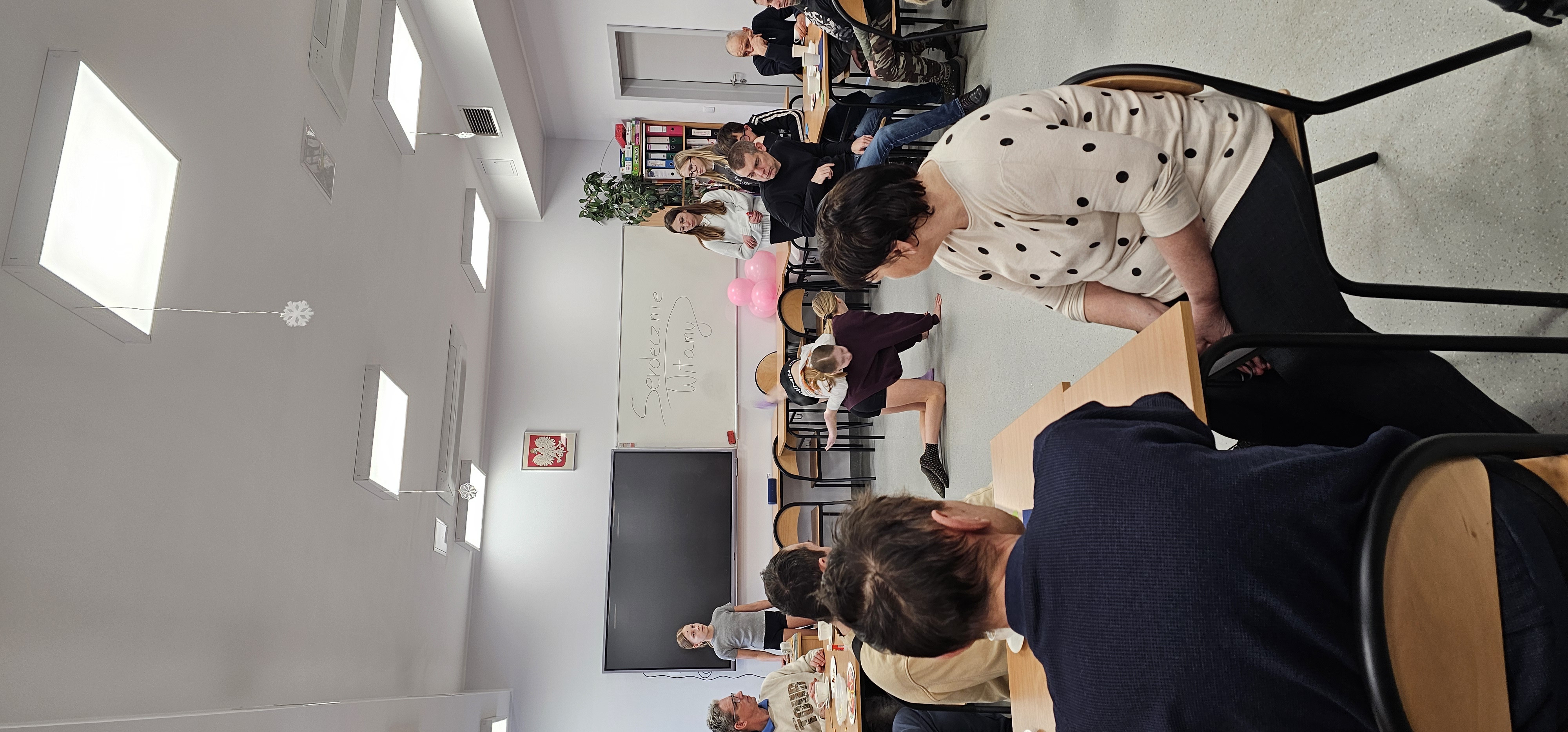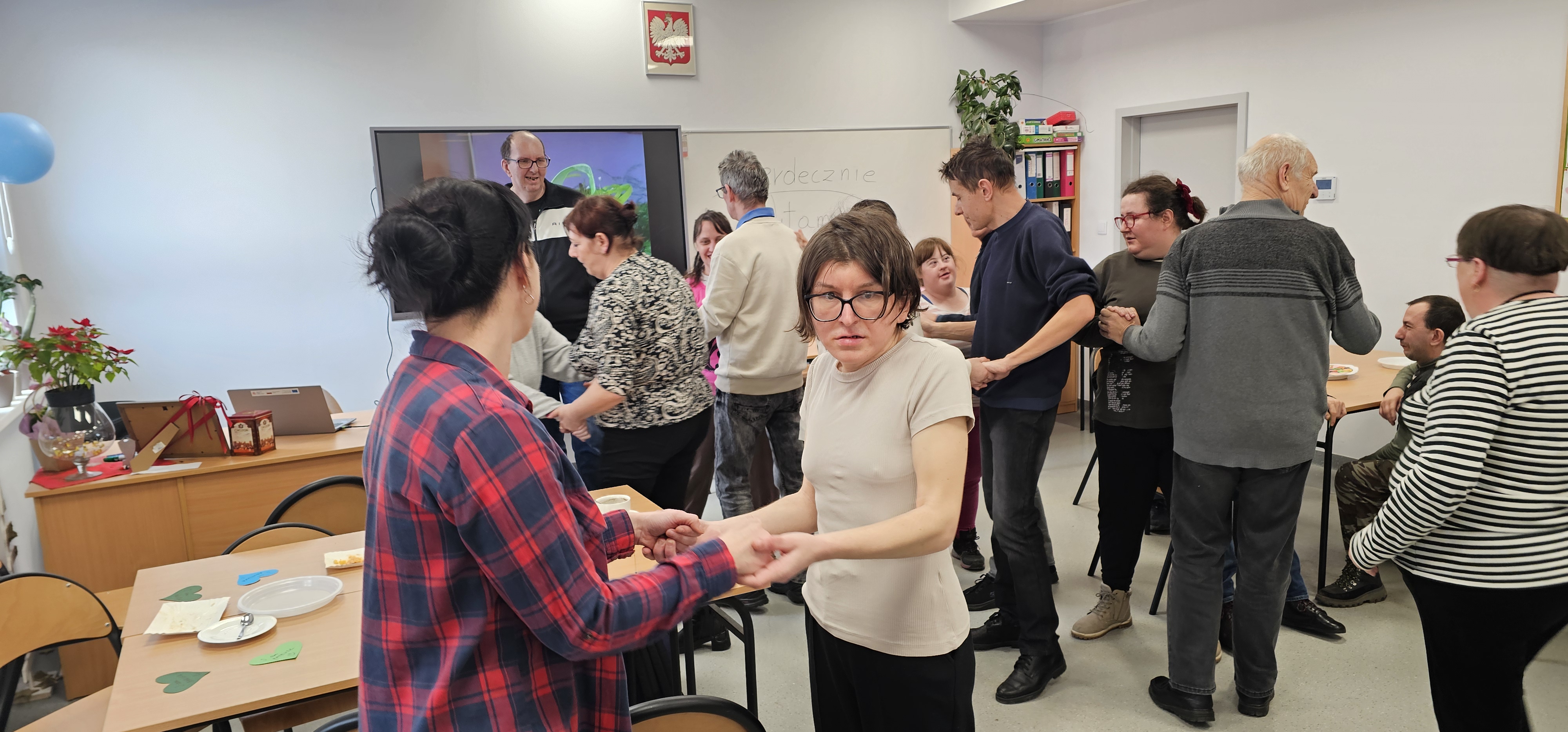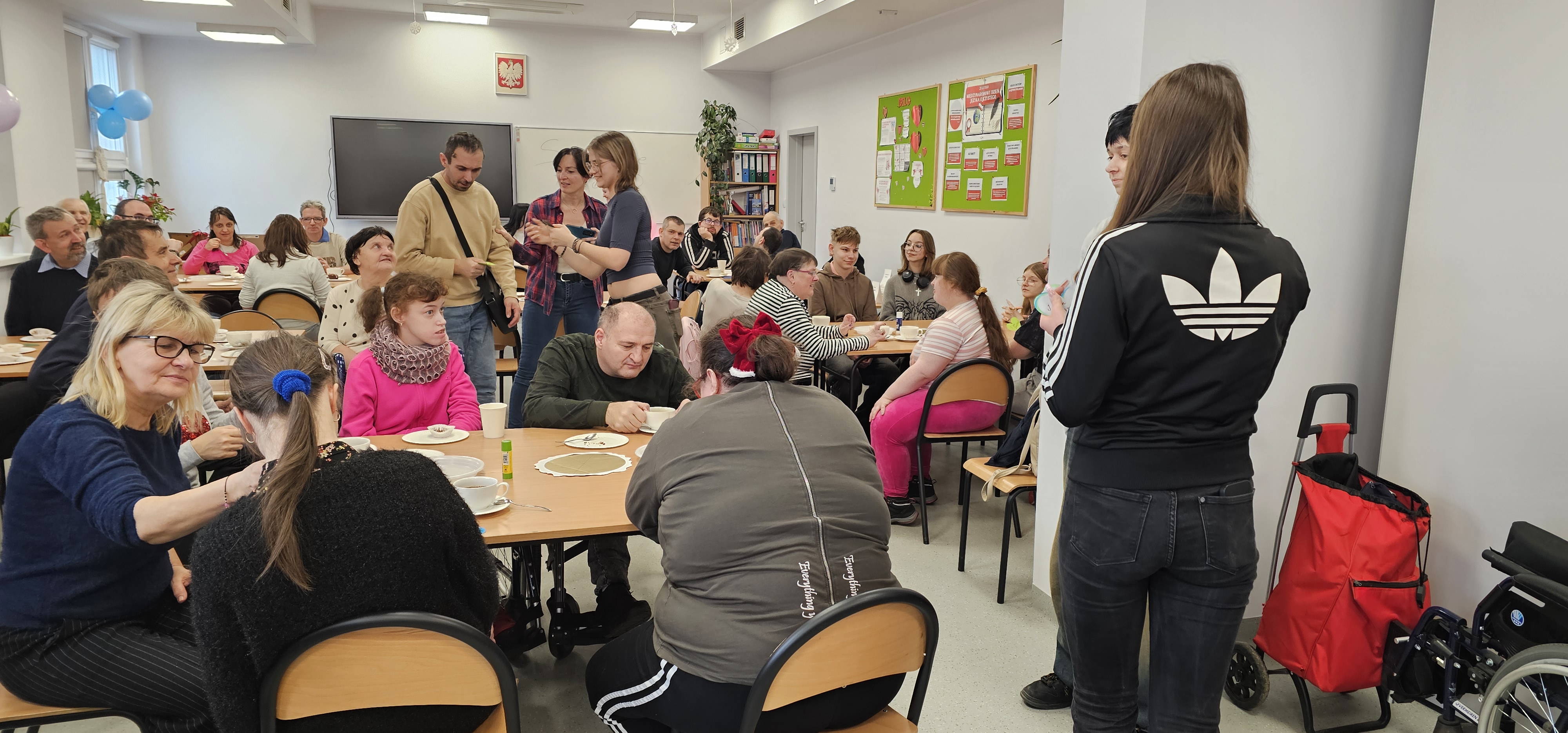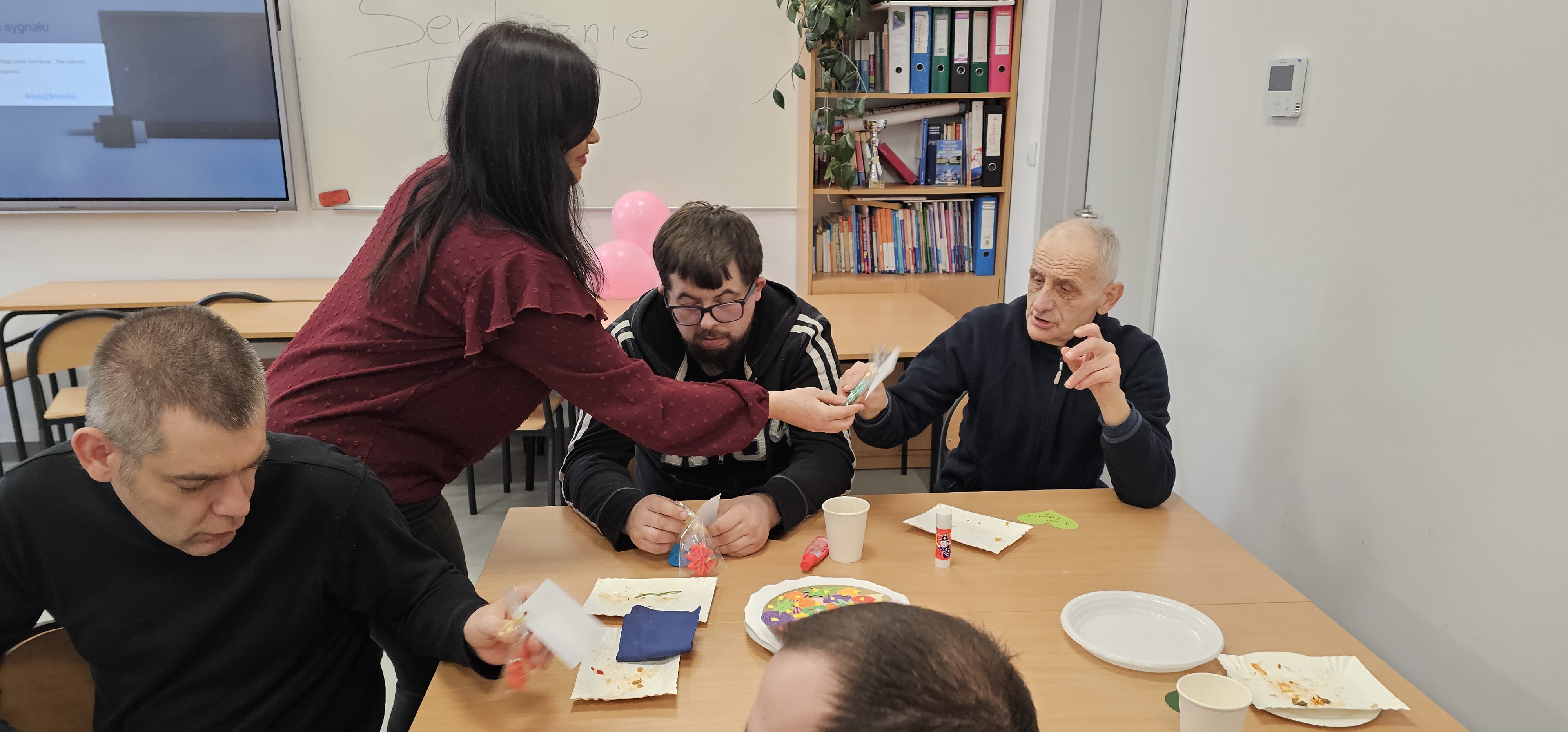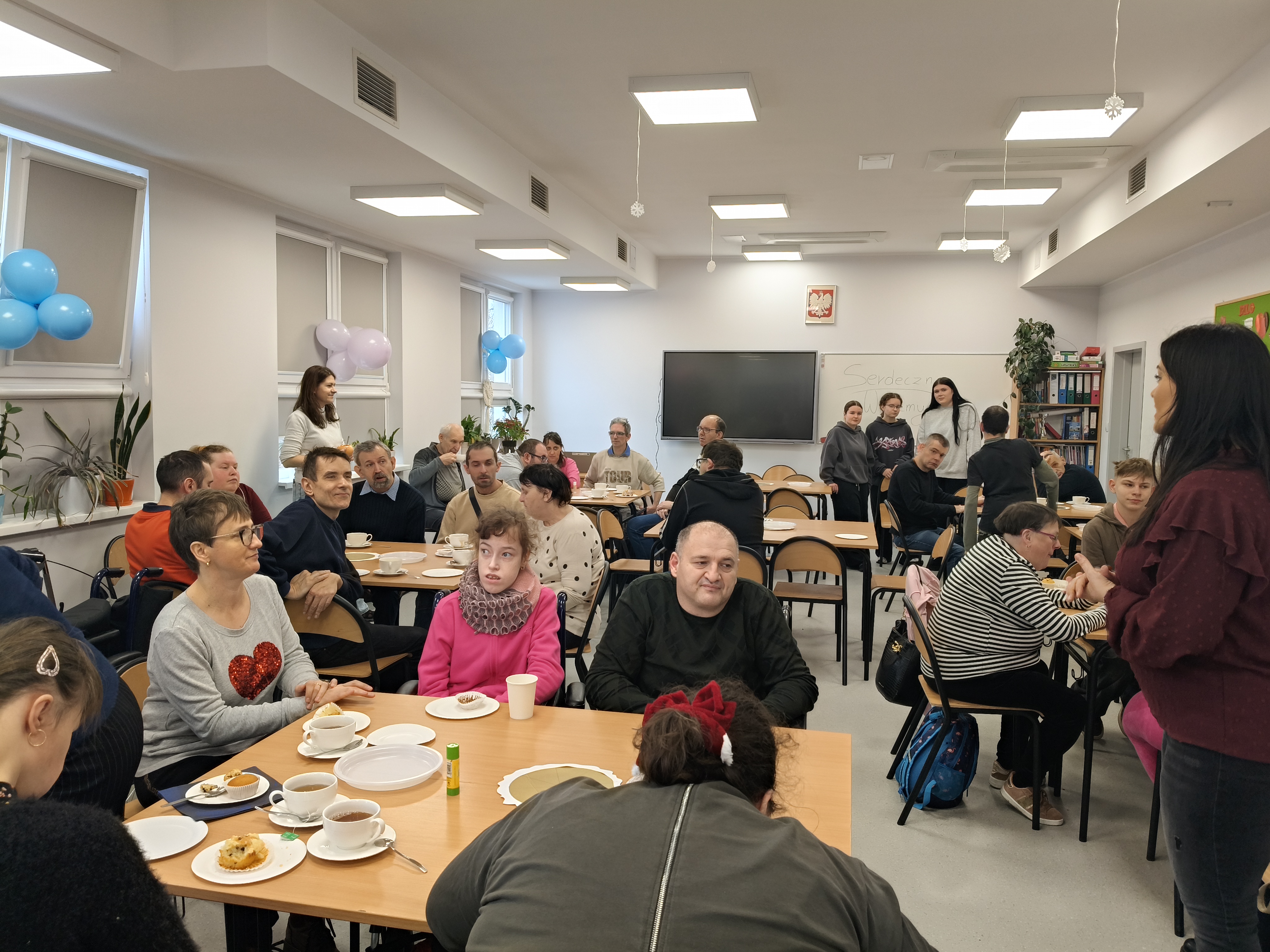 Już od progu zostaliśmy serdecznie powitani i oprowadzeni po placówce, dzięki czemu od razu poczuliśmy się swobodnie i mile widziani. Po zwiedzaniu udaliśmy się do sali lekcyjnej na piętrze, gdzie czekał na nas słodki poczęstunek oraz ulubiona przez wszystkich kawa. W miłej atmosferze rozpoczęliśmy wspólne świętowanie. Każdy z nas otrzymał serduszko ze swoim imieniem, żeby łatwiej było się porozumieć z gospodarzami. Przy wsparciu wolontariuszy bawiliśmy się w komponowanie pizzy przy użyciu elementów z papieru. Po warsztatach plastycznych nastąpiła część artystyczna. Dziewczyny ze Szkoły Podstawowej zachwyciły nas efektownym pokazem akrobatyki sportowej. Dodatkową niespodzianką była autorska piosenka o pizzy, która wywołała uśmiech i gromkie brawa. Po występach razem z wolontariuszami dekorowaliśmy wcześniej przygotowane ciasto różnorodnymi prawdziwymi składnikami, tworząc własne kompozycje smakowe. Następnie nasze pizze trafiły do pieca, a chwilę później na nasze talerze. Smakowały wyśmienicie, zwłaszcza że były przygotowane własnoręcznie. Normalnie palce lizać