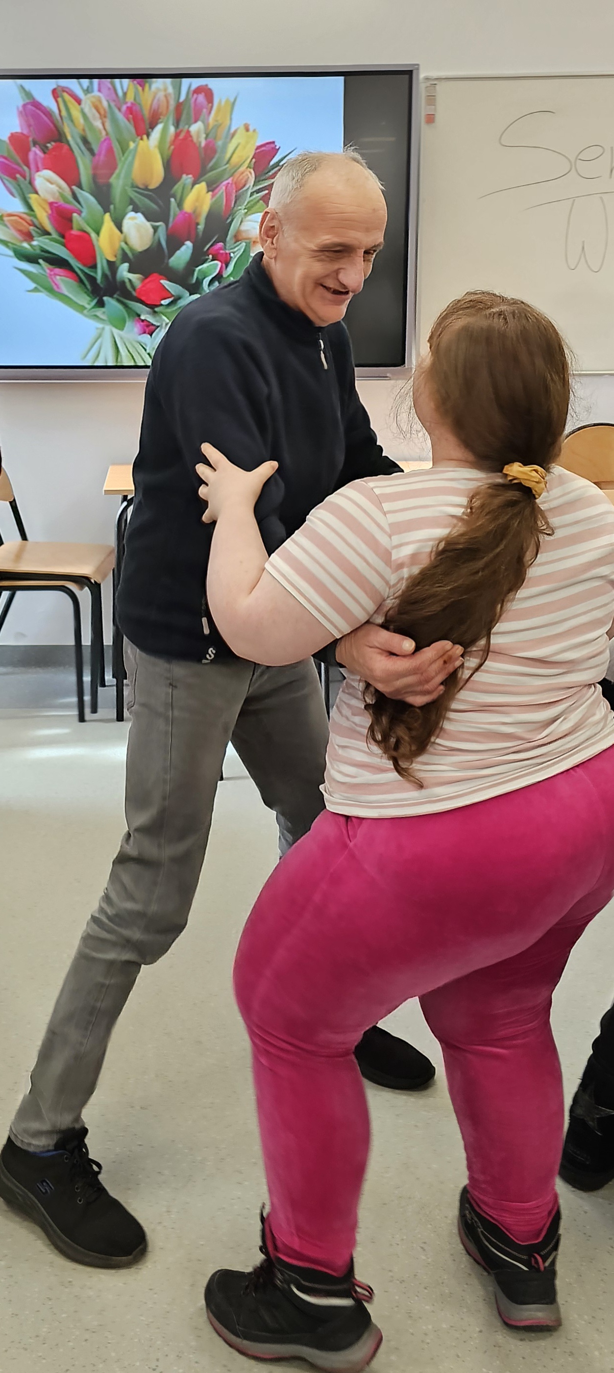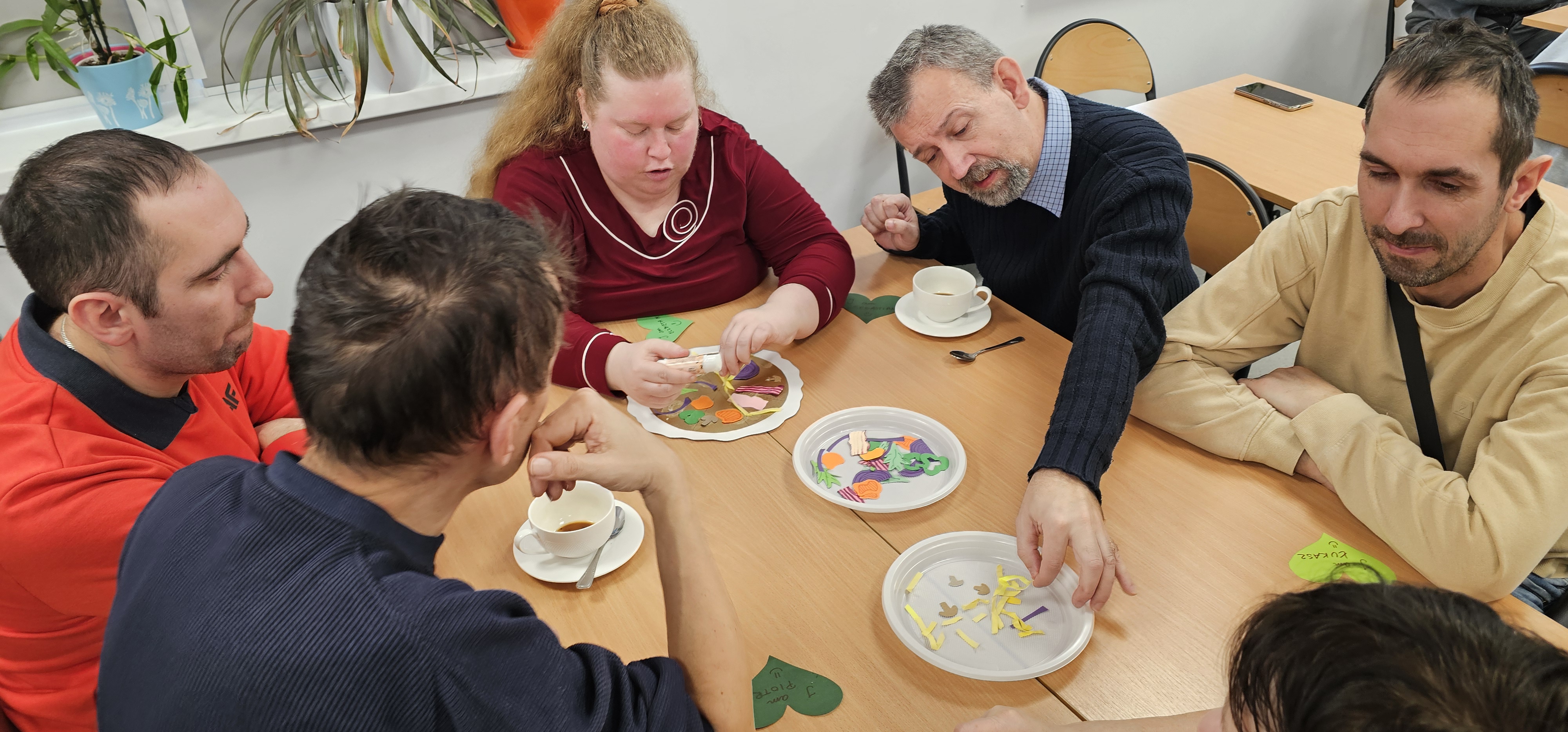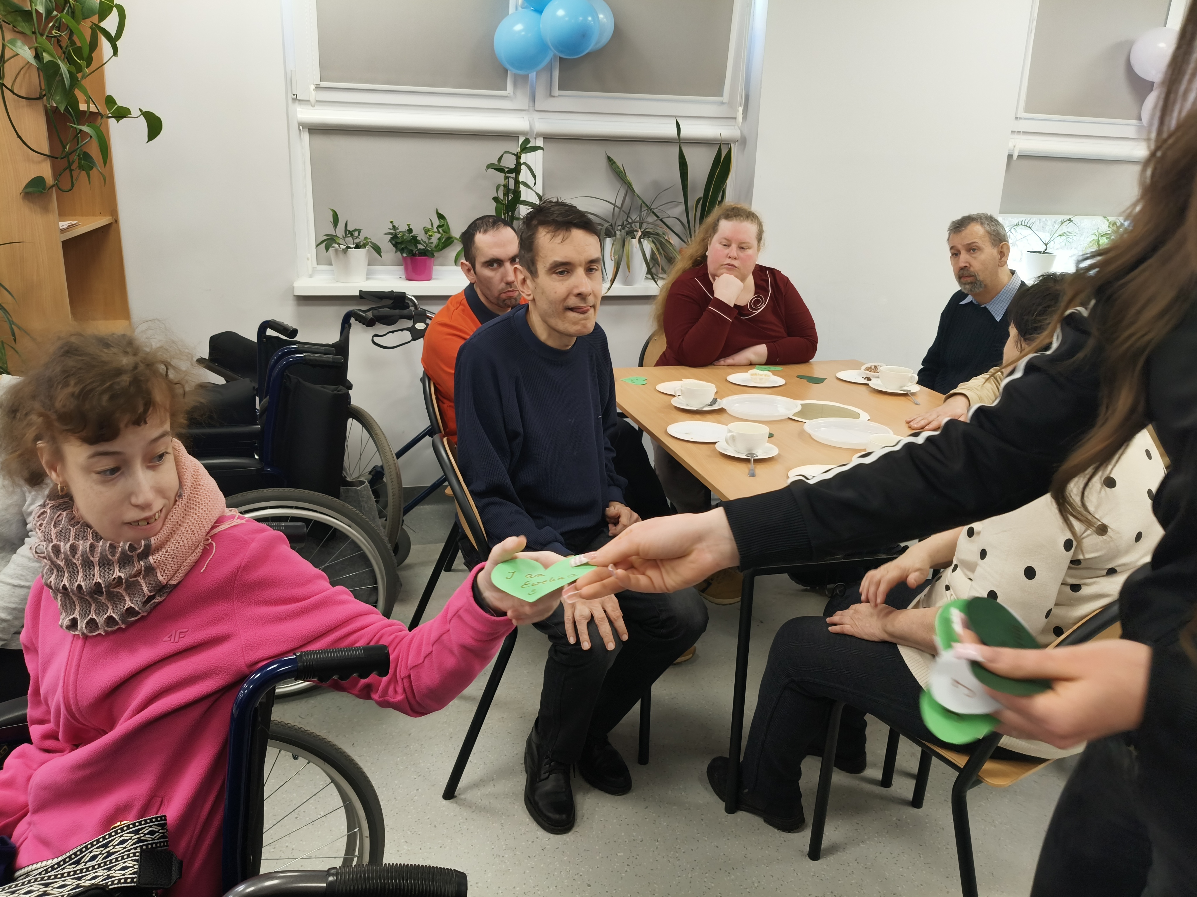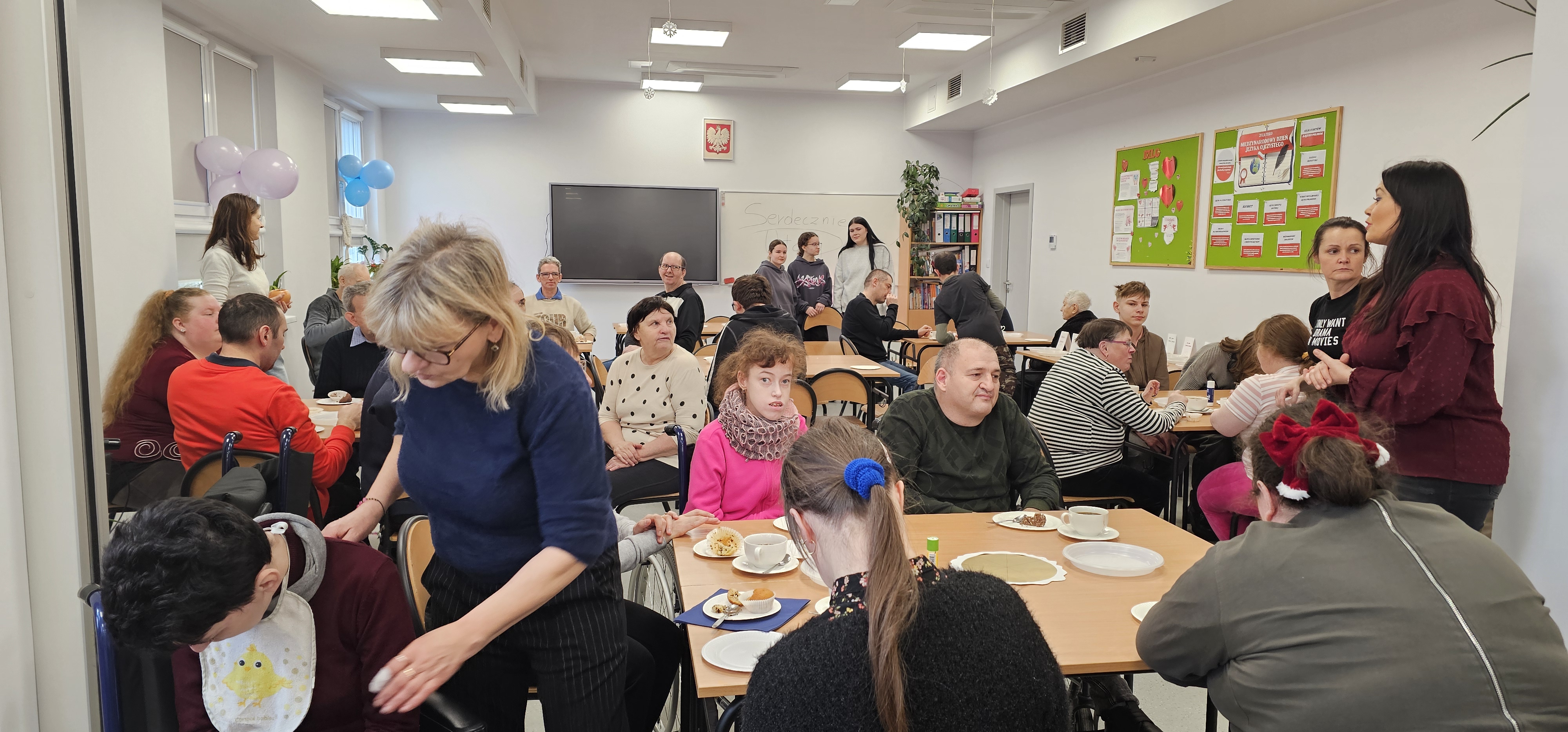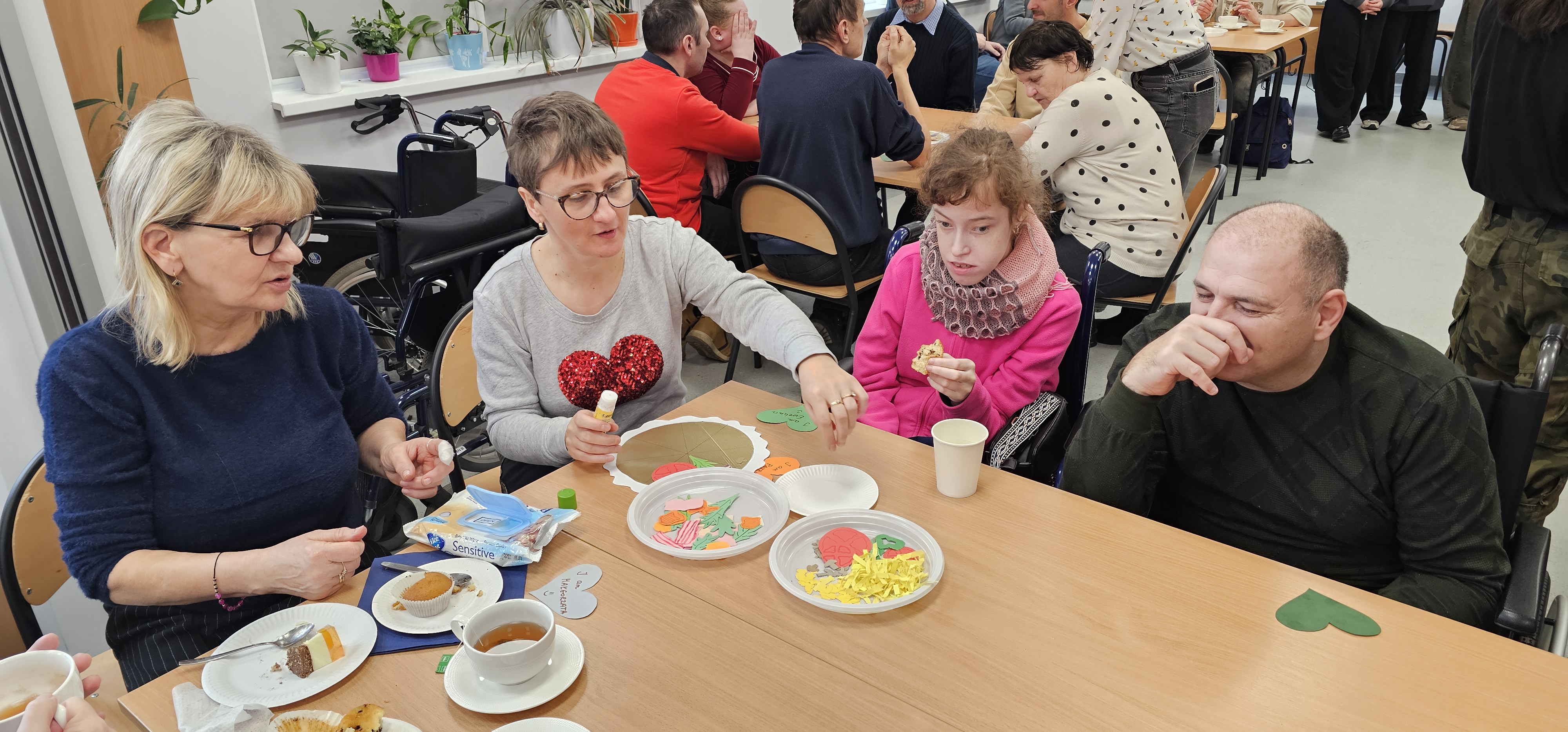 Już od progu zostaliśmy serdecznie powitani i oprowadzeni po placówce, dzięki czemu od razu poczuliśmy się swobodnie i mile widziani. Po zwiedzaniu udaliśmy się do sali lekcyjnej na piętrze, gdzie czekał na nas słodki poczęstunek oraz ulubiona przez wszystkich kawa. W miłej atmosferze rozpoczęliśmy wspólne świętowanie. Każdy z nas otrzymał serduszko ze swoim imieniem, żeby łatwiej było się porozumieć z gospodarzami. Przy wsparciu wolontariuszy bawiliśmy się w komponowanie pizzy przy użyciu elementów z papieru. Po warsztatach plastycznych nastąpiła część artystyczna. Dziewczyny ze Szkoły Podstawowej zachwyciły nas efektownym pokazem akrobatyki sportowej. Dodatkową niespodzianką była autorska piosenka o pizzy, która wywołała uśmiech i gromkie brawa. Po występach razem z wolontariuszami dekorowaliśmy wcześniej przygotowane ciasto różnorodnymi prawdziwymi składnikami, tworząc własne kompozycje smakowe. Następnie nasze pizze trafiły do pieca, a chwilę później na nasze talerze. Smakowały wyśmienicie, zwłaszcza że były przygotowane własnoręcznie. Normalnie palce lizać
