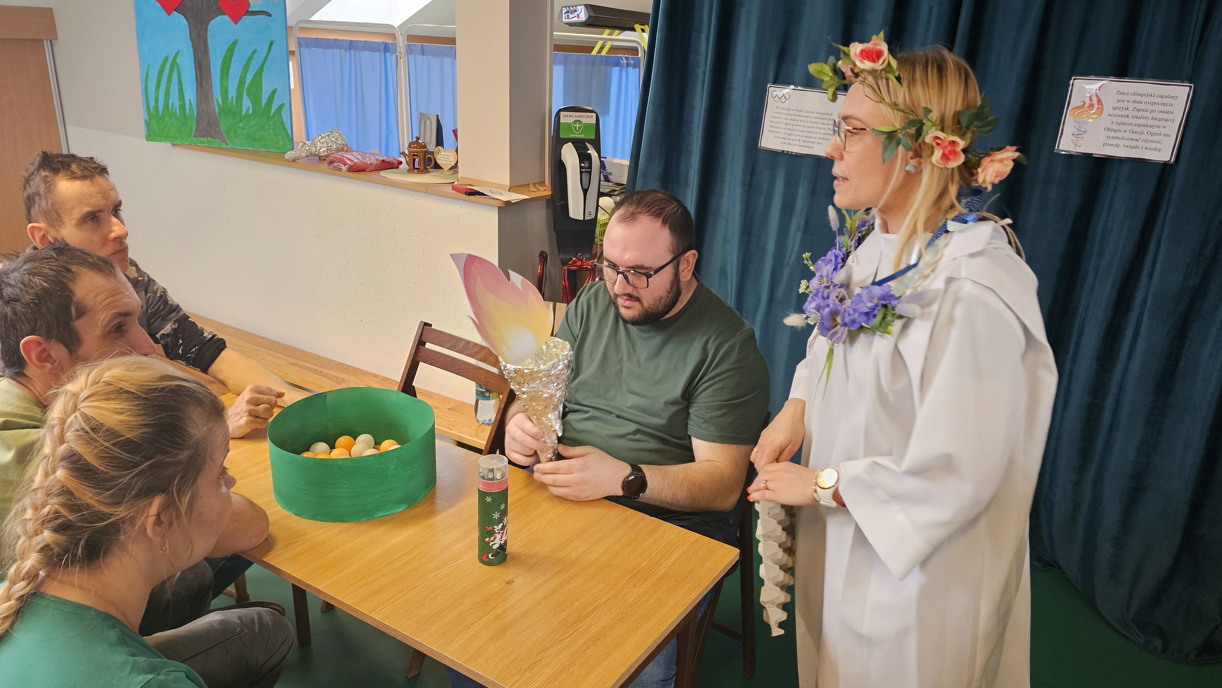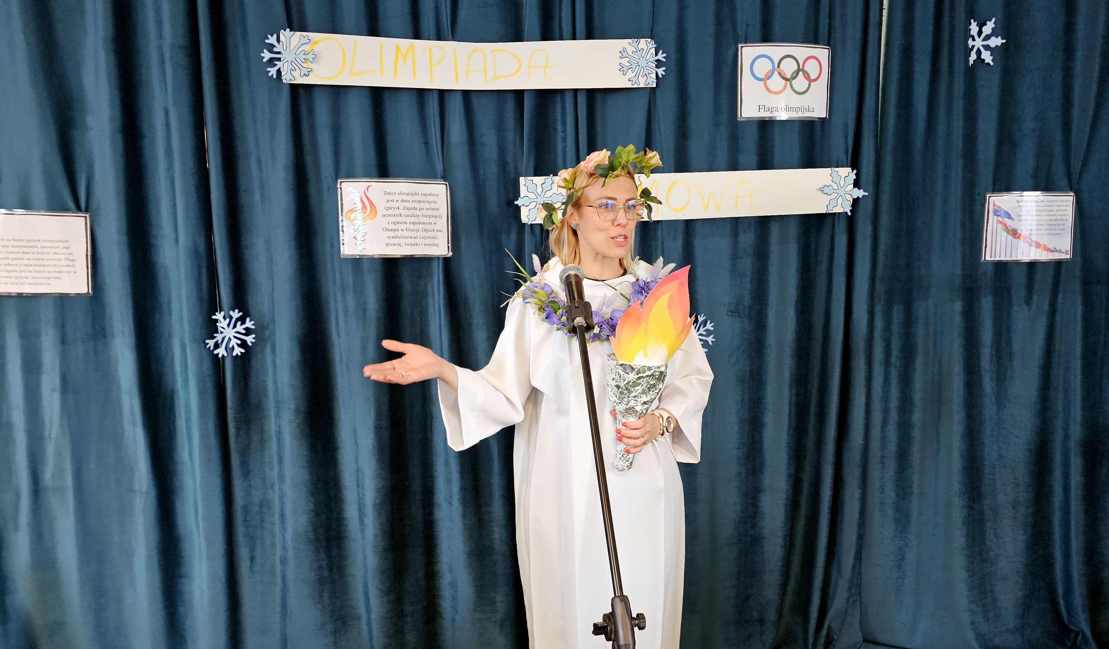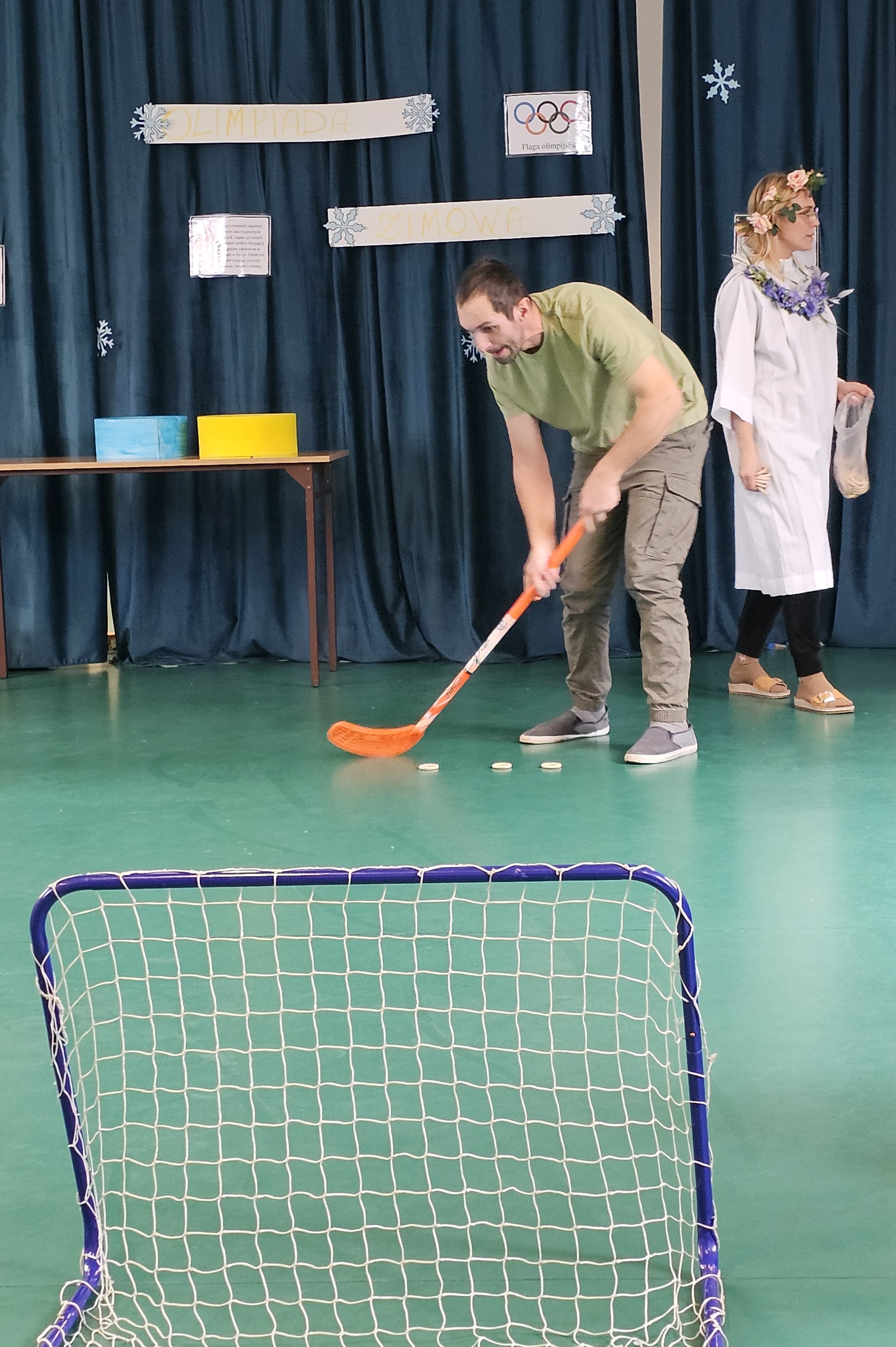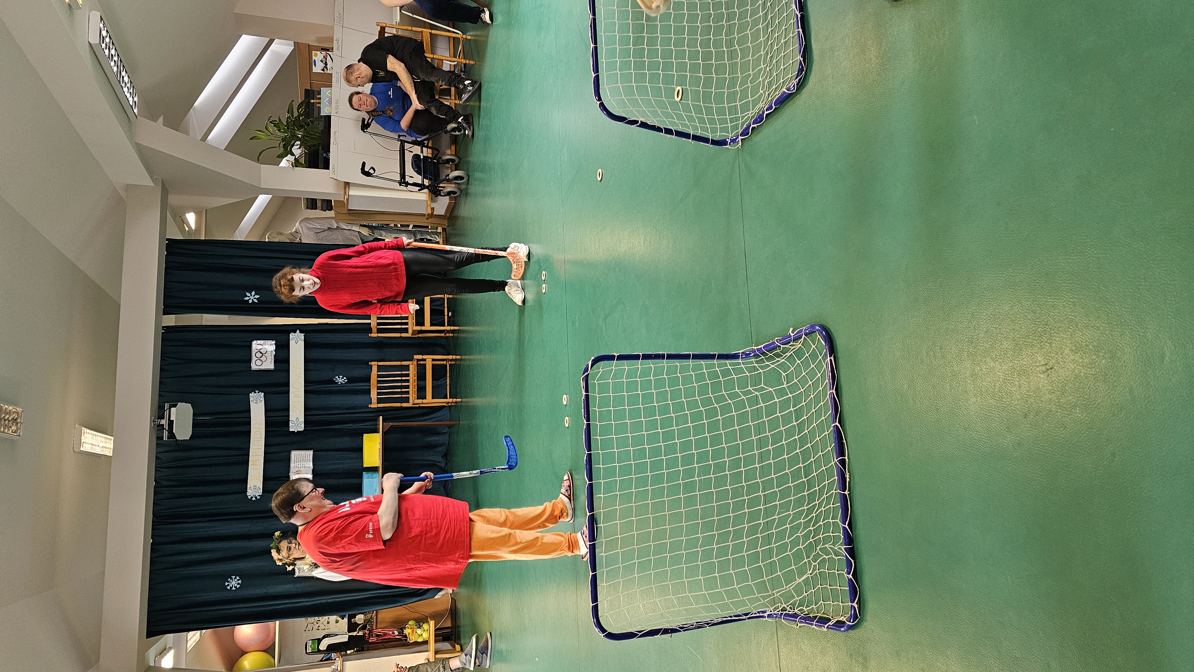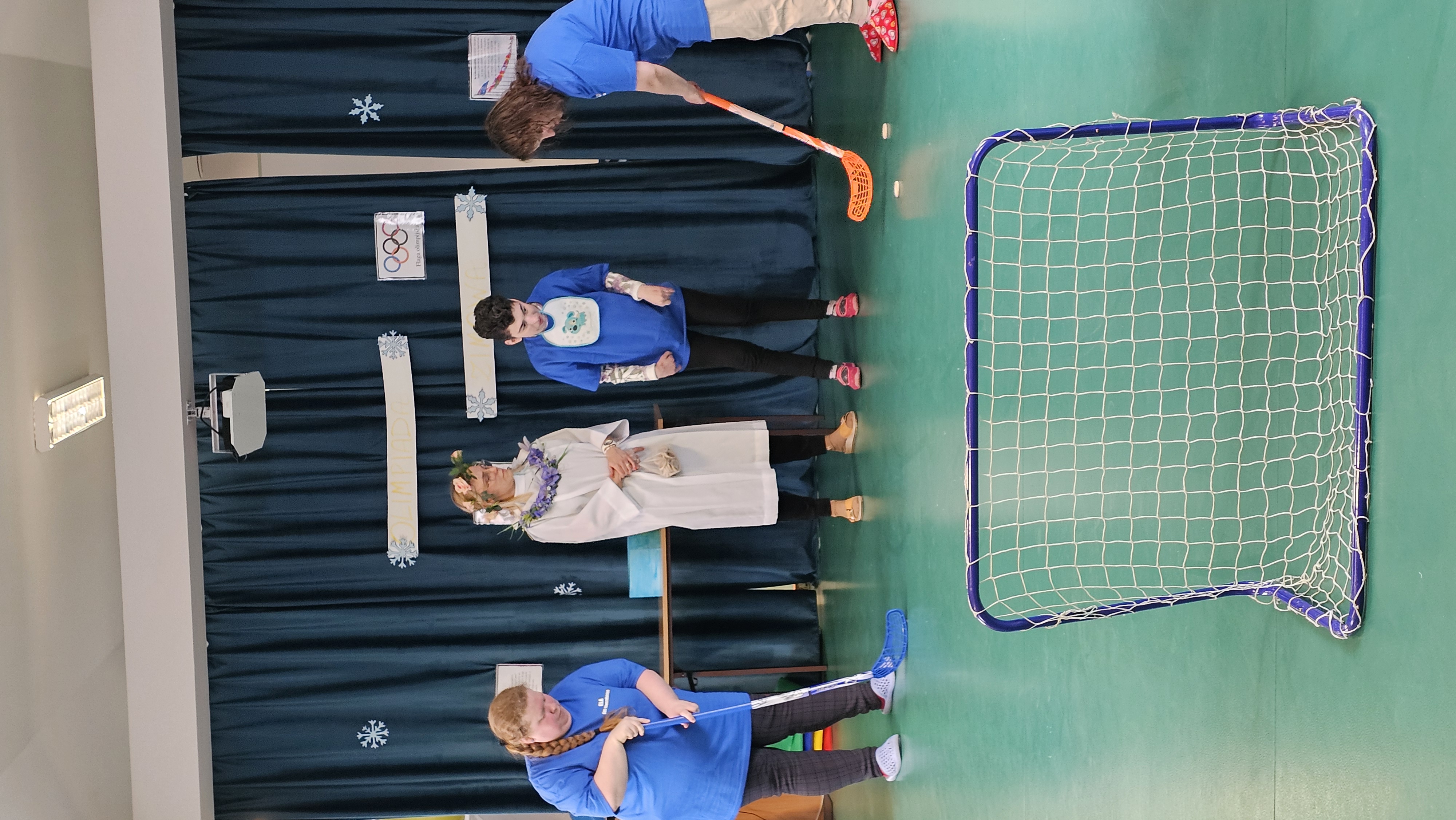 Najpierw było trochę teorii, żebyśmy sobie przypomnieli na czym polega olimpiada i jakie są jej symbole. Zostaliśmy podzieleni na 5 drużyn i ubrani w koszulki w kolorach kół olimpijskich, które splecione ze sobą reprezentują pięć kontynentów świata, połączonych ideą olimpijską. Każda drużyna reprezentowała zatem inny kontynent. Swoją wiedzę mogliśmy sprawdzić rozwiązując quizy i za pomocą kolorowanki. Olimpiada to jednak przede wszystkim sport i rywalizacja, więc był bieg z ogniem olimpijskim, saneczkarstwo i hokej. Zabawa była świetna! Dziękujemy pani Beacie za tą sportową rozrywkę![]()