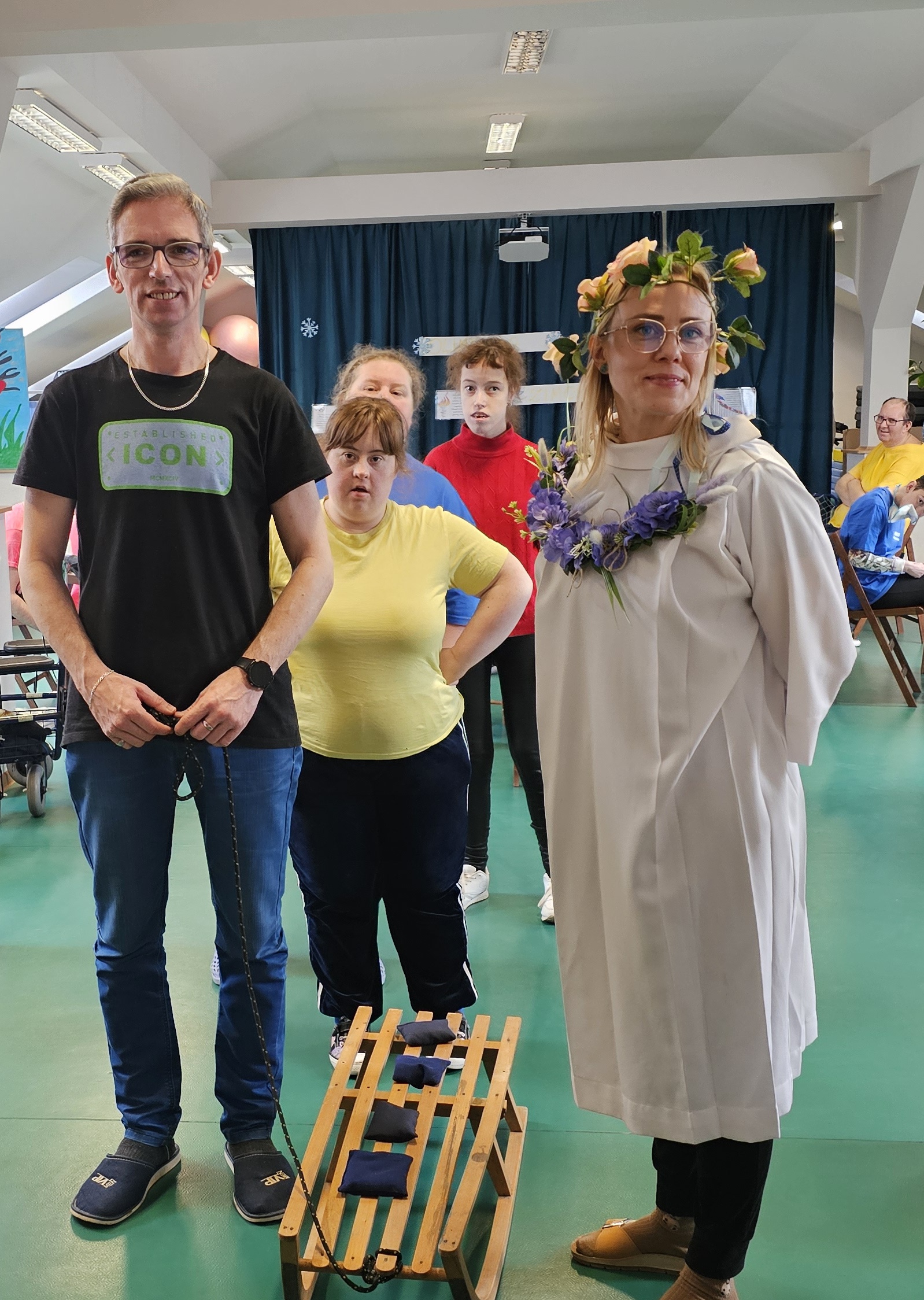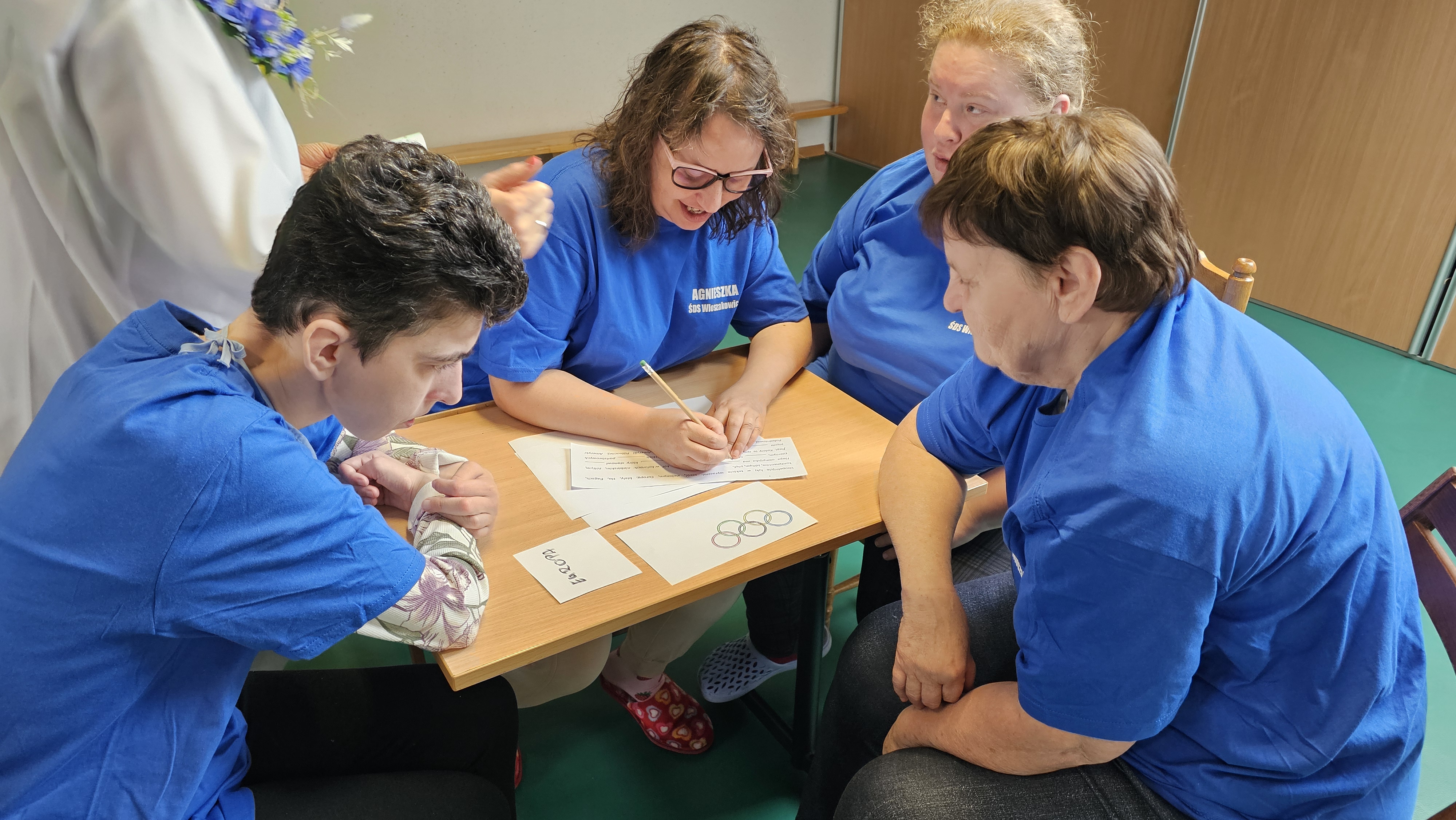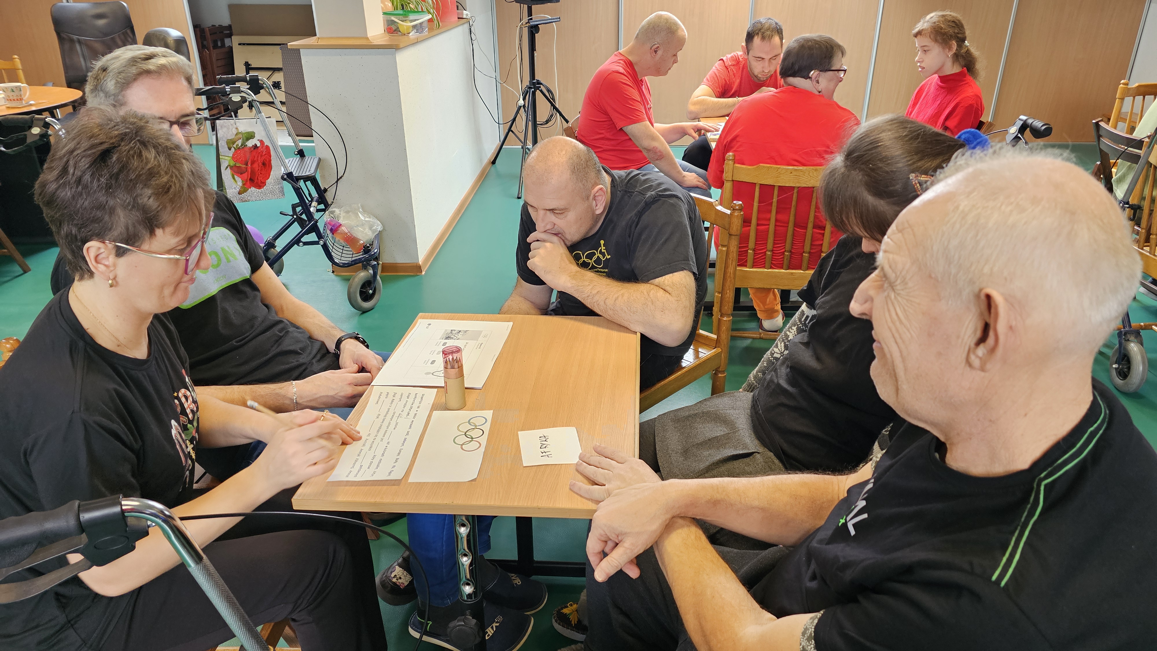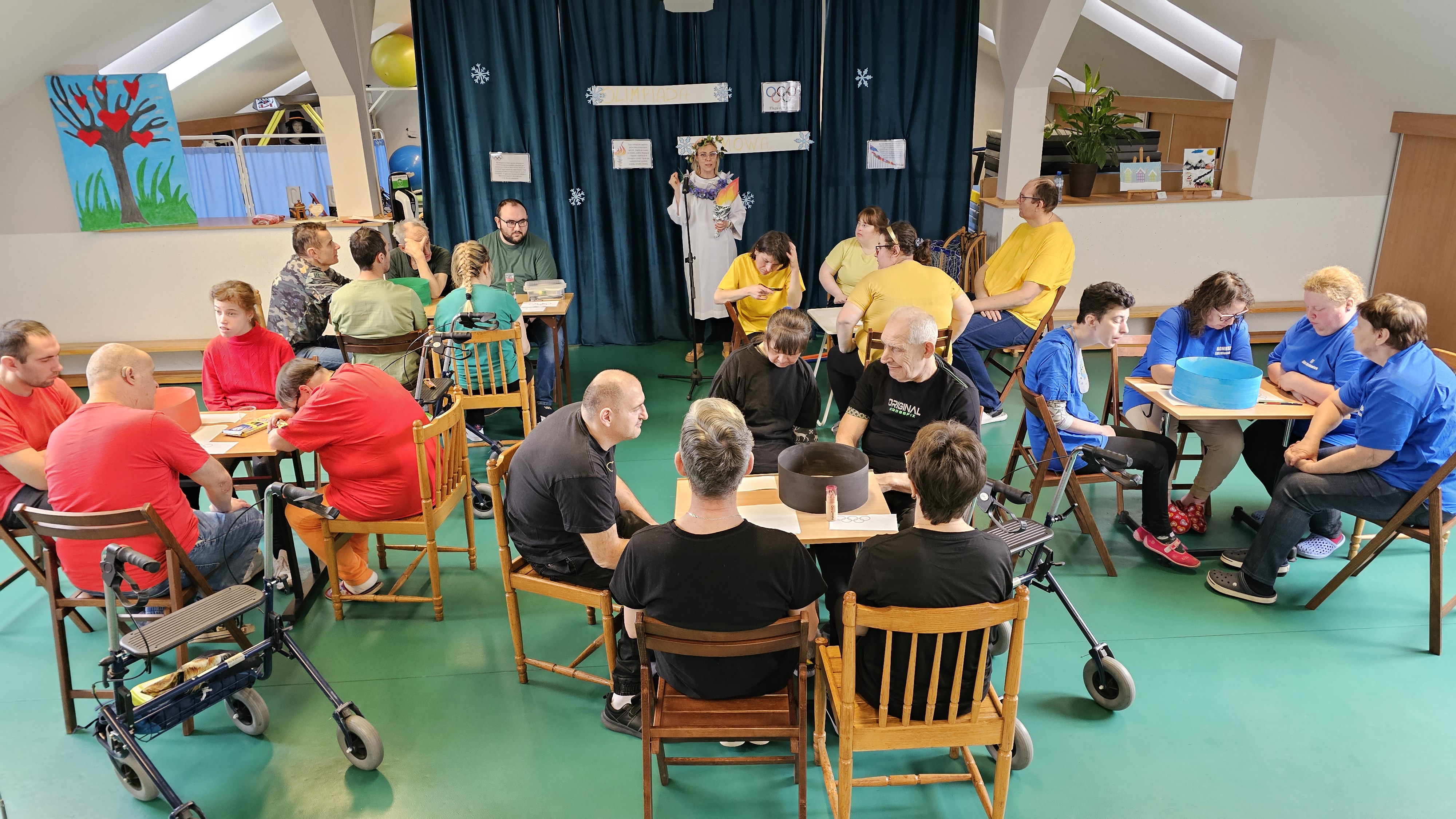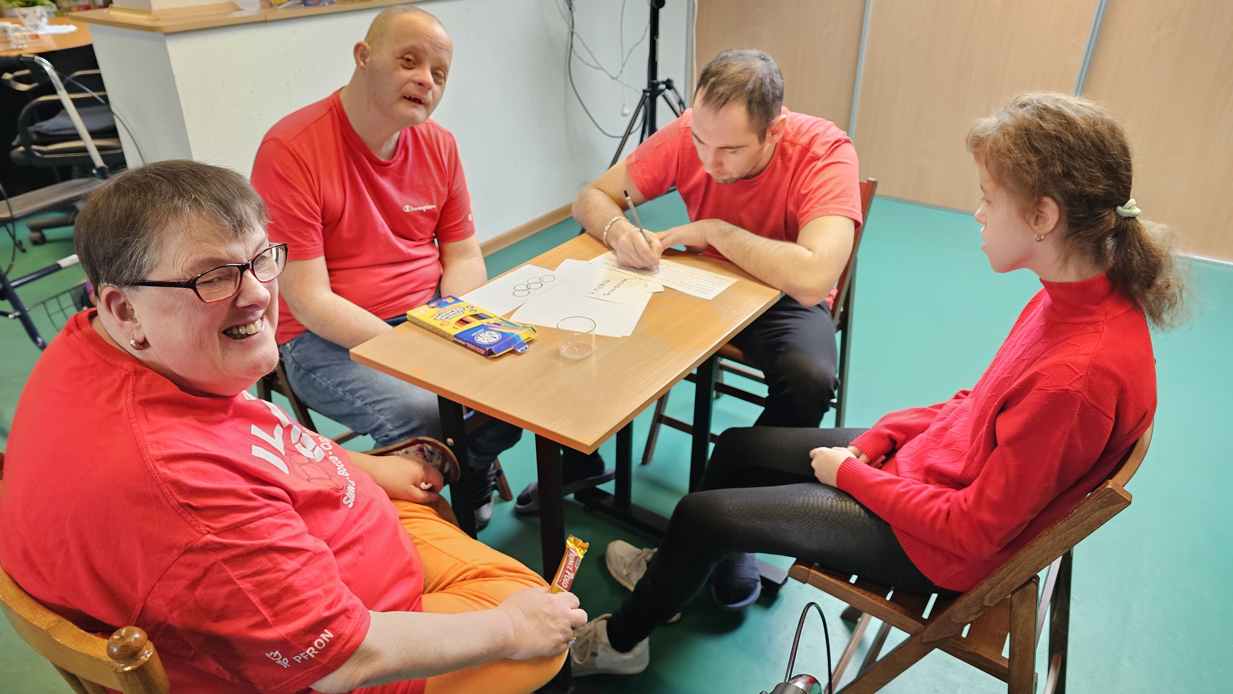 Najpierw było trochę teorii, żebyśmy sobie przypomnieli na czym polega olimpiada i jakie są jej symbole. Zostaliśmy podzieleni na 5 drużyn i ubrani w koszulki w kolorach kół olimpijskich, które splecione ze sobą reprezentują pięć kontynentów świata, połączonych ideą olimpijską. Każda drużyna reprezentowała zatem inny kontynent. Swoją wiedzę mogliśmy sprawdzić rozwiązując quizy i za pomocą kolorowanki. Olimpiada to jednak przede wszystkim sport i rywalizacja, więc był bieg z ogniem olimpijskim, saneczkarstwo i hokej. Zabawa była świetna! Dziękujemy pani Beacie za tą sportową rozrywkę![]()