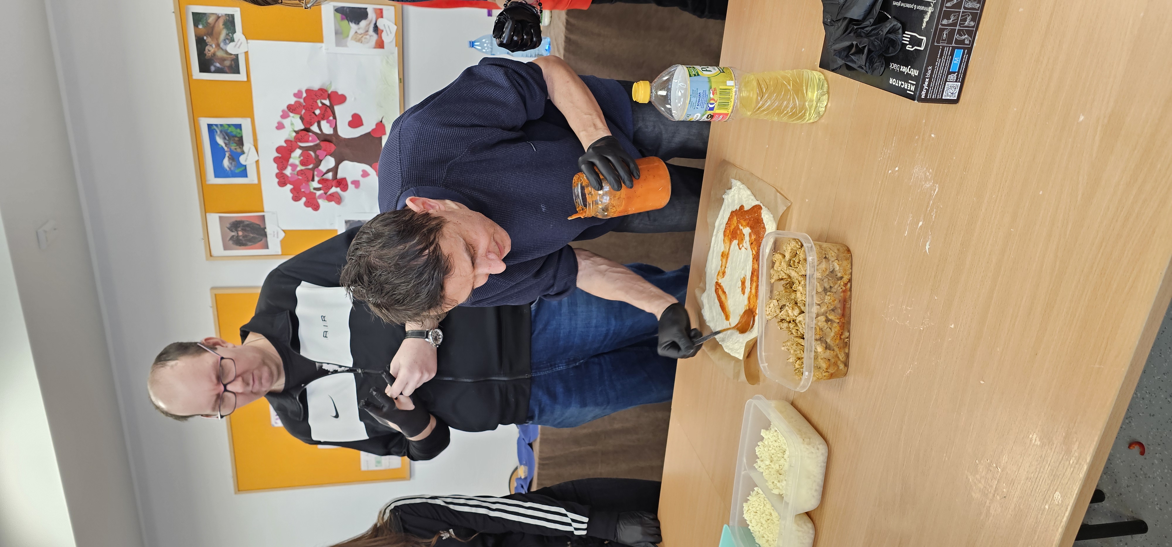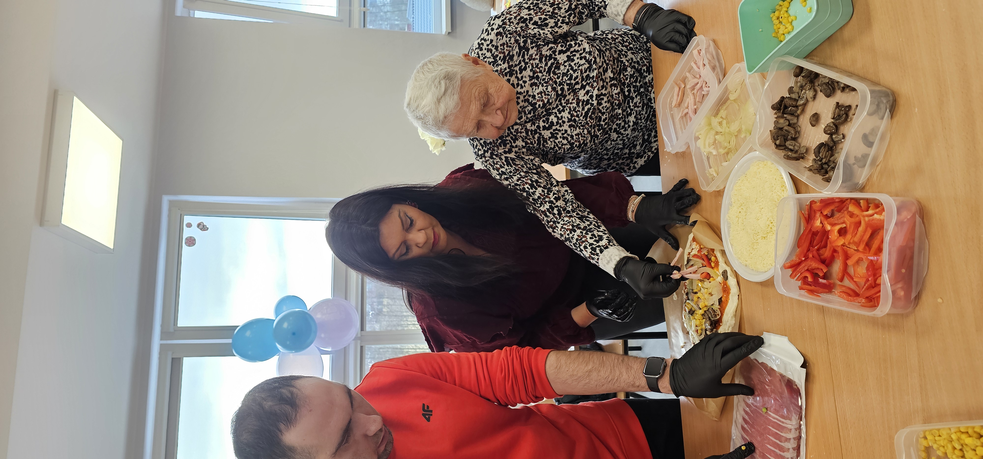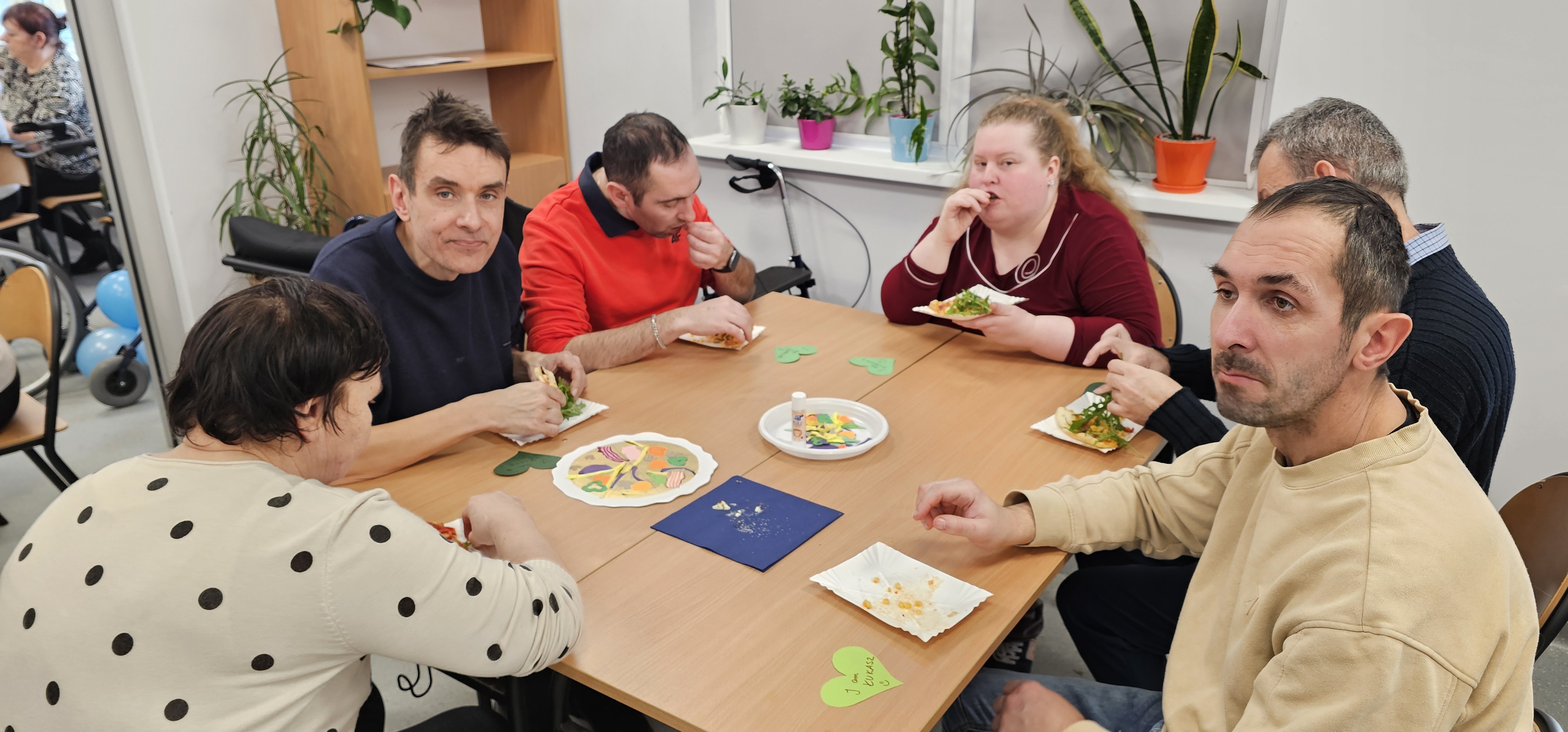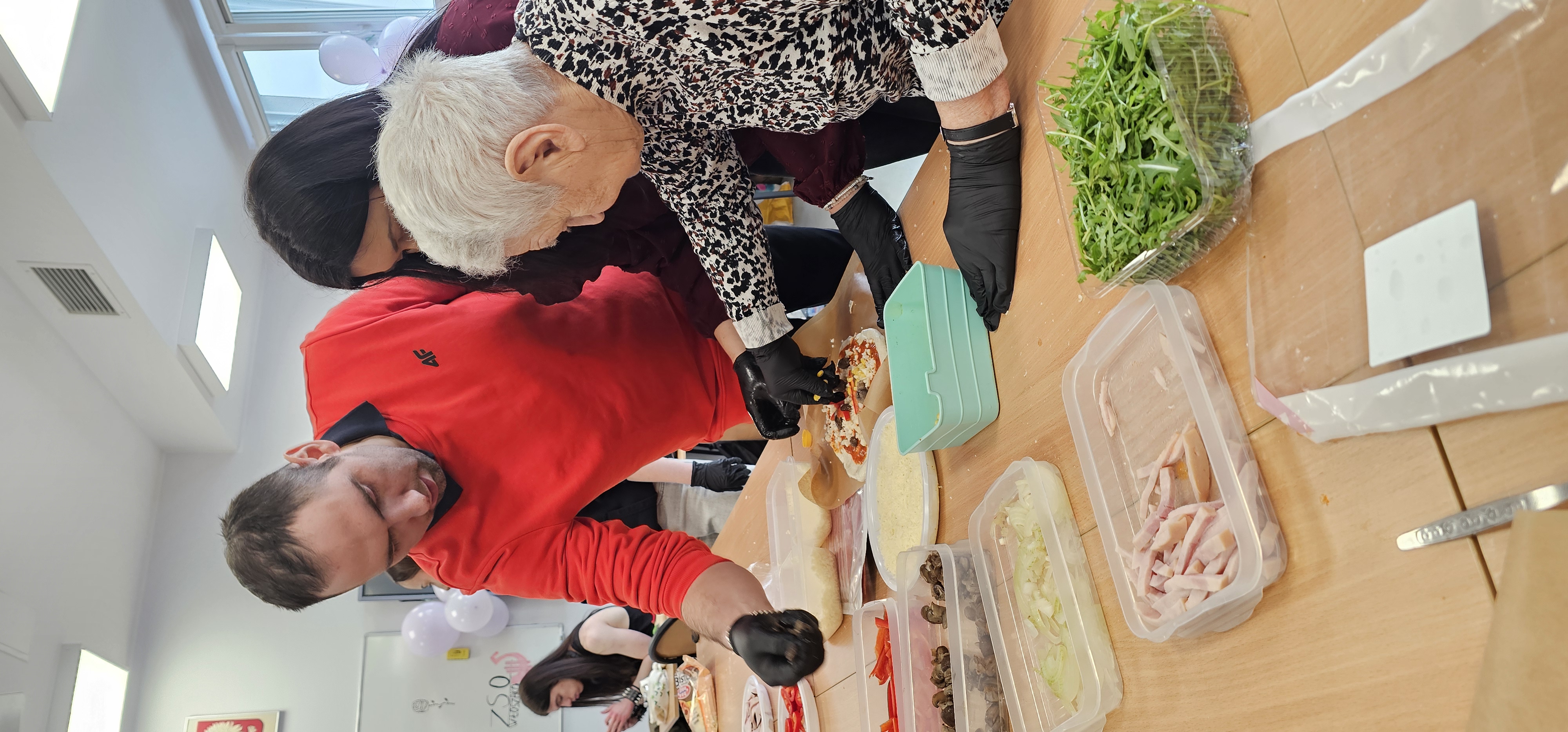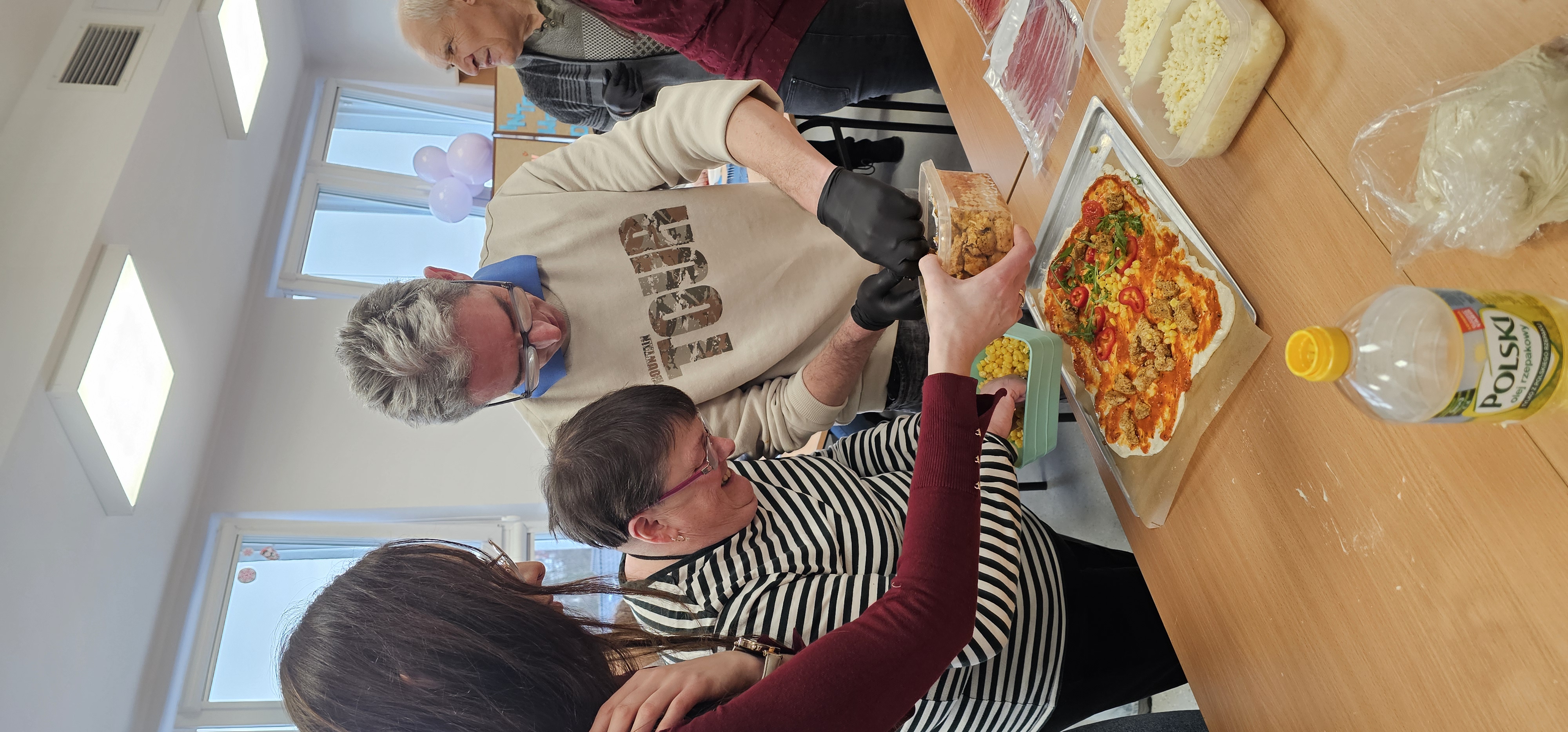 Już od progu zostaliśmy serdecznie powitani i oprowadzeni po placówce, dzięki czemu od razu poczuliśmy się swobodnie i mile widziani. Po zwiedzaniu udaliśmy się do sali lekcyjnej na piętrze, gdzie czekał na nas słodki poczęstunek oraz ulubiona przez wszystkich kawa. W miłej atmosferze rozpoczęliśmy wspólne świętowanie. Każdy z nas otrzymał serduszko ze swoim imieniem, żeby łatwiej było się porozumieć z gospodarzami. Przy wsparciu wolontariuszy bawiliśmy się w komponowanie pizzy przy użyciu elementów z papieru. Po warsztatach plastycznych nastąpiła część artystyczna. Dziewczyny ze Szkoły Podstawowej zachwyciły nas efektownym pokazem akrobatyki sportowej. Dodatkową niespodzianką była autorska piosenka o pizzy, która wywołała uśmiech i gromkie brawa. Po występach razem z wolontariuszami dekorowaliśmy wcześniej przygotowane ciasto różnorodnymi prawdziwymi składnikami, tworząc własne kompozycje smakowe. Następnie nasze pizze trafiły do pieca, a chwilę później na nasze talerze. Smakowały wyśmienicie, zwłaszcza że były przygotowane własnoręcznie. Normalnie palce lizać