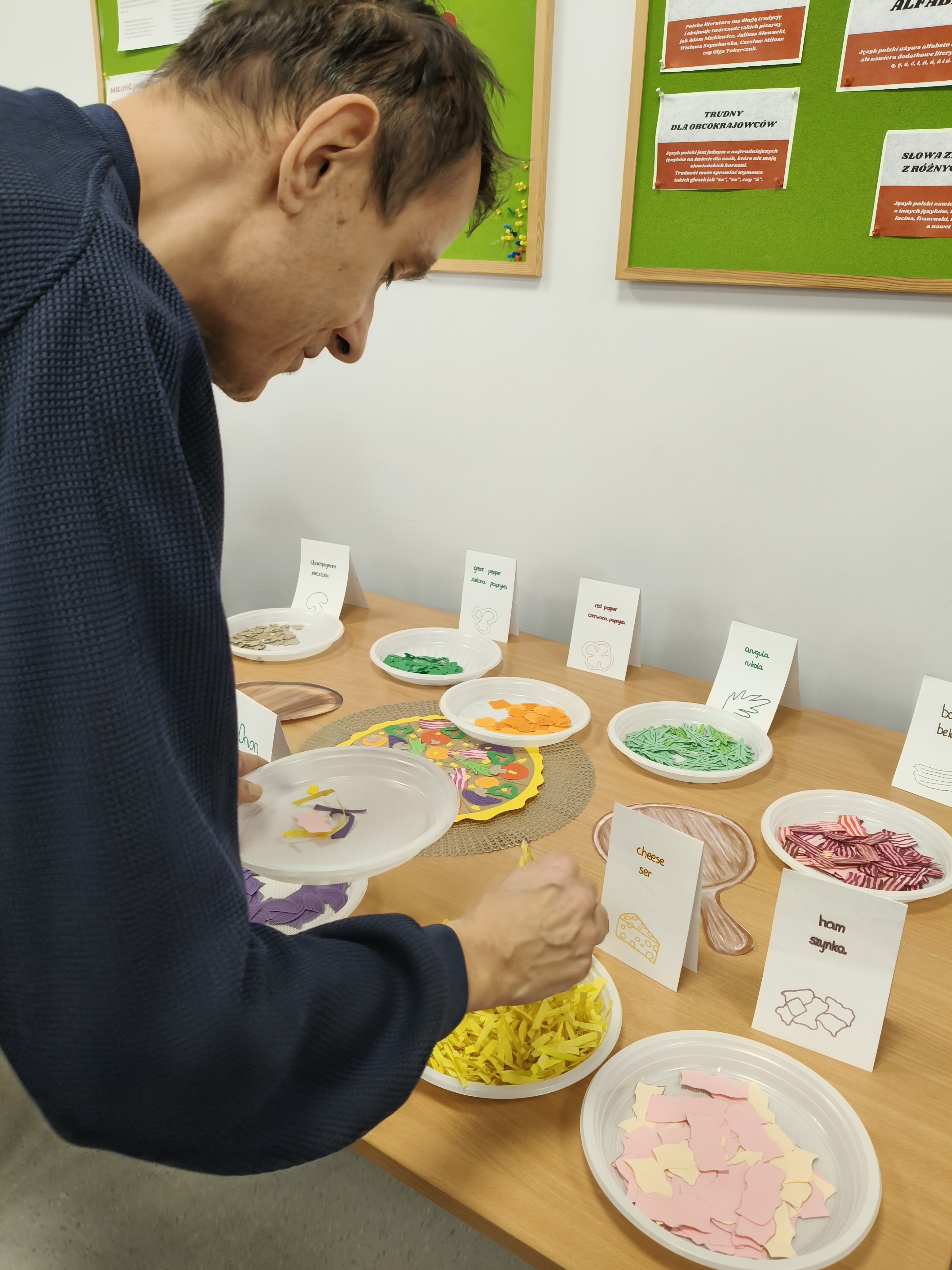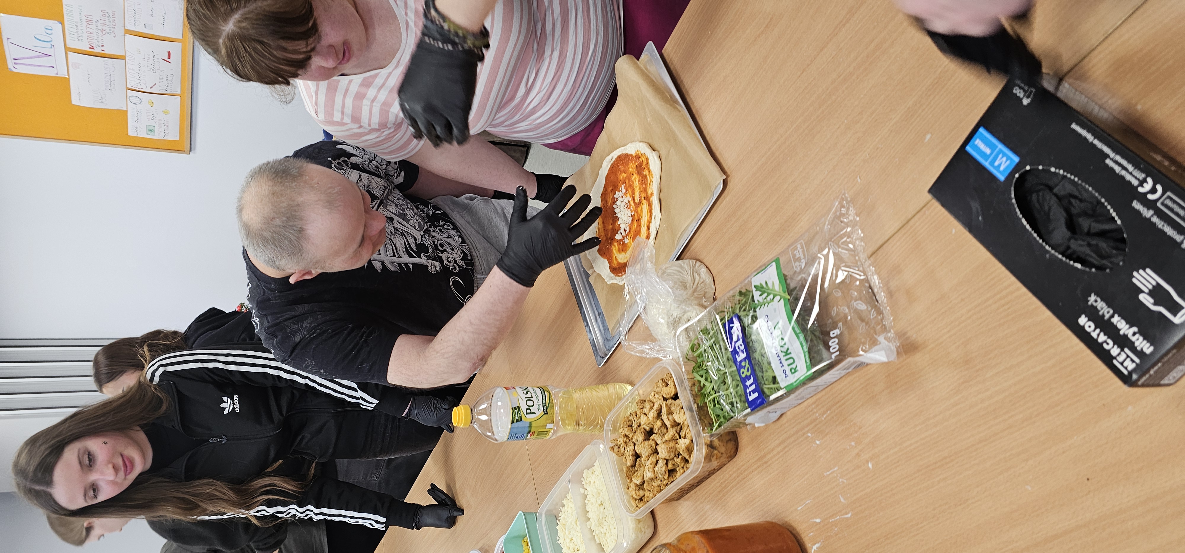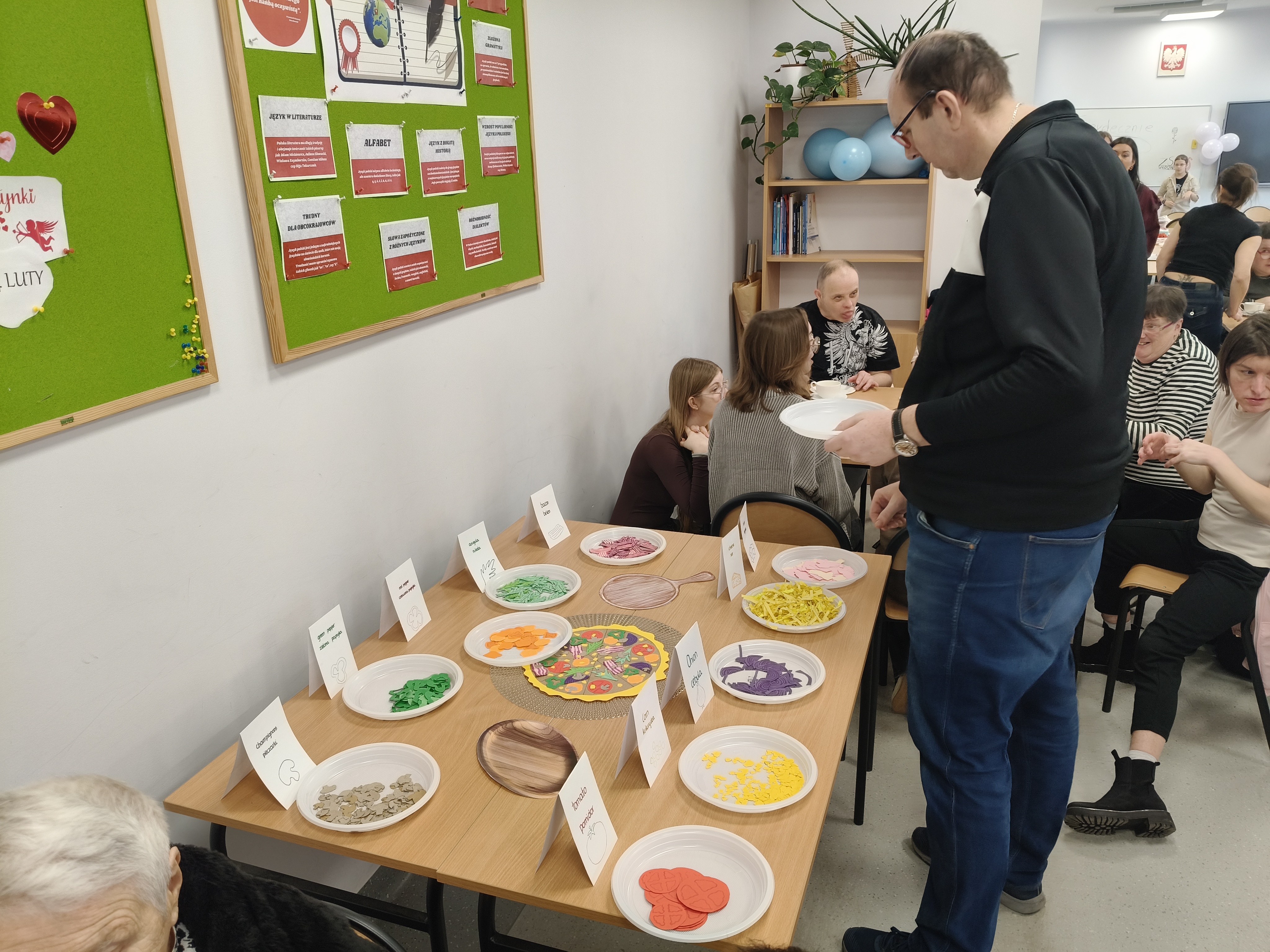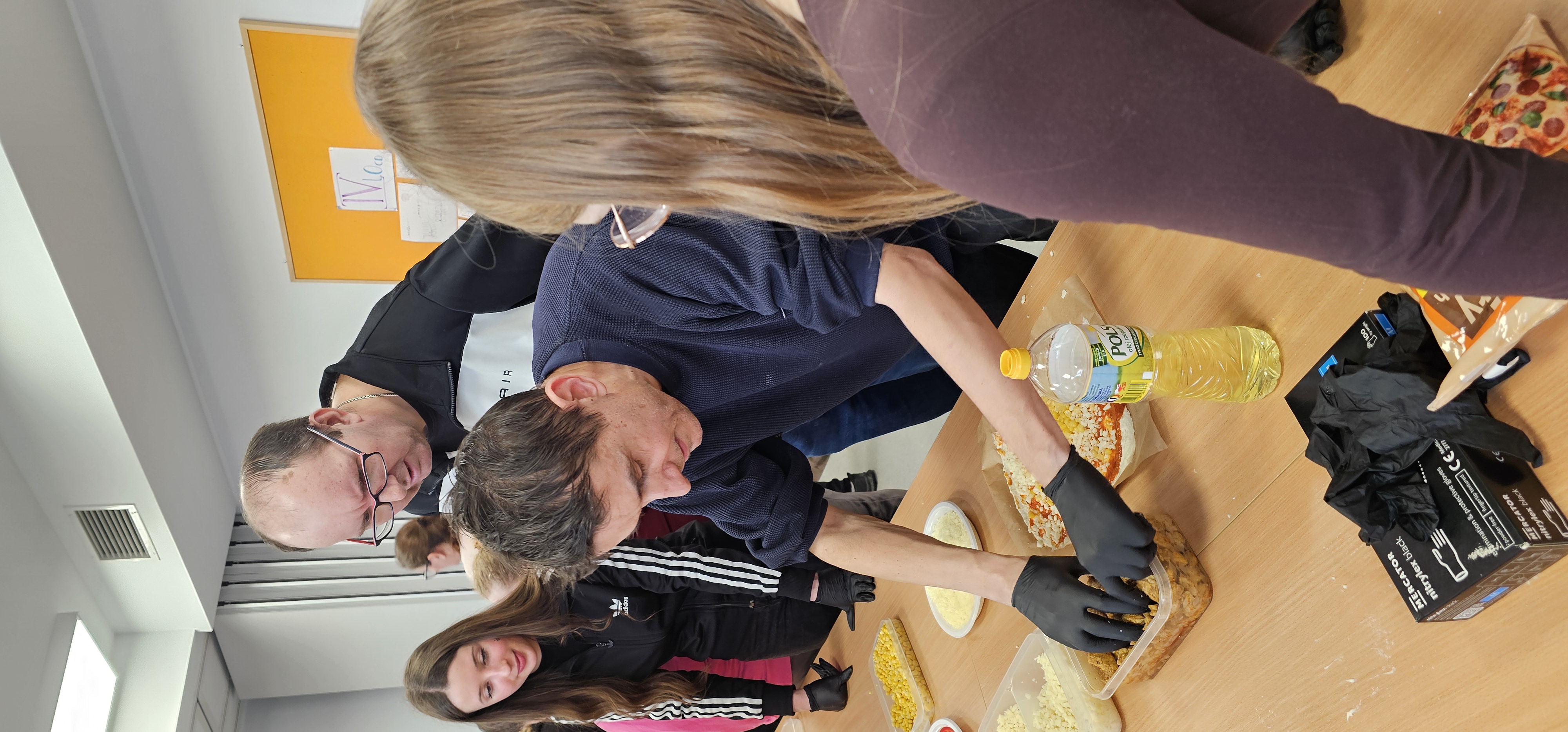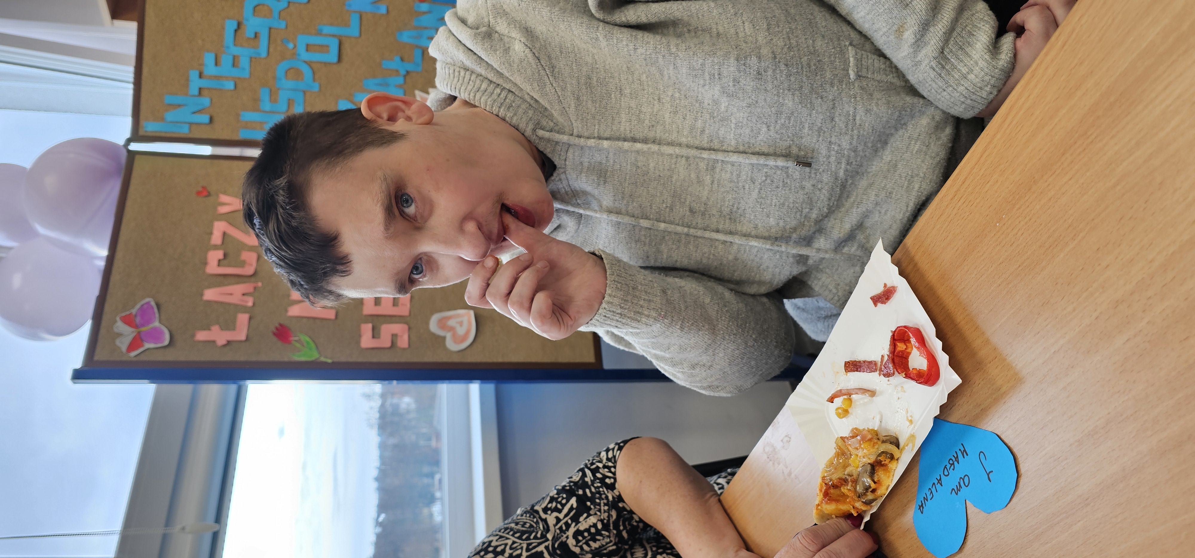Już od progu zostaliśmy serdecznie powitani i oprowadzeni po placówce, dzięki czemu od razu poczuliśmy się swobodnie i mile widziani. Po zwiedzaniu udaliśmy się do sali lekcyjnej na piętrze, gdzie czekał na nas słodki poczęstunek oraz ulubiona przez wszystkich kawa. W miłej atmosferze rozpoczęliśmy wspólne świętowanie. Każdy z nas otrzymał serduszko ze swoim imieniem, żeby łatwiej było się porozumieć z gospodarzami. Przy wsparciu wolontariuszy bawiliśmy się w komponowanie pizzy przy użyciu elementów z papieru. Po warsztatach plastycznych nastąpiła część artystyczna. Dziewczyny ze Szkoły Podstawowej zachwyciły nas efektownym pokazem akrobatyki sportowej. Dodatkową niespodzianką była autorska piosenka o pizzy, która wywołała uśmiech i gromkie brawa. Po występach razem z wolontariuszami dekorowaliśmy wcześniej przygotowane ciasto różnorodnymi prawdziwymi składnikami, tworząc własne kompozycje smakowe. Następnie nasze pizze trafiły do pieca, a chwilę później na nasze talerze. Smakowały wyśmienicie, zwłaszcza że były przygotowane własnoręcznie. Normalnie palce lizać