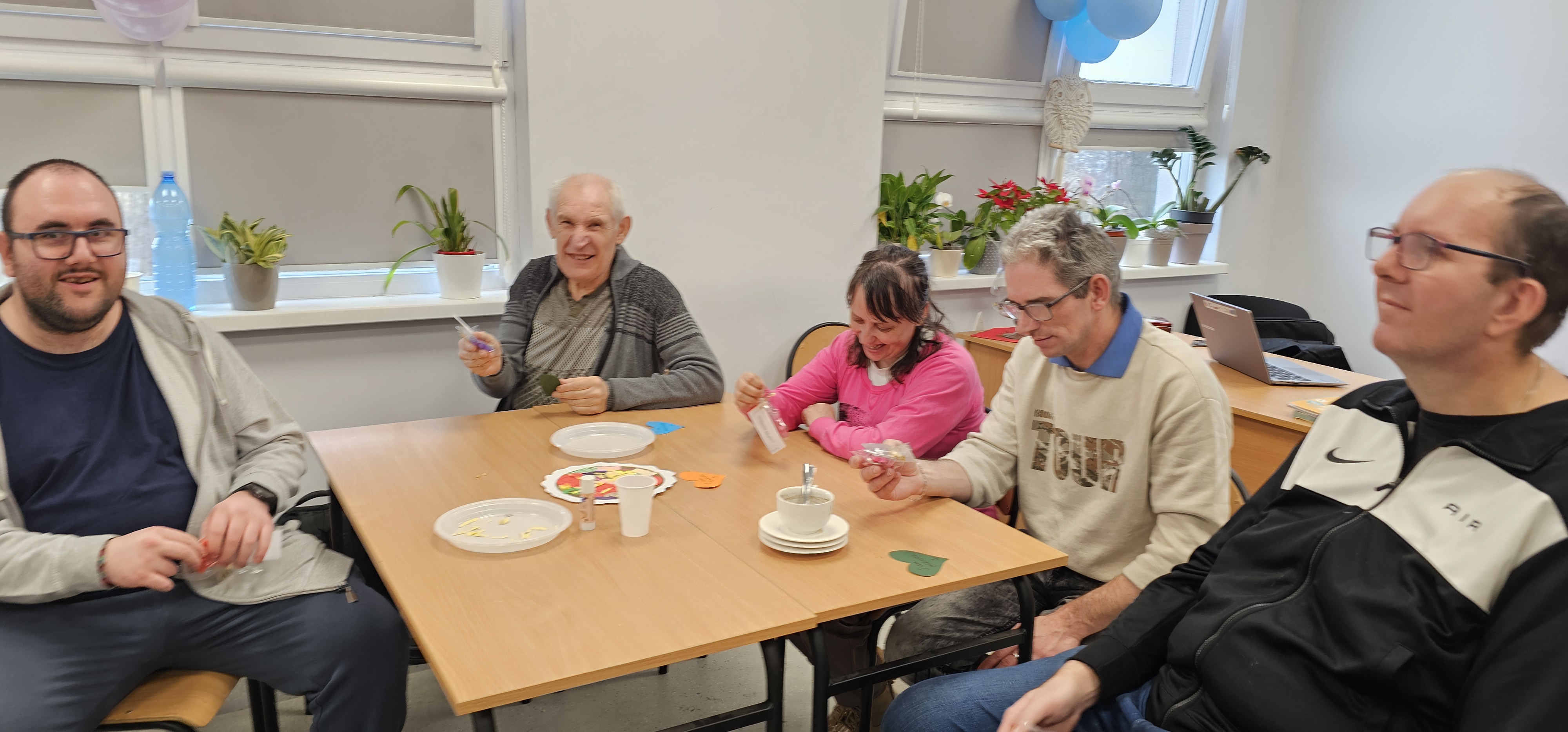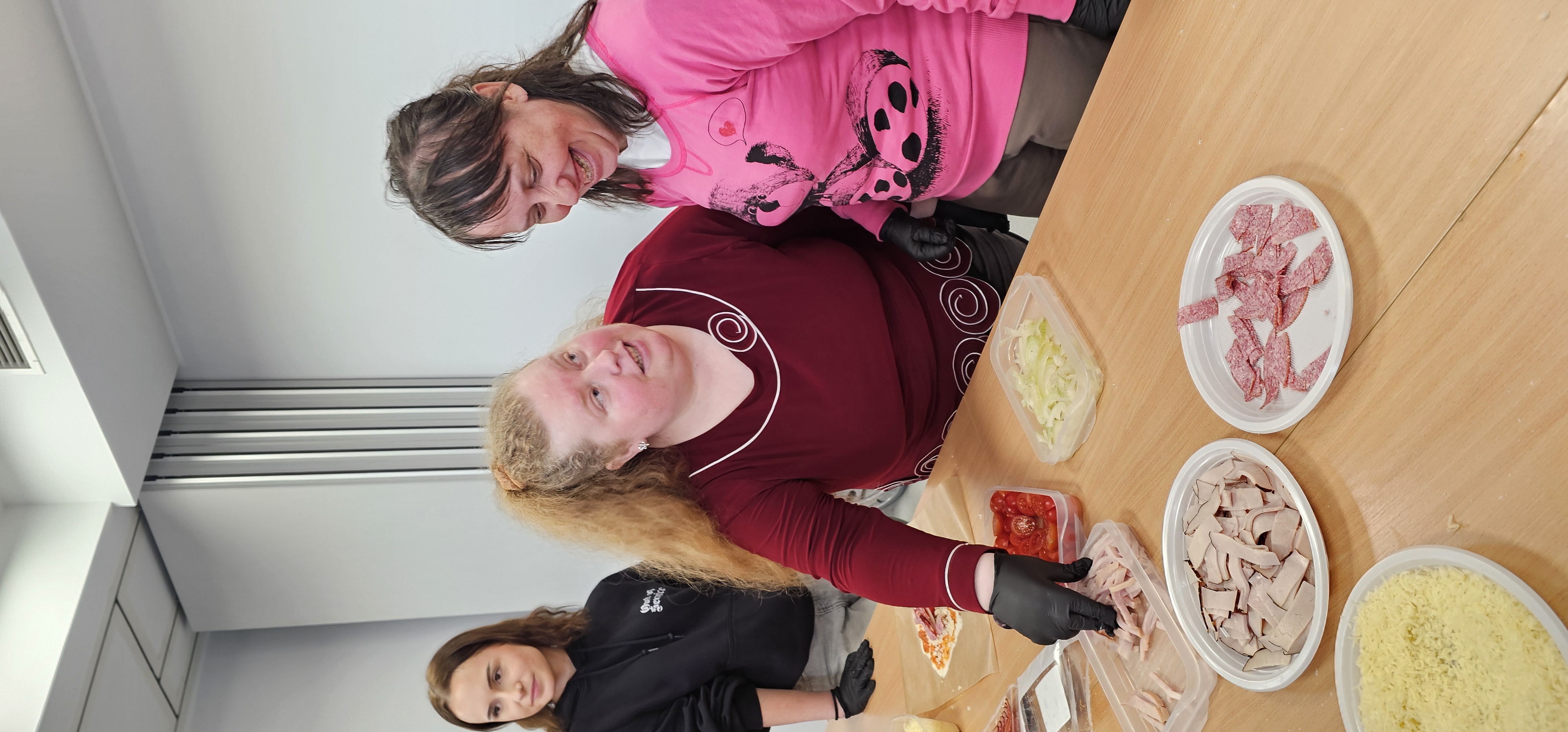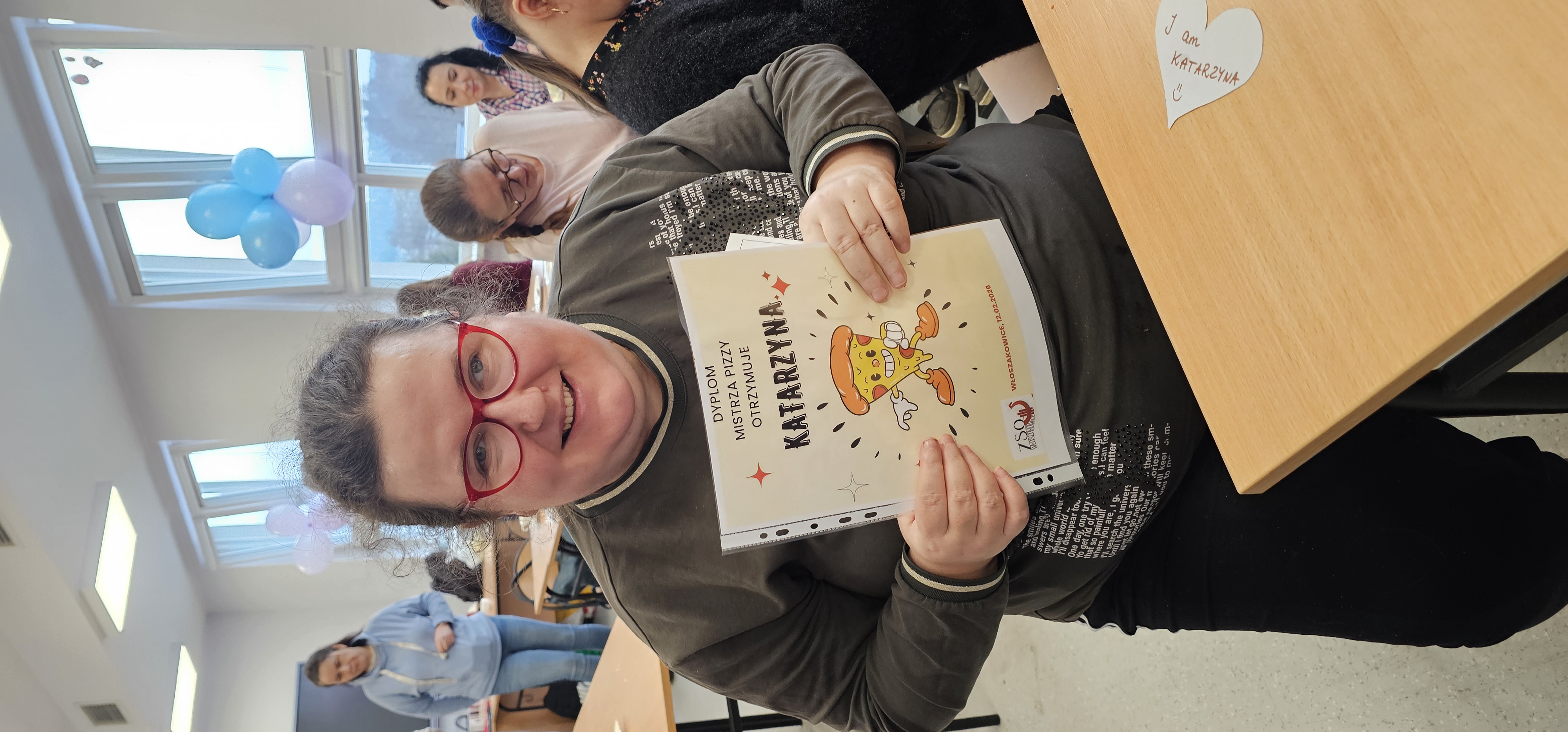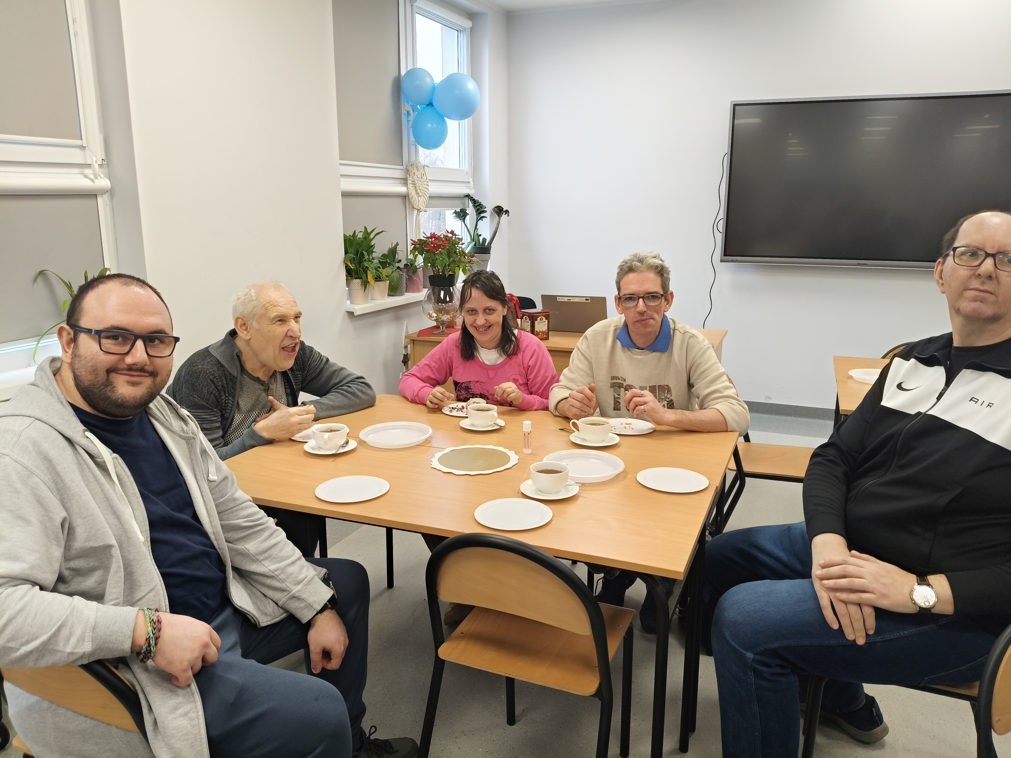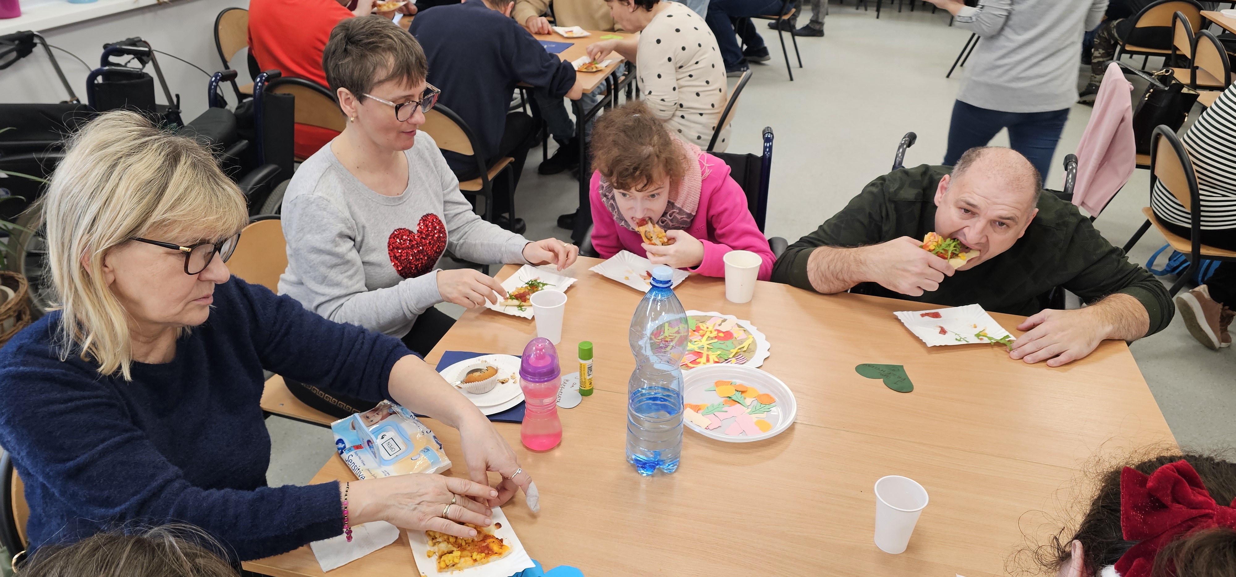 Już od progu zostaliśmy serdecznie powitani i oprowadzeni po placówce, dzięki czemu od razu poczuliśmy się swobodnie i mile widziani. Po zwiedzaniu udaliśmy się do sali lekcyjnej na piętrze, gdzie czekał na nas słodki poczęstunek oraz ulubiona przez wszystkich kawa. W miłej atmosferze rozpoczęliśmy wspólne świętowanie. Każdy z nas otrzymał serduszko ze swoim imieniem, żeby łatwiej było się porozumieć z gospodarzami. Przy wsparciu wolontariuszy bawiliśmy się w komponowanie pizzy przy użyciu elementów z papieru. Po warsztatach plastycznych nastąpiła część artystyczna. Dziewczyny ze Szkoły Podstawowej zachwyciły nas efektownym pokazem akrobatyki sportowej. Dodatkową niespodzianką była autorska piosenka o pizzy, która wywołała uśmiech i gromkie brawa. Po występach razem z wolontariuszami dekorowaliśmy wcześniej przygotowane ciasto różnorodnymi prawdziwymi składnikami, tworząc własne kompozycje smakowe. Następnie nasze pizze trafiły do pieca, a chwilę później na nasze talerze. Smakowały wyśmienicie, zwłaszcza że były przygotowane własnoręcznie. Normalnie palce lizać