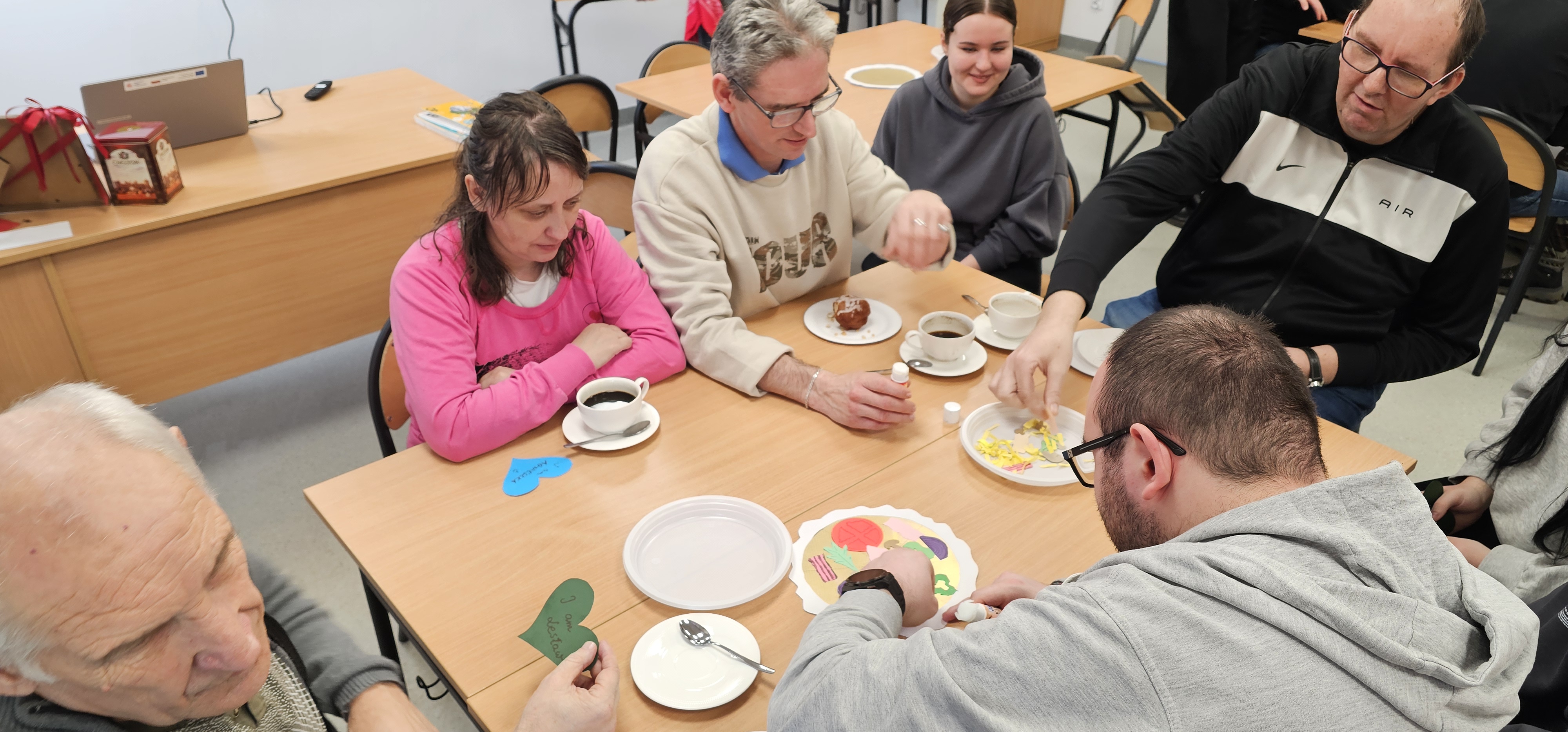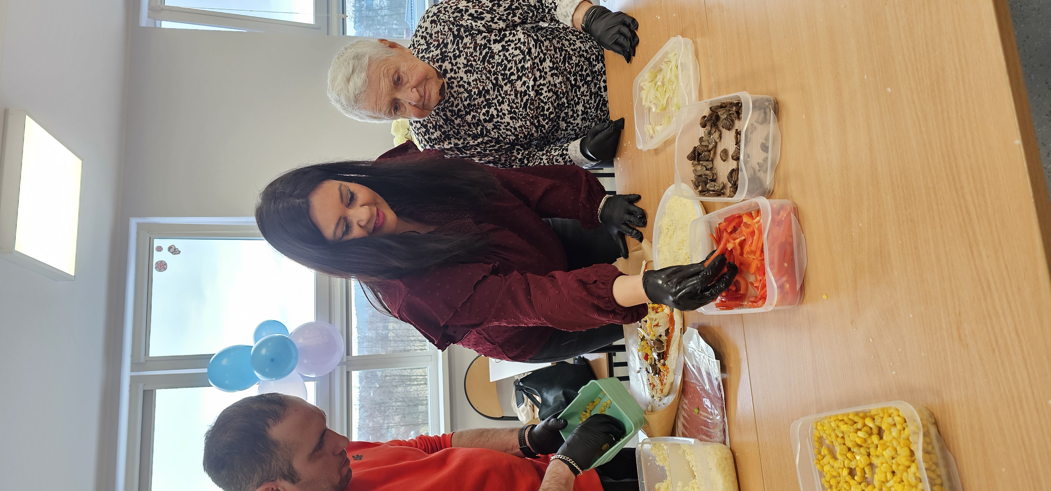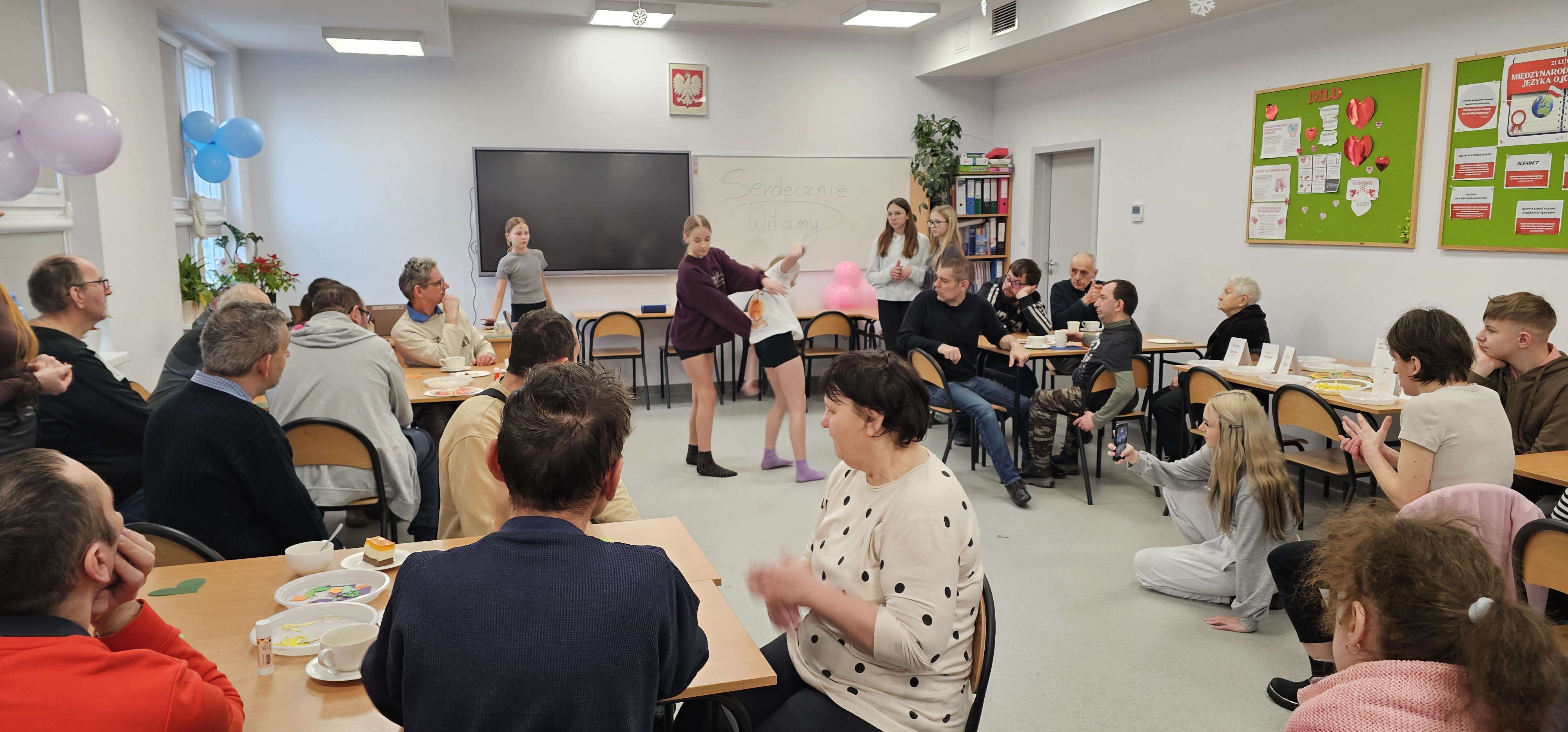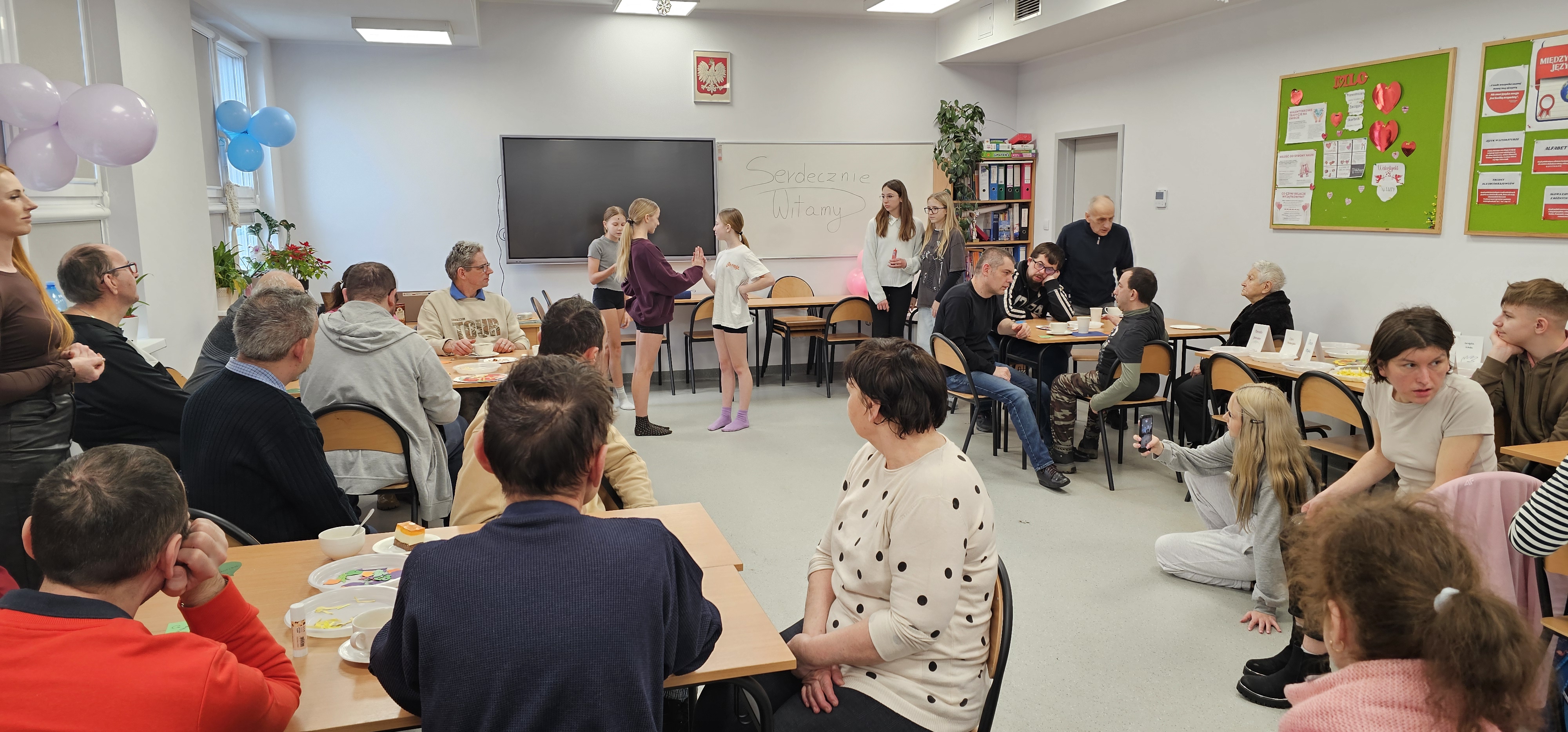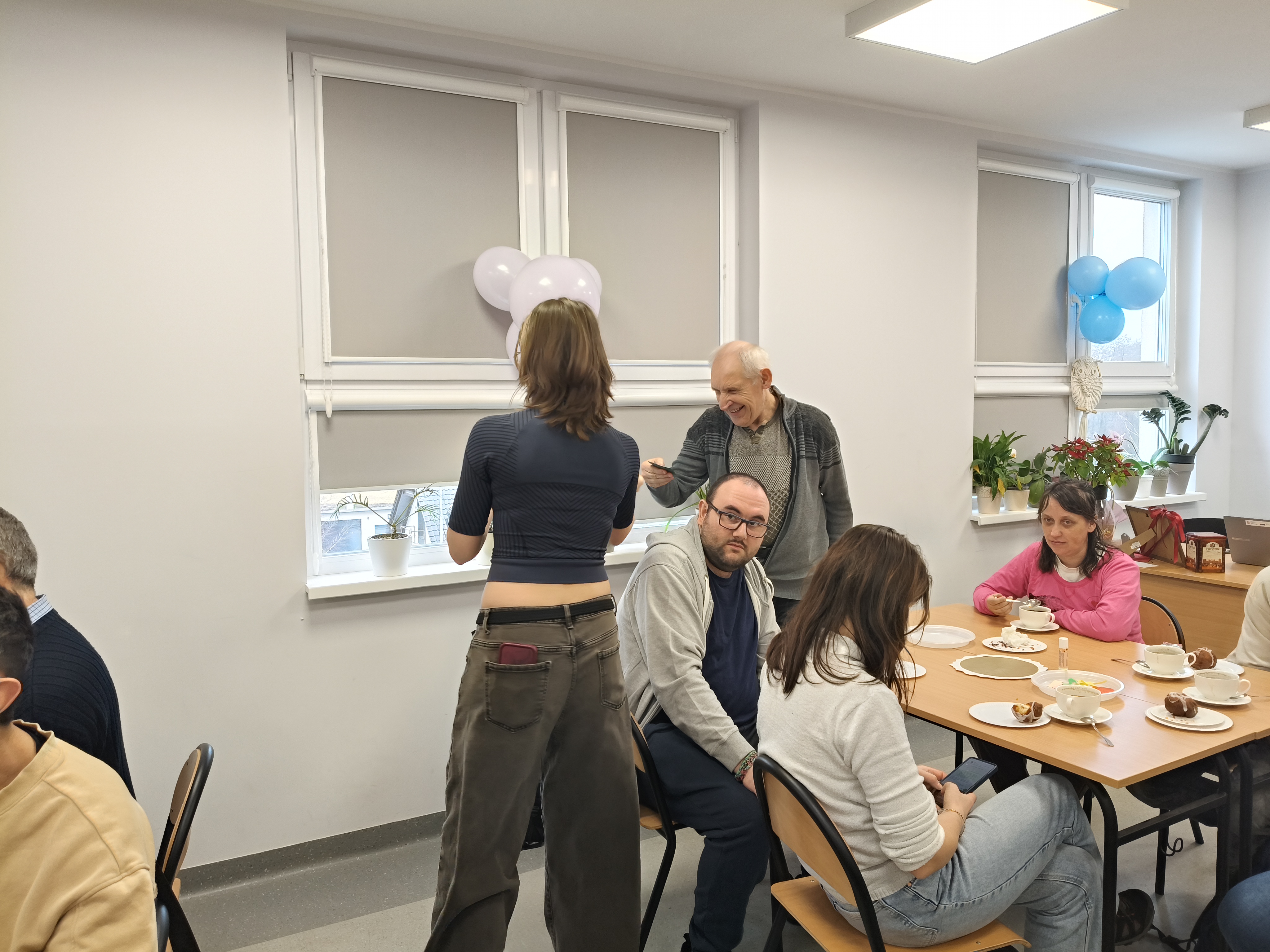 Już od progu zostaliśmy serdecznie powitani i oprowadzeni po placówce, dzięki czemu od razu poczuliśmy się swobodnie i mile widziani. Po zwiedzaniu udaliśmy się do sali lekcyjnej na piętrze, gdzie czekał na nas słodki poczęstunek oraz ulubiona przez wszystkich kawa. W miłej atmosferze rozpoczęliśmy wspólne świętowanie. Każdy z nas otrzymał serduszko ze swoim imieniem, żeby łatwiej było się porozumieć z gospodarzami. Przy wsparciu wolontariuszy bawiliśmy się w komponowanie pizzy przy użyciu elementów z papieru. Po warsztatach plastycznych nastąpiła część artystyczna. Dziewczyny ze Szkoły Podstawowej zachwyciły nas efektownym pokazem akrobatyki sportowej. Dodatkową niespodzianką była autorska piosenka o pizzy, która wywołała uśmiech i gromkie brawa. Po występach razem z wolontariuszami dekorowaliśmy wcześniej przygotowane ciasto różnorodnymi prawdziwymi składnikami, tworząc własne kompozycje smakowe. Następnie nasze pizze trafiły do pieca, a chwilę później na nasze talerze. Smakowały wyśmienicie, zwłaszcza że były przygotowane własnoręcznie. Normalnie palce lizać
