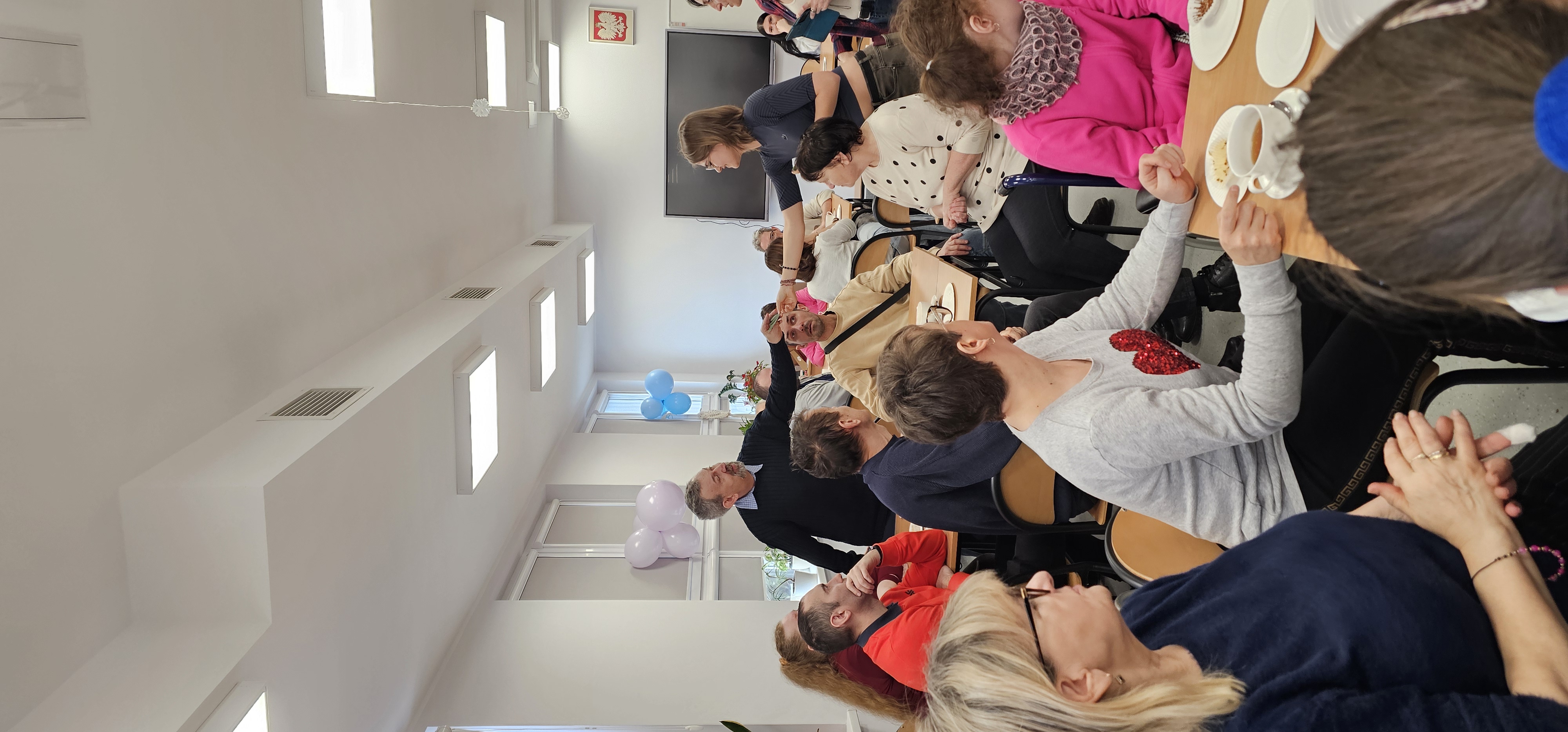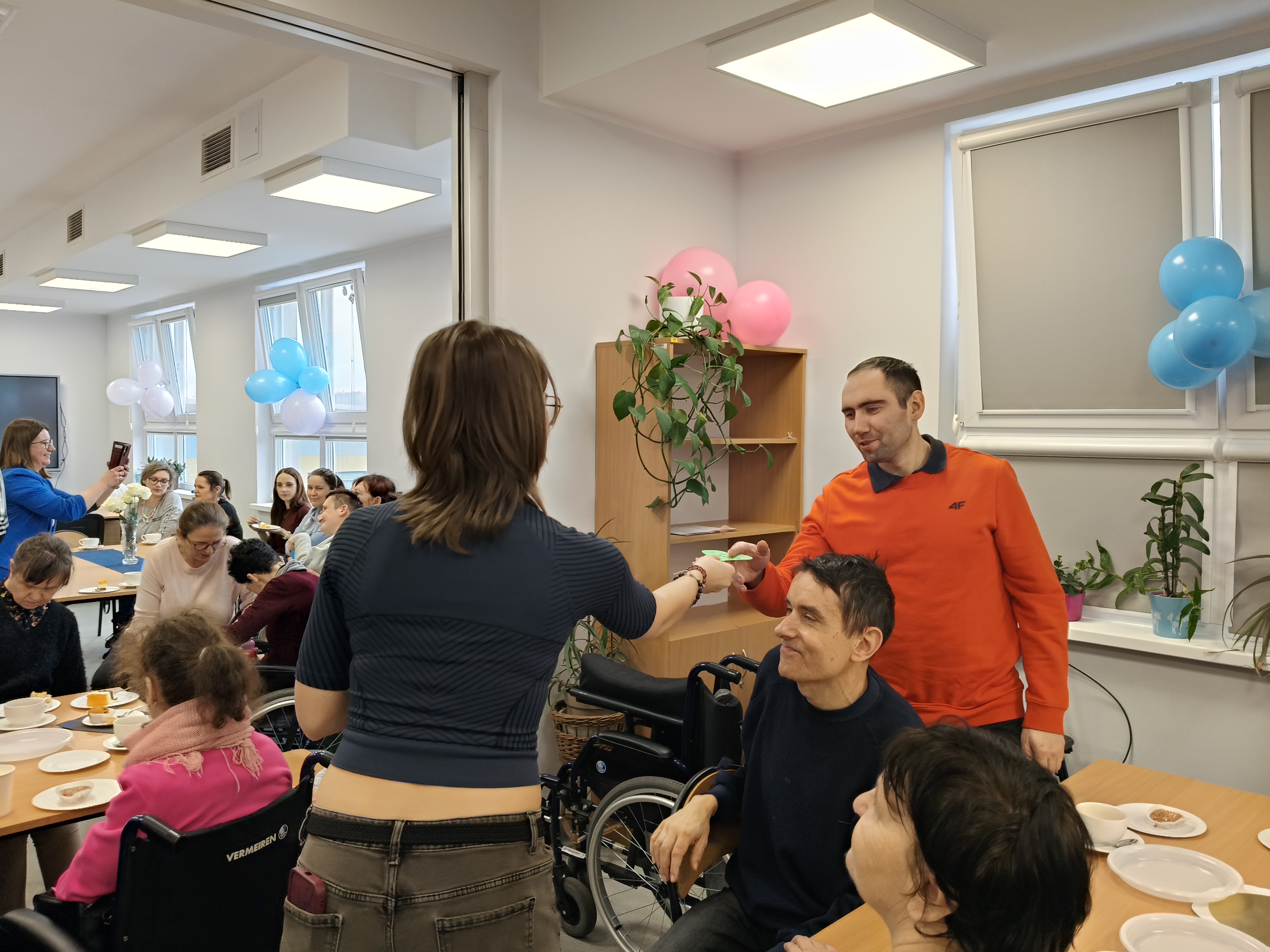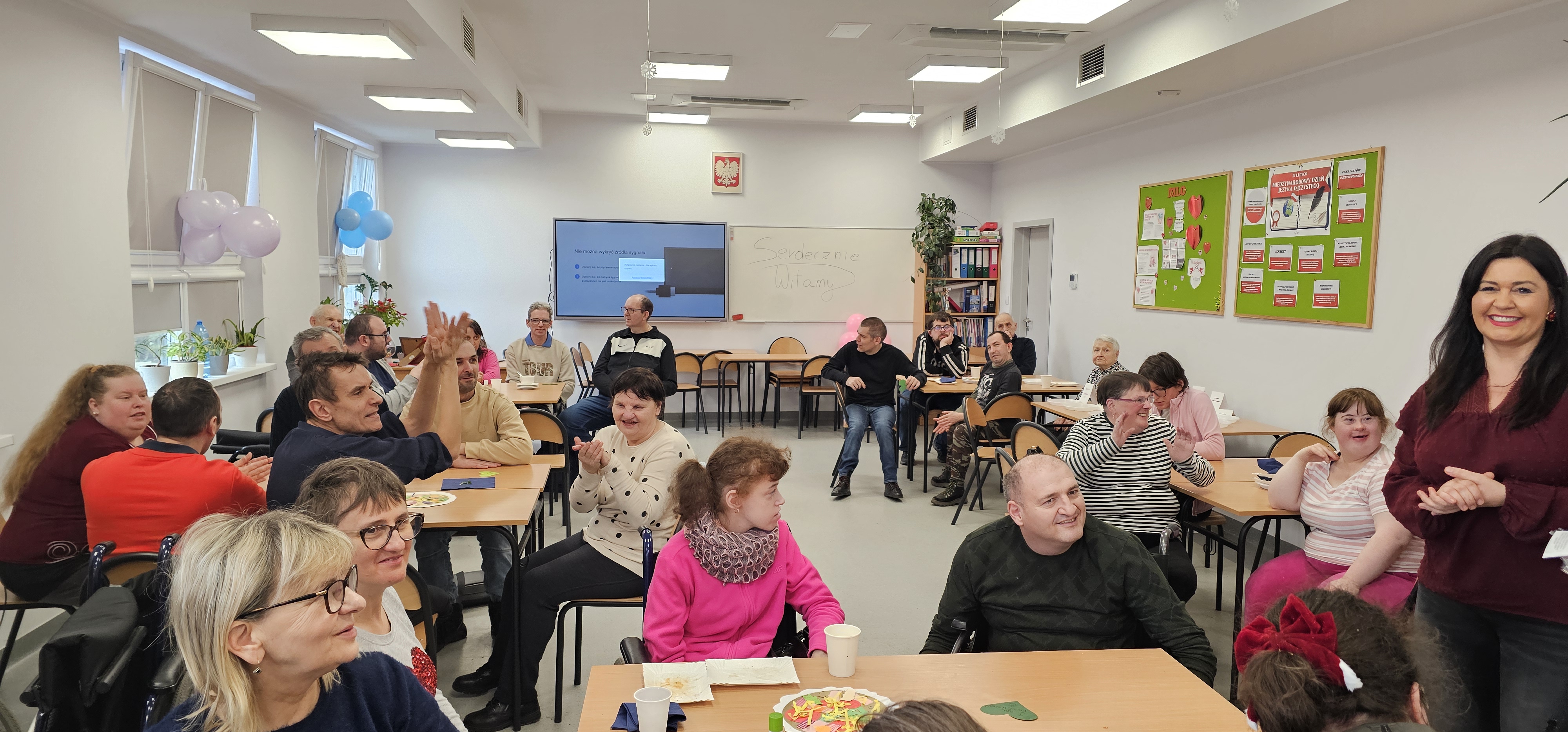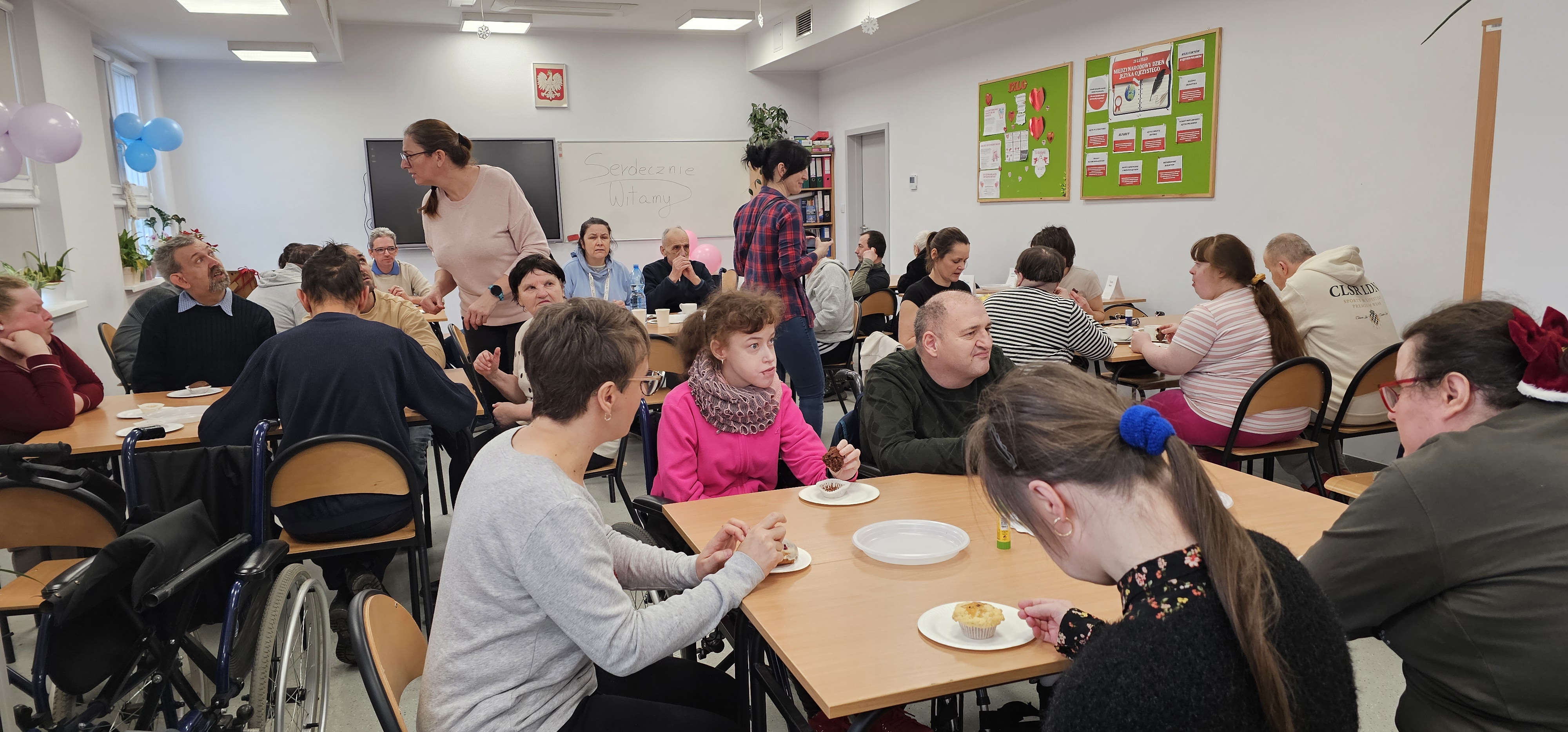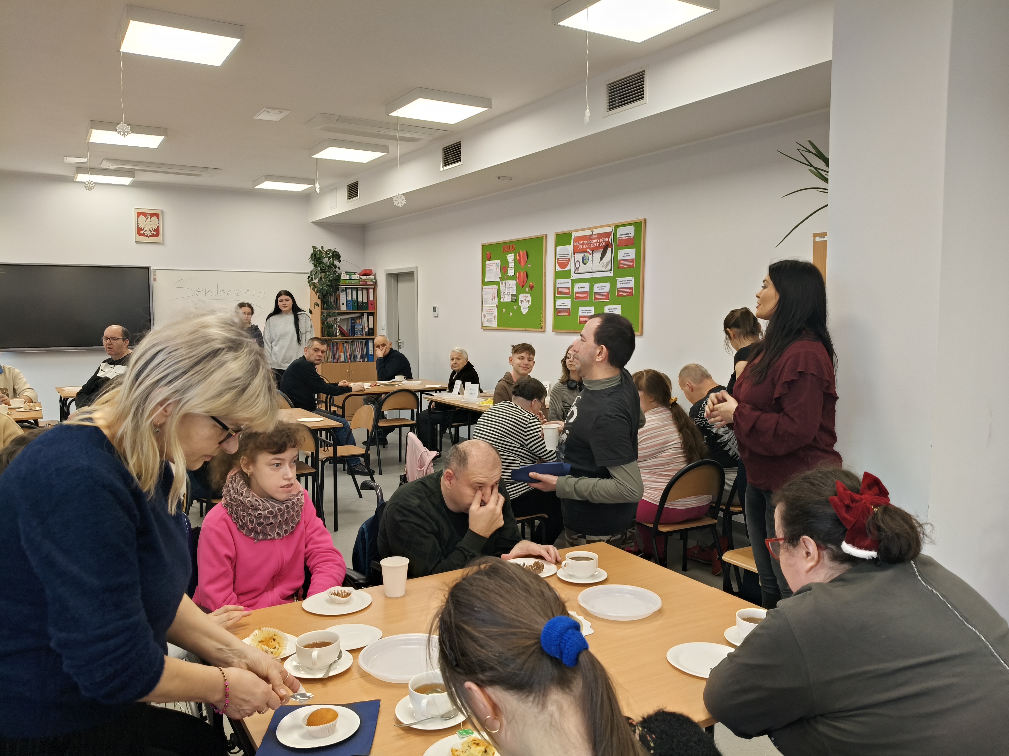 Już od progu zostaliśmy serdecznie powitani i oprowadzeni po placówce, dzięki czemu od razu poczuliśmy się swobodnie i mile widziani. Po zwiedzaniu udaliśmy się do sali lekcyjnej na piętrze, gdzie czekał na nas słodki poczęstunek oraz ulubiona przez wszystkich kawa. W miłej atmosferze rozpoczęliśmy wspólne świętowanie. Każdy z nas otrzymał serduszko ze swoim imieniem, żeby łatwiej było się porozumieć z gospodarzami. Przy wsparciu wolontariuszy bawiliśmy się w komponowanie pizzy przy użyciu elementów z papieru. Po warsztatach plastycznych nastąpiła część artystyczna. Dziewczyny ze Szkoły Podstawowej zachwyciły nas efektownym pokazem akrobatyki sportowej. Dodatkową niespodzianką była autorska piosenka o pizzy, która wywołała uśmiech i gromkie brawa. Po występach razem z wolontariuszami dekorowaliśmy wcześniej przygotowane ciasto różnorodnymi prawdziwymi składnikami, tworząc własne kompozycje smakowe. Następnie nasze pizze trafiły do pieca, a chwilę później na nasze talerze. Smakowały wyśmienicie, zwłaszcza że były przygotowane własnoręcznie. Normalnie palce lizać