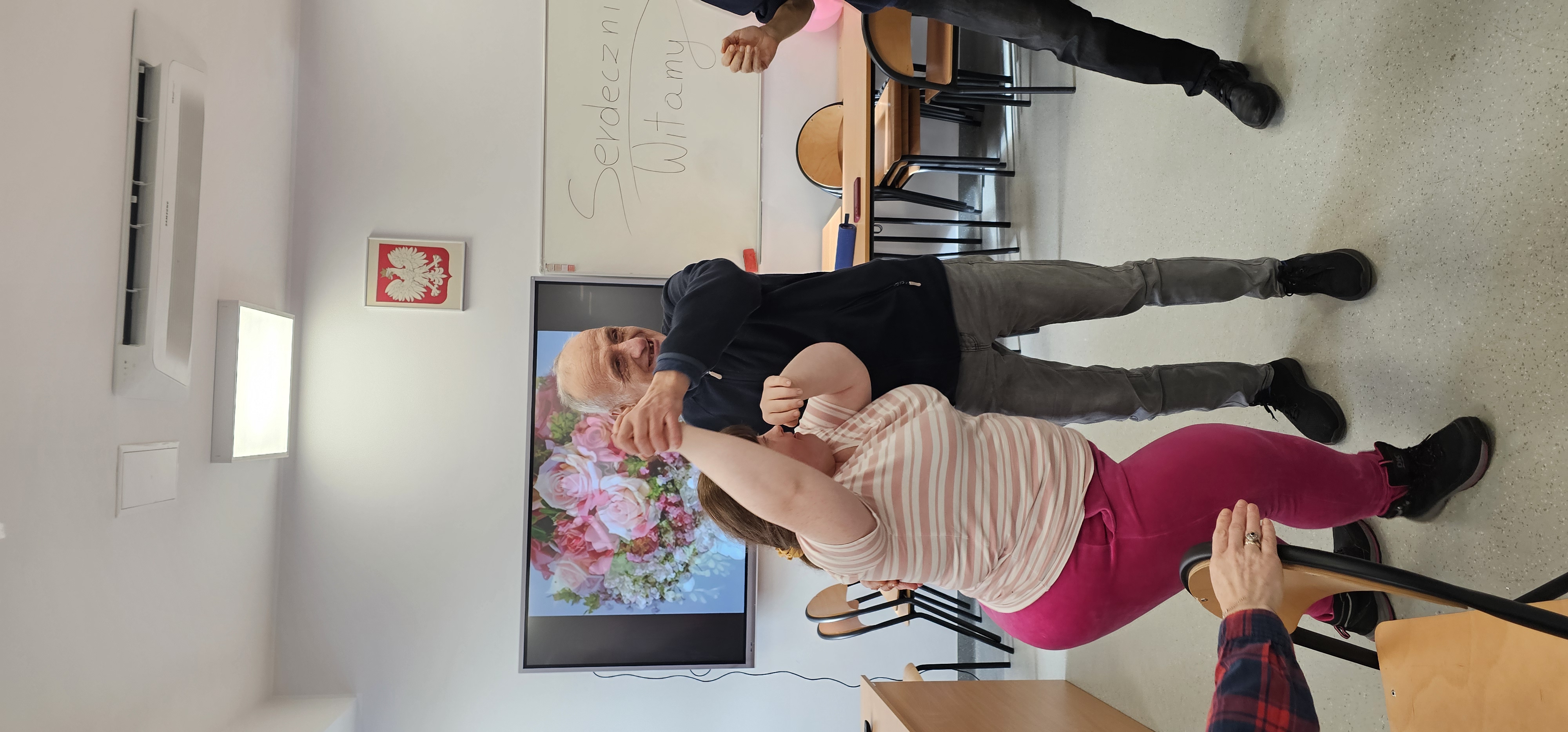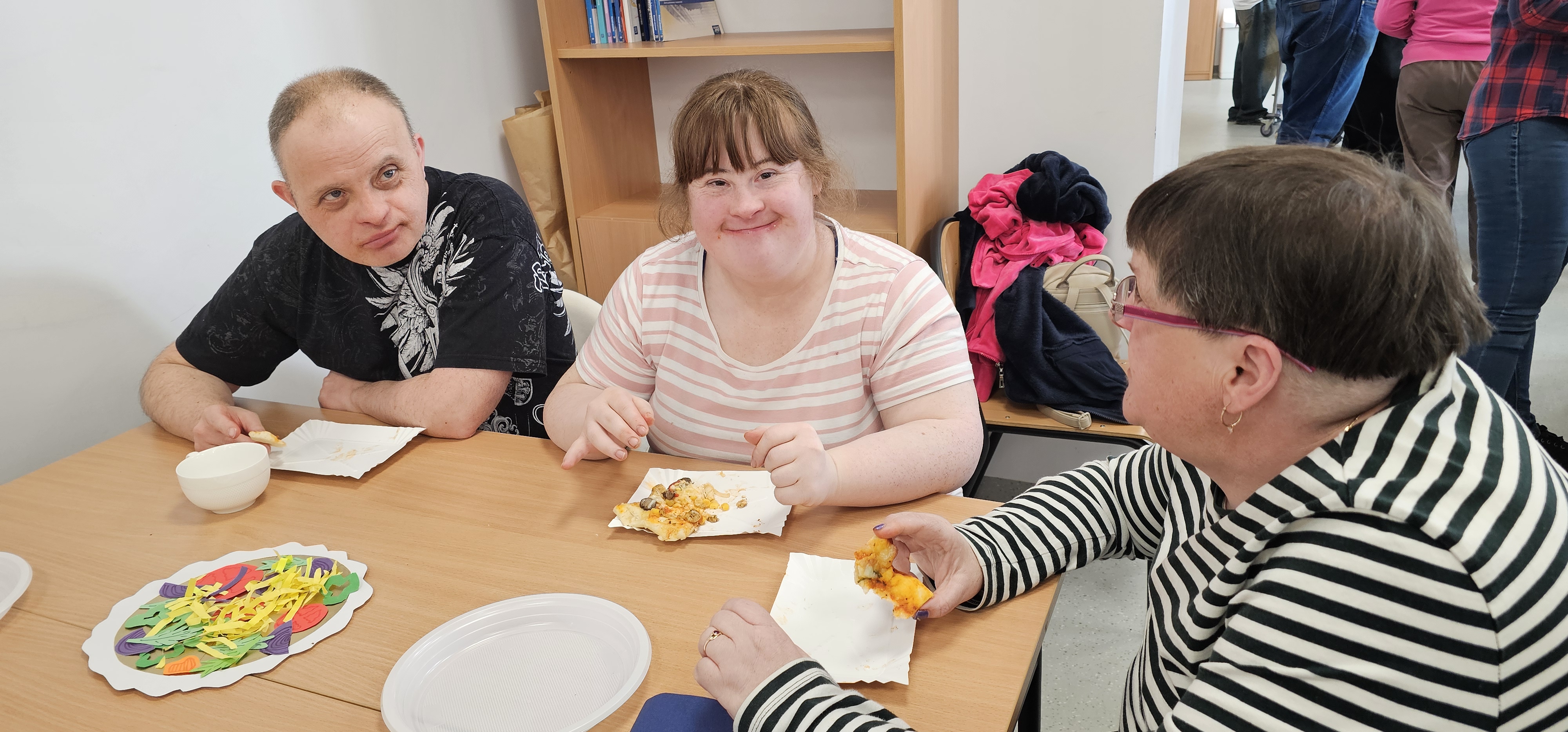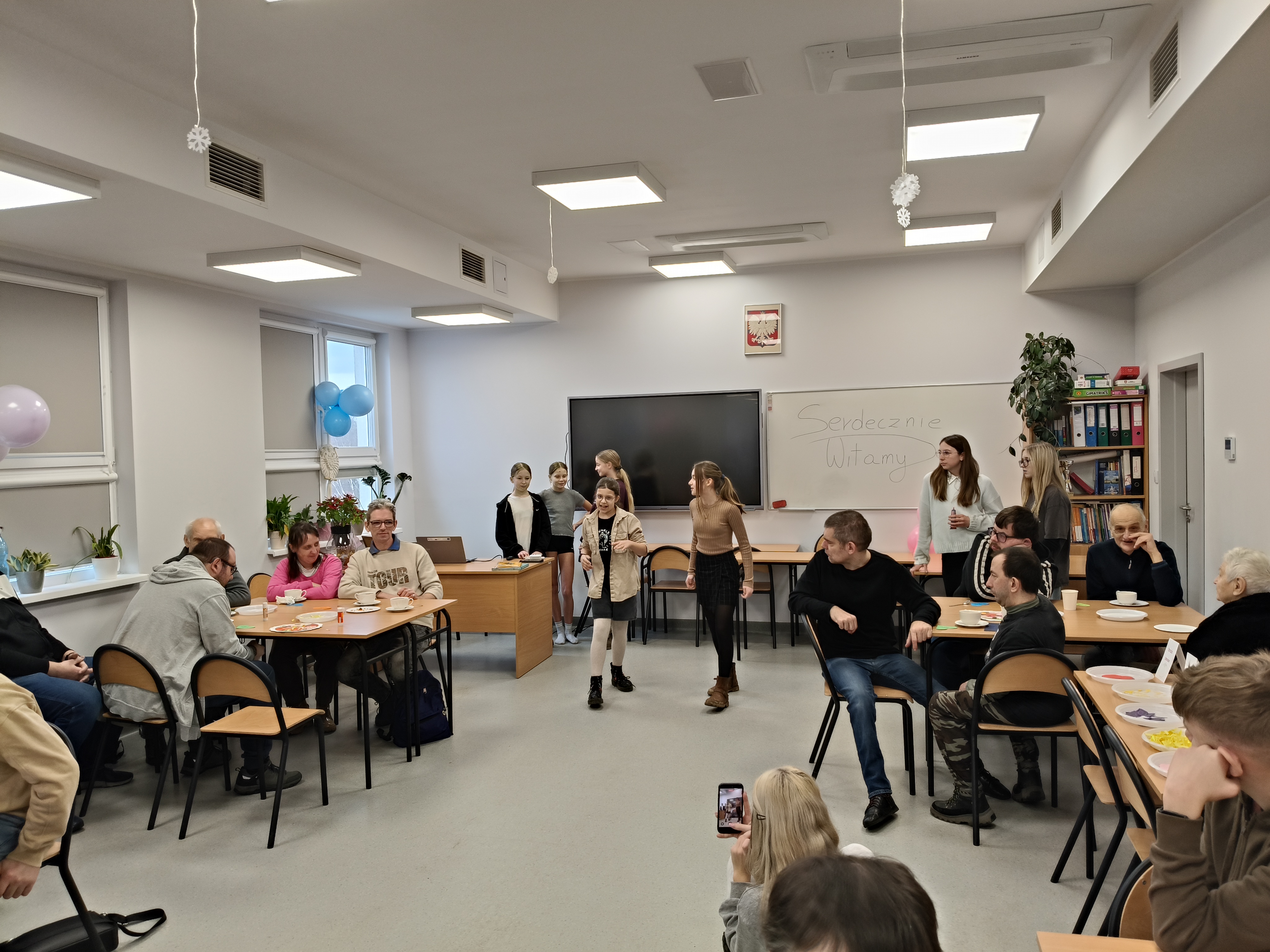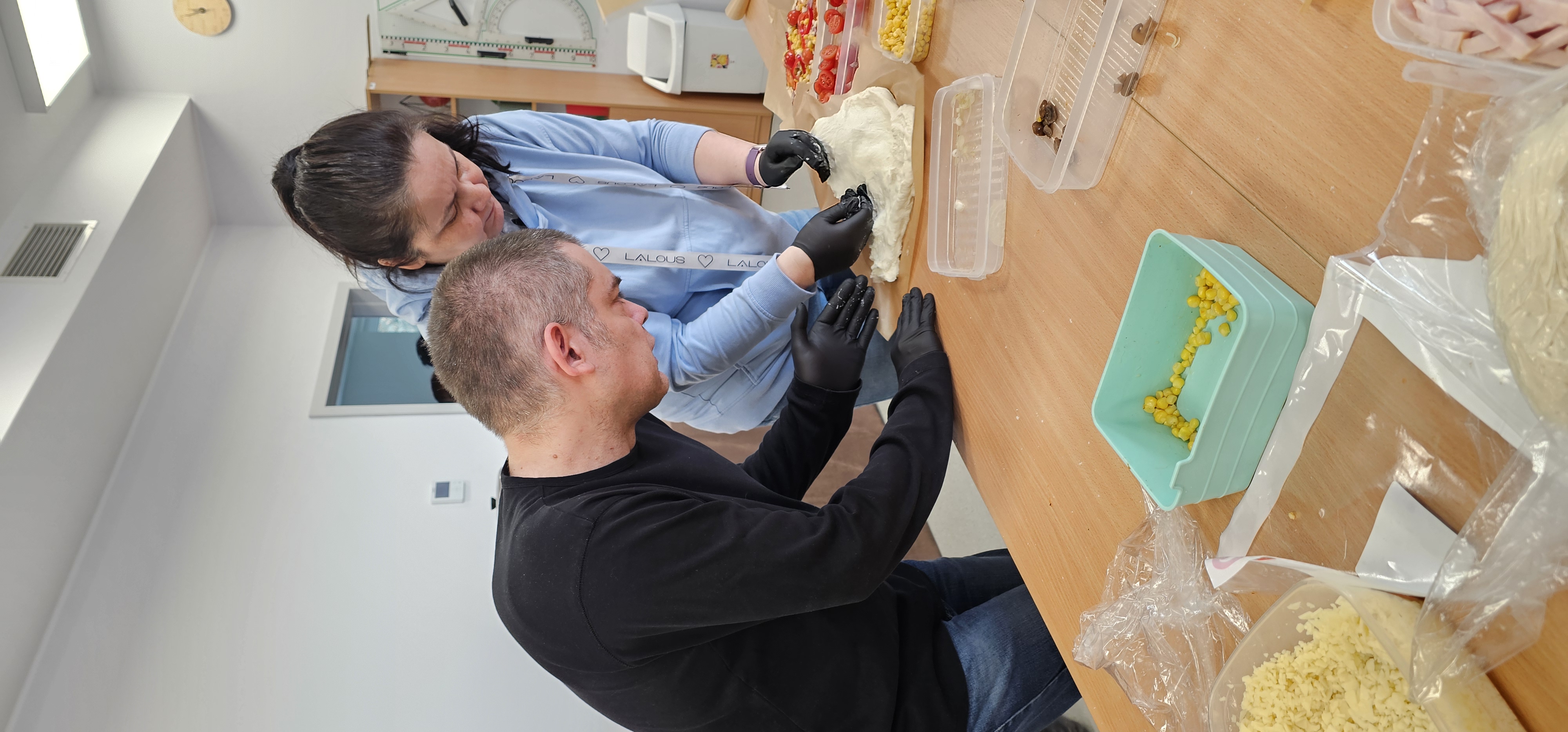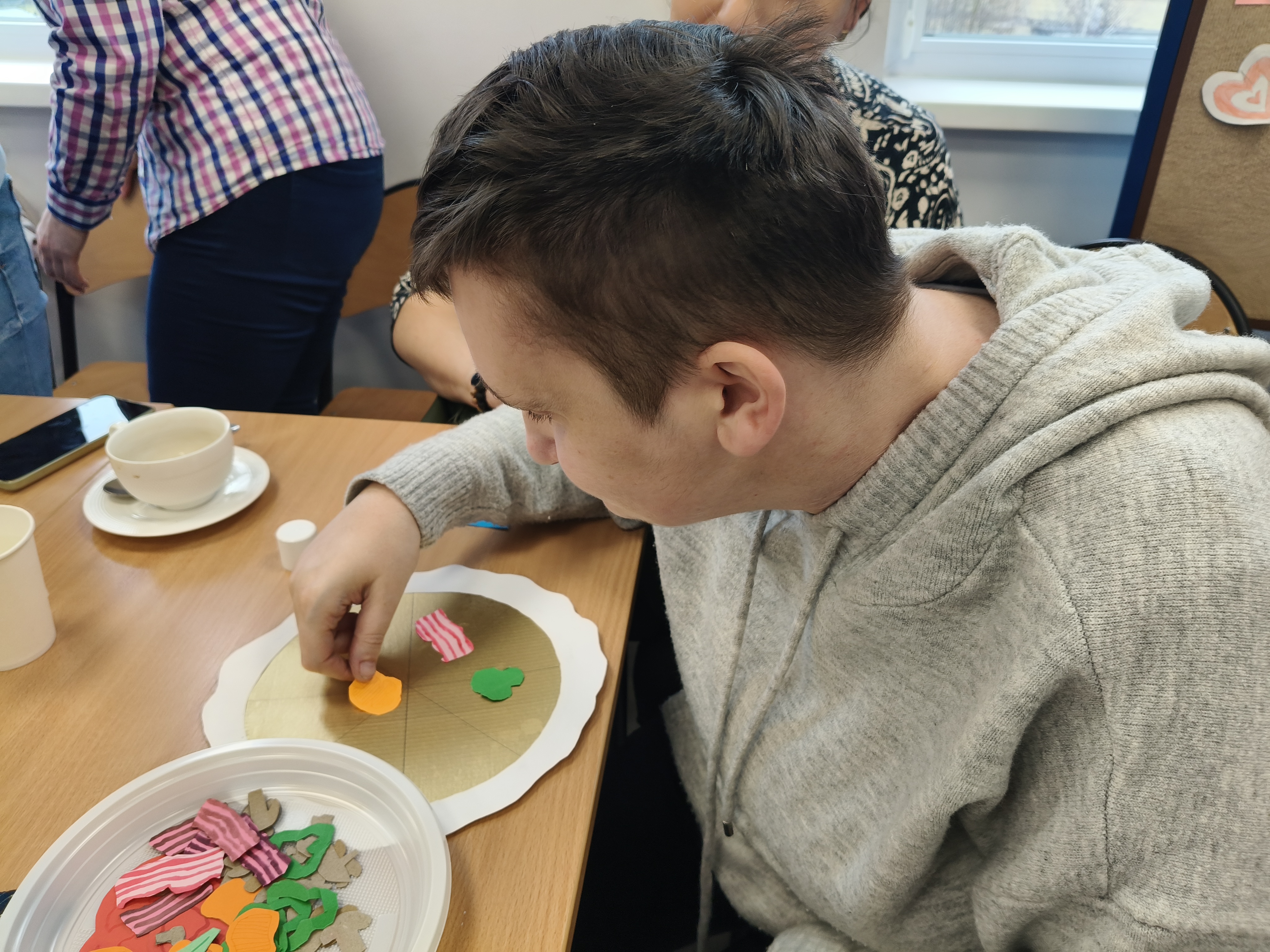 Już od progu zostaliśmy serdecznie powitani i oprowadzeni po placówce, dzięki czemu od razu poczuliśmy się swobodnie i mile widziani. Po zwiedzaniu udaliśmy się do sali lekcyjnej na piętrze, gdzie czekał na nas słodki poczęstunek oraz ulubiona przez wszystkich kawa. W miłej atmosferze rozpoczęliśmy wspólne świętowanie. Każdy z nas otrzymał serduszko ze swoim imieniem, żeby łatwiej było się porozumieć z gospodarzami. Przy wsparciu wolontariuszy bawiliśmy się w komponowanie pizzy przy użyciu elementów z papieru. Po warsztatach plastycznych nastąpiła część artystyczna. Dziewczyny ze Szkoły Podstawowej zachwyciły nas efektownym pokazem akrobatyki sportowej. Dodatkową niespodzianką była autorska piosenka o pizzy, która wywołała uśmiech i gromkie brawa. Po występach razem z wolontariuszami dekorowaliśmy wcześniej przygotowane ciasto różnorodnymi prawdziwymi składnikami, tworząc własne kompozycje smakowe. Następnie nasze pizze trafiły do pieca, a chwilę później na nasze talerze. Smakowały wyśmienicie, zwłaszcza że były przygotowane własnoręcznie. Normalnie palce lizać