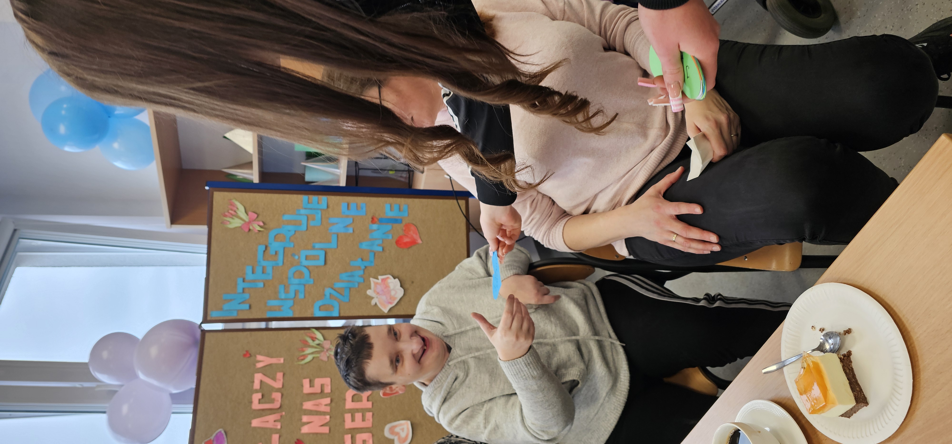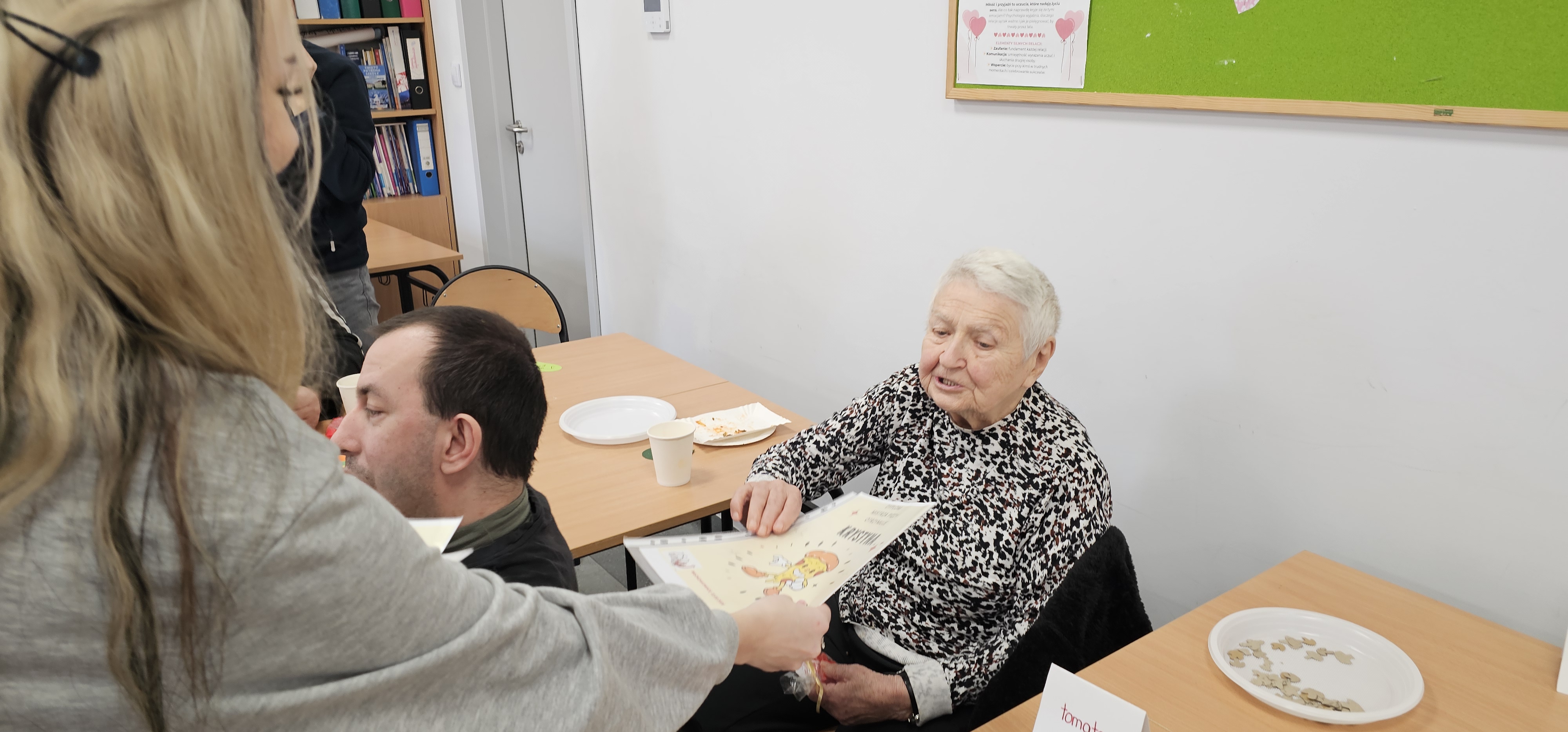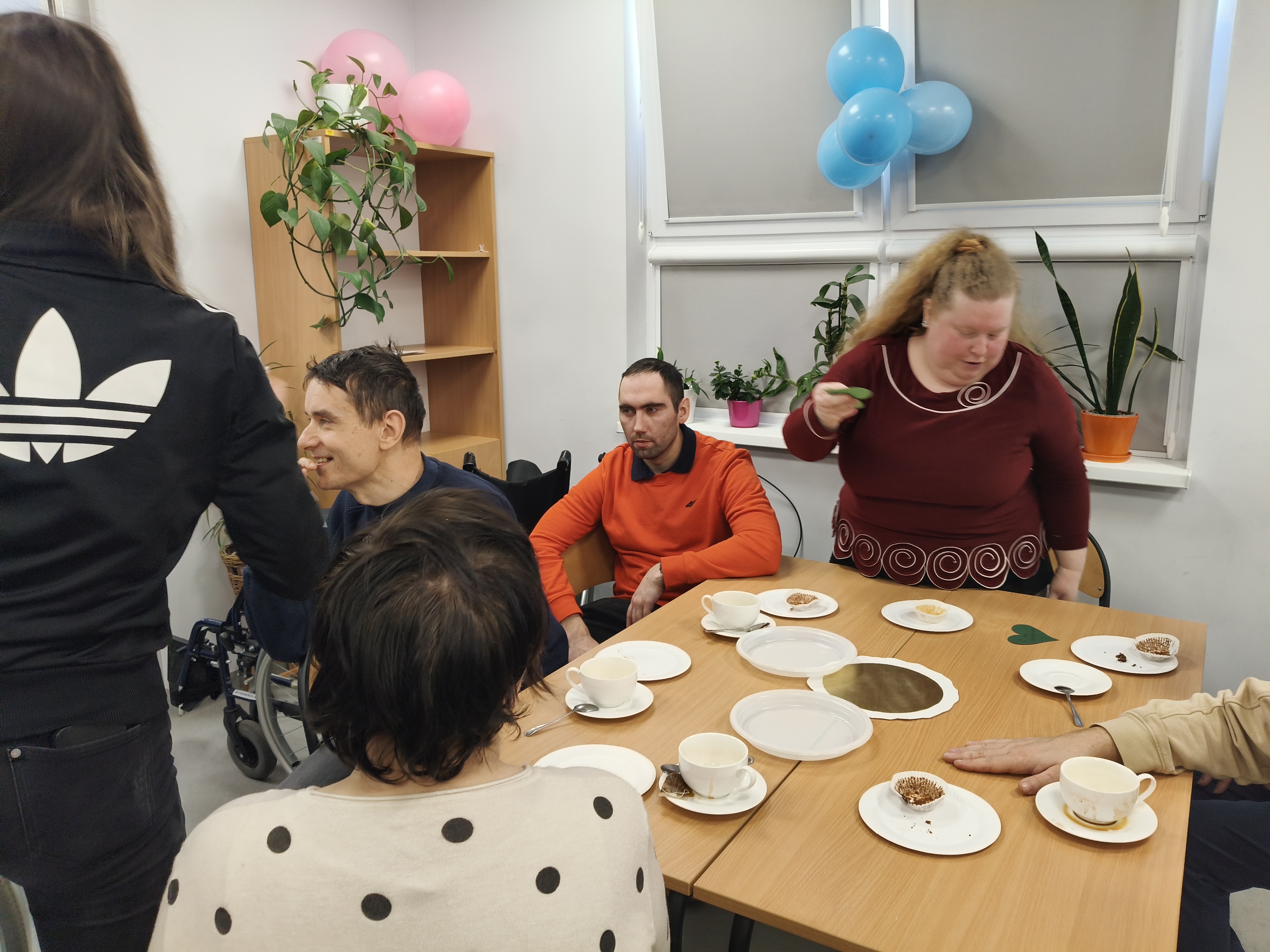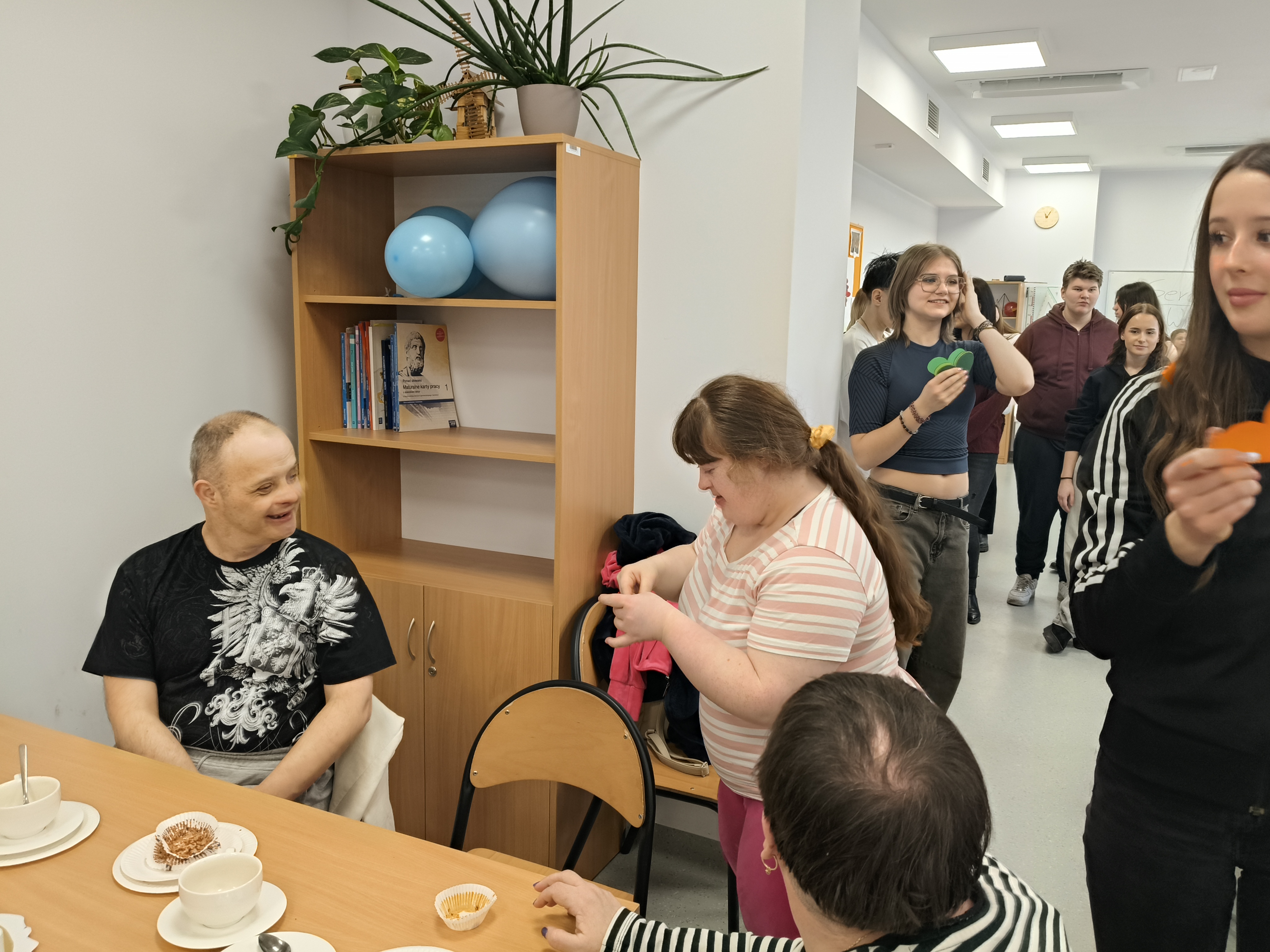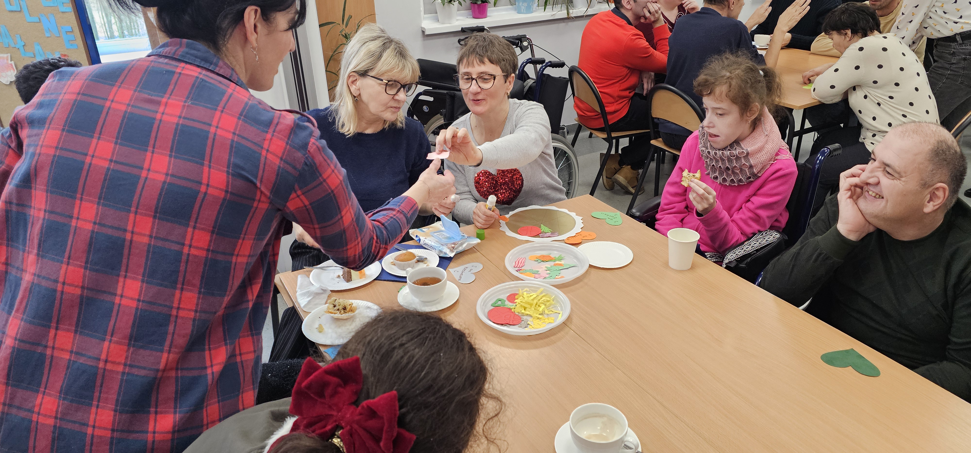 Już od progu zostaliśmy serdecznie powitani i oprowadzeni po placówce, dzięki czemu od razu poczuliśmy się swobodnie i mile widziani. Po zwiedzaniu udaliśmy się do sali lekcyjnej na piętrze, gdzie czekał na nas słodki poczęstunek oraz ulubiona przez wszystkich kawa. W miłej atmosferze rozpoczęliśmy wspólne świętowanie. Każdy z nas otrzymał serduszko ze swoim imieniem, żeby łatwiej było się porozumieć z gospodarzami. Przy wsparciu wolontariuszy bawiliśmy się w komponowanie pizzy przy użyciu elementów z papieru. Po warsztatach plastycznych nastąpiła część artystyczna. Dziewczyny ze Szkoły Podstawowej zachwyciły nas efektownym pokazem akrobatyki sportowej. Dodatkową niespodzianką była autorska piosenka o pizzy, która wywołała uśmiech i gromkie brawa. Po występach razem z wolontariuszami dekorowaliśmy wcześniej przygotowane ciasto różnorodnymi prawdziwymi składnikami, tworząc własne kompozycje smakowe. Następnie nasze pizze trafiły do pieca, a chwilę później na nasze talerze. Smakowały wyśmienicie, zwłaszcza że były przygotowane własnoręcznie. Normalnie palce lizać