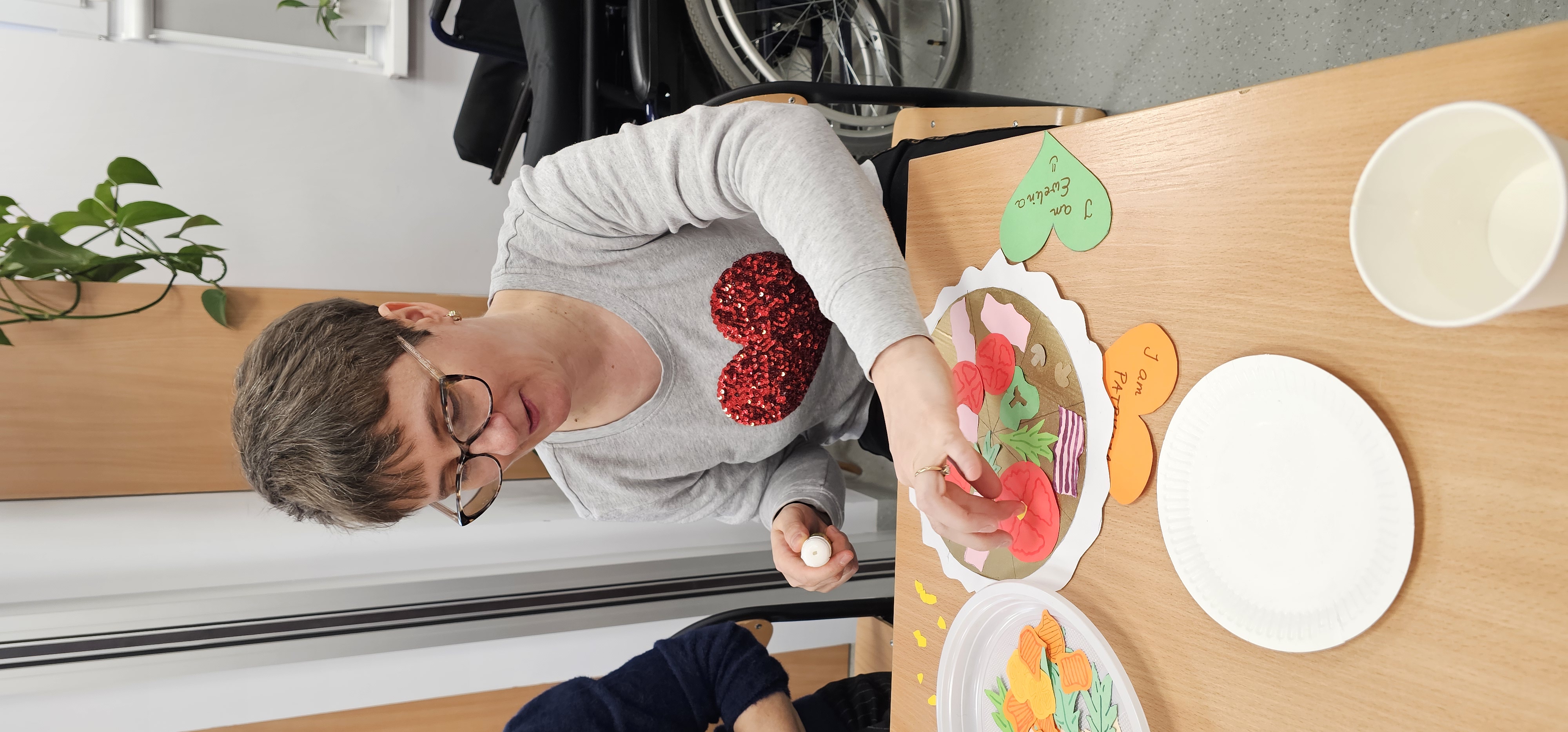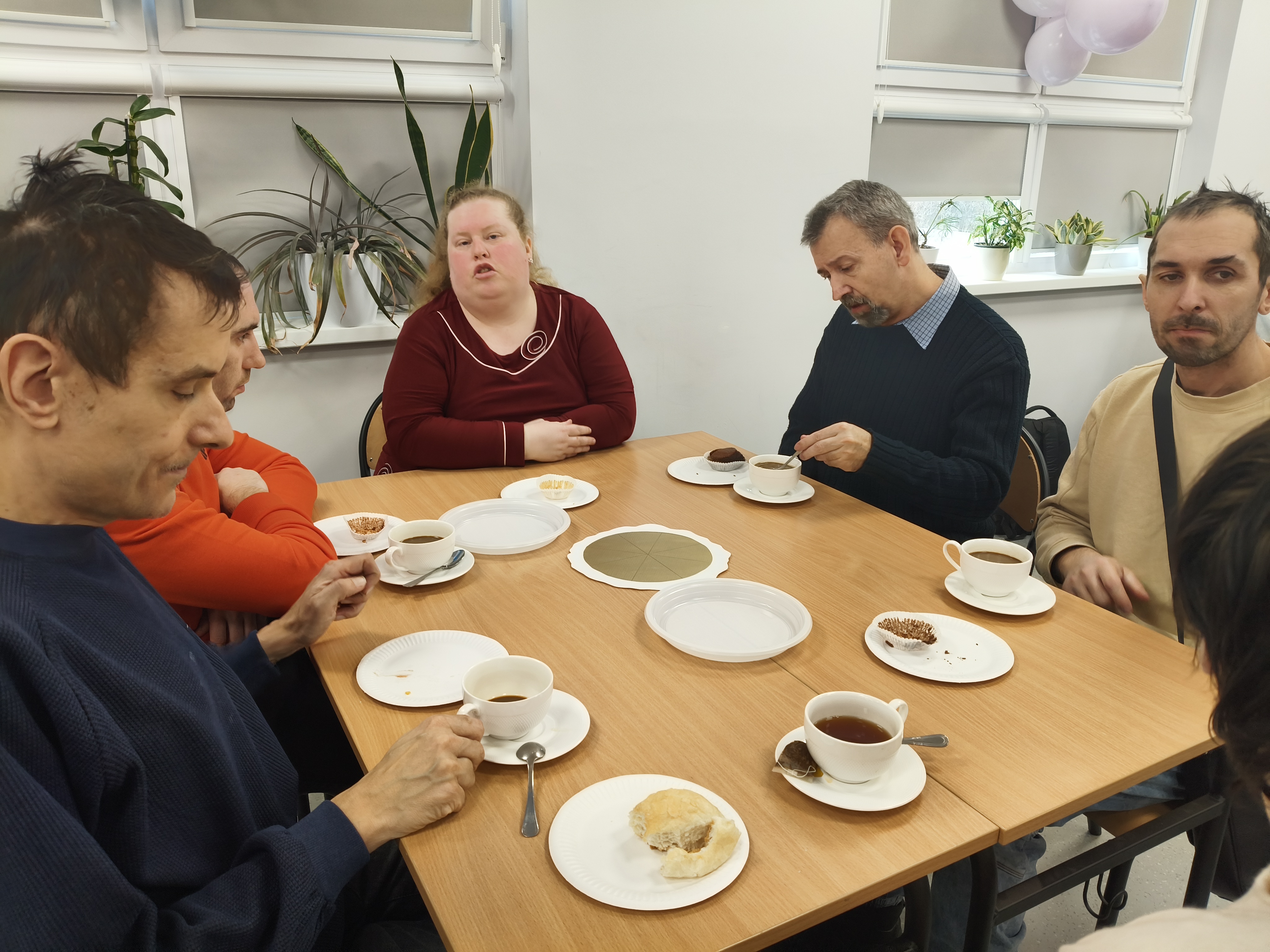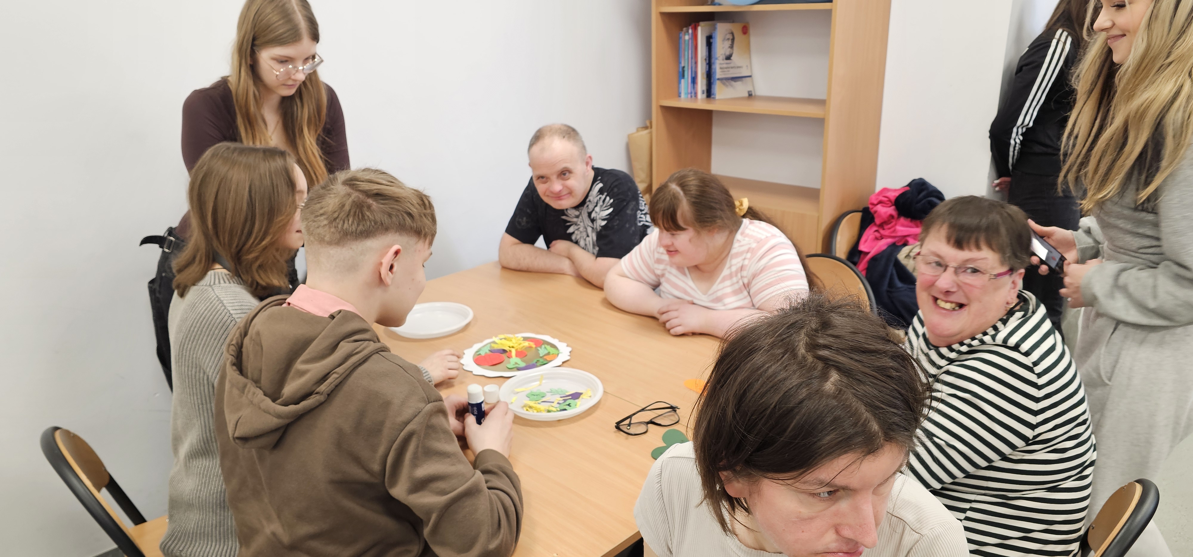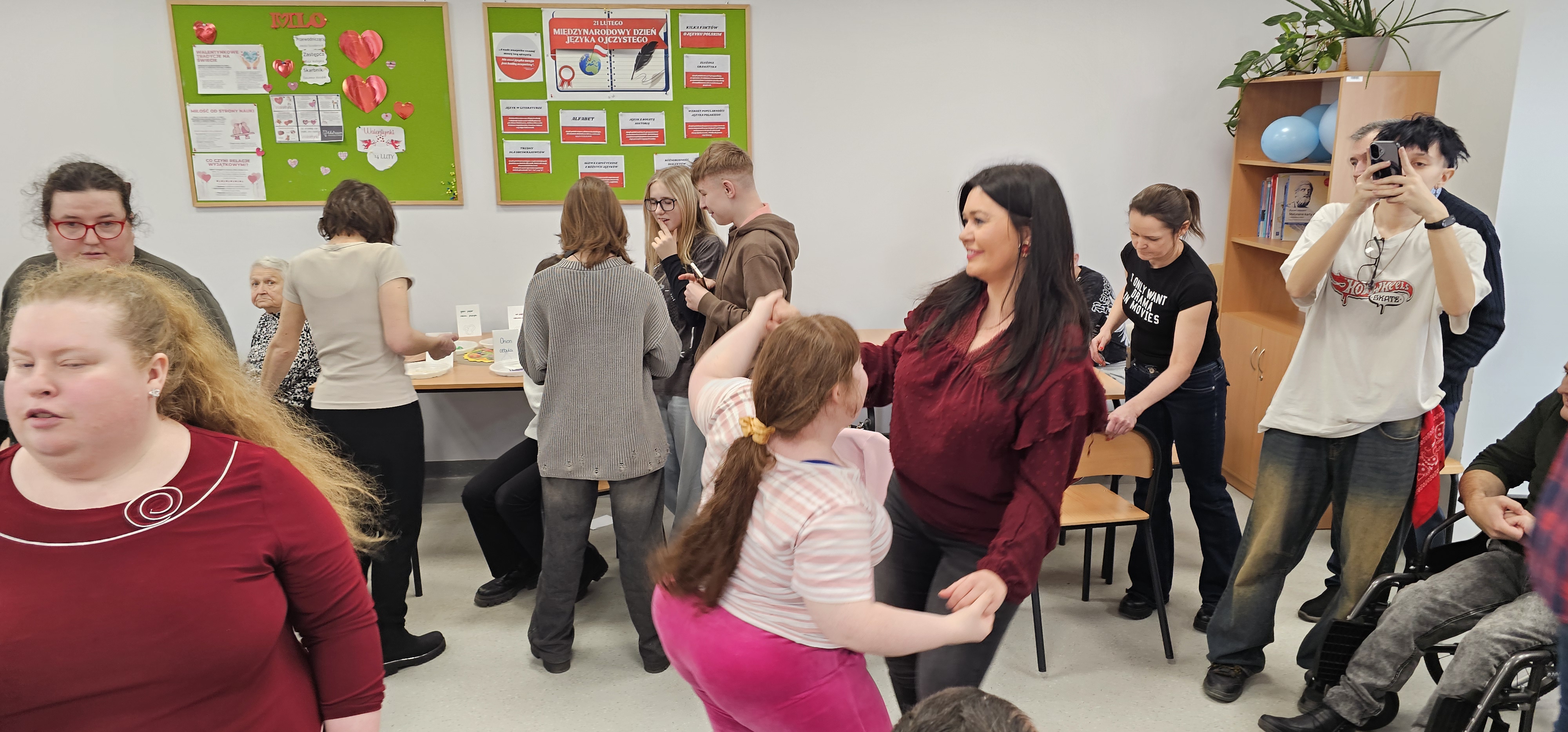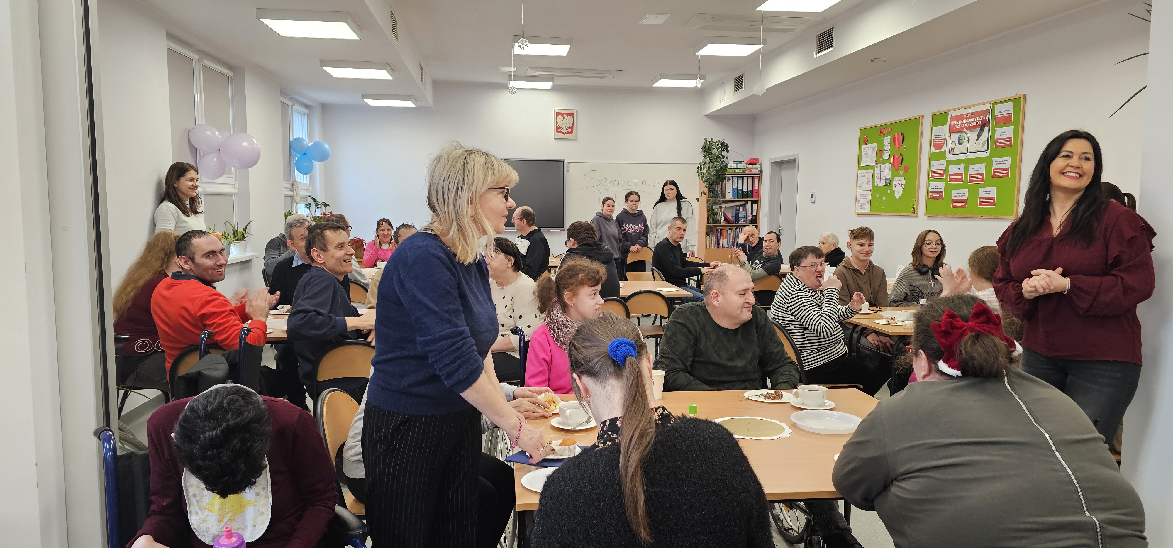 Już od progu zostaliśmy serdecznie powitani i oprowadzeni po placówce, dzięki czemu od razu poczuliśmy się swobodnie i mile widziani. Po zwiedzaniu udaliśmy się do sali lekcyjnej na piętrze, gdzie czekał na nas słodki poczęstunek oraz ulubiona przez wszystkich kawa. W miłej atmosferze rozpoczęliśmy wspólne świętowanie. Każdy z nas otrzymał serduszko ze swoim imieniem, żeby łatwiej było się porozumieć z gospodarzami. Przy wsparciu wolontariuszy bawiliśmy się w komponowanie pizzy przy użyciu elementów z papieru. Po warsztatach plastycznych nastąpiła część artystyczna. Dziewczyny ze Szkoły Podstawowej zachwyciły nas efektownym pokazem akrobatyki sportowej. Dodatkową niespodzianką była autorska piosenka o pizzy, która wywołała uśmiech i gromkie brawa. Po występach razem z wolontariuszami dekorowaliśmy wcześniej przygotowane ciasto różnorodnymi prawdziwymi składnikami, tworząc własne kompozycje smakowe. Następnie nasze pizze trafiły do pieca, a chwilę później na nasze talerze. Smakowały wyśmienicie, zwłaszcza że były przygotowane własnoręcznie. Normalnie palce lizać
