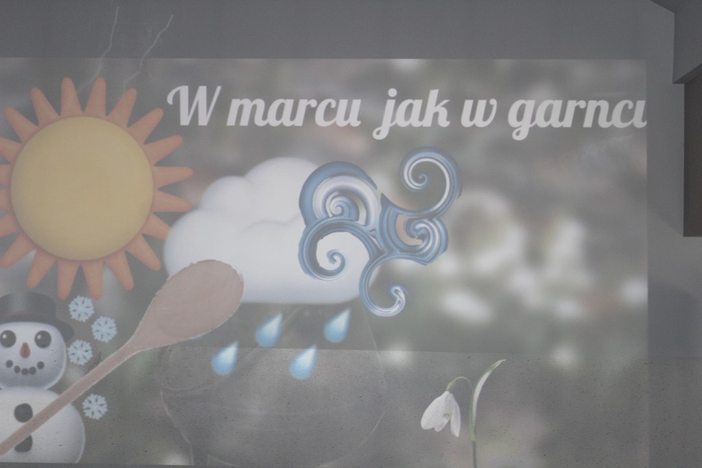 Wprowadzeniem do zajęć był wiersz „Marzec powrócił” Hanny Zdzitowieckiej oraz przypięcie do tablicy obrazów ilustrujących zjawiska pogodowe charakterystyczne dla marca. W drugiej części zajęć zrobiliśmy „zupę pogodową”. Natomiast trzecia część była najzabawniejsza, bo były zabawy z chustą Klanza, zabawy ruchowe z wykorzystaniem naklejek pogodowych, odtwarzanie zjawisk pogodowych przy wykorzystaniu filmów na You Tube, bieg z parasolką w ulewny czas, sudoku oraz mega kolorowanka. To był bardzo ciekawy dzień!