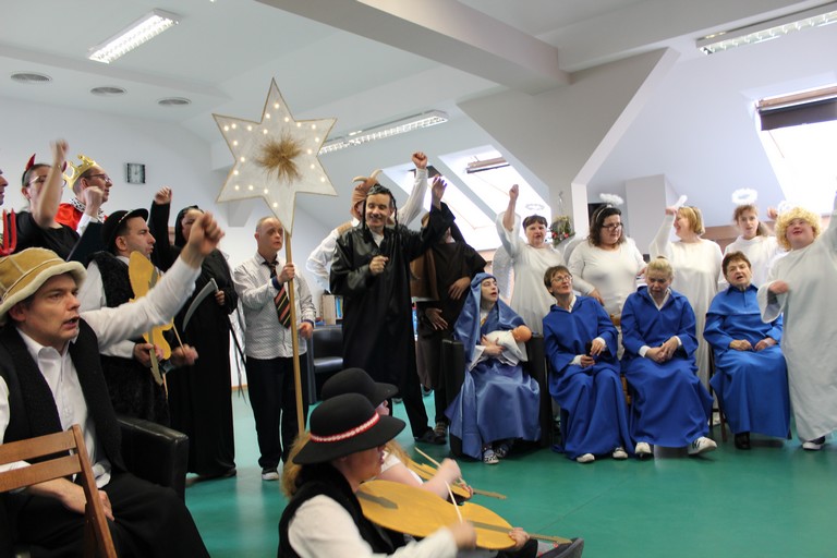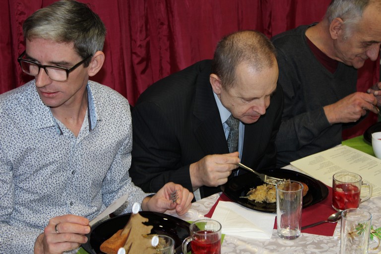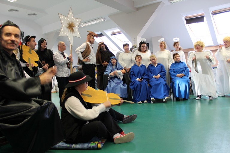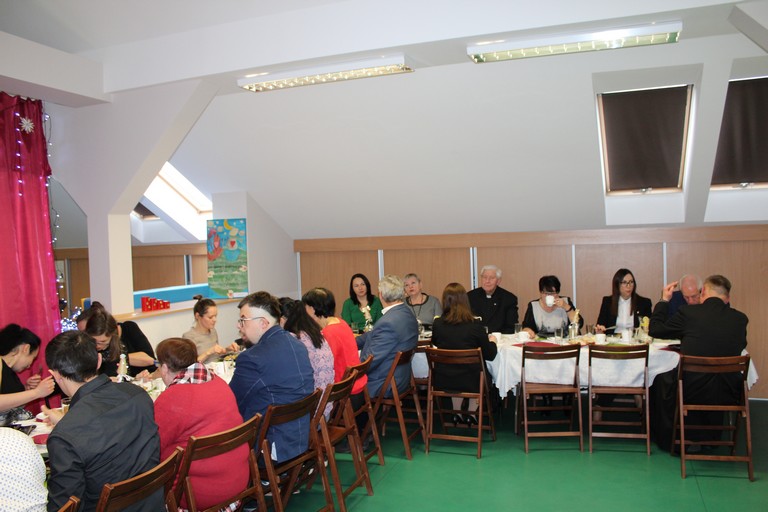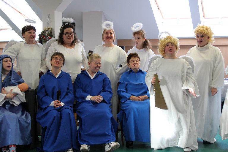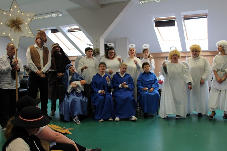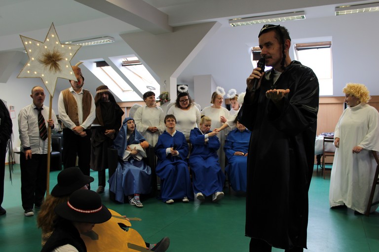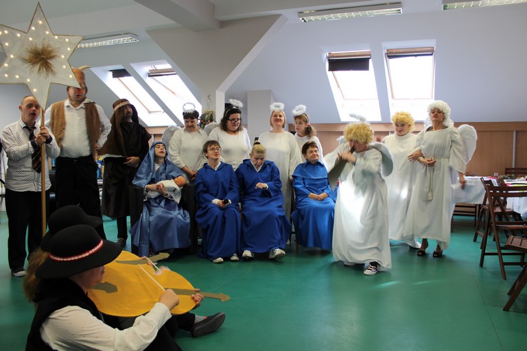 W poniedziałek pani Beata przeprowadziła test wiedzy o zdrowiu i sporcie, podczas którego podzieleni na 3 drużyny: atletów, żeglarzy i pływaków, rozwiązywaliśmy różnego rodzaju tematyczne quizy i zagadki. Wtorek był dniem przygotowania duchowego poprzez spowiedź, której udzielił nam nasz proboszcz ks. Dobroń. Tego dnia obejrzeliśmy również film opowiadający świąteczną historię, oraz przygotowywaliśmy świąteczne potrawy. Środa była czasem największych przygotowań do wigilijnego spotkania. Ustawiliśmy stoły oraz nakryliśmy je, przygotowaliśmy potrawy, odbyliśmy próbę generalną świątecznego przedstawienia. Tego dnia podsumowaliśmy także grudniowe konkursy zorganizowane w ramach programu Rady Domu takie jak : „Jesień w moich oczach” oraz „Świąteczne tradycje – kartka bożonarodzeniowa”. W czwartek, dzień Wigilii w naszym Domu spotkaliśmy się przy wspólnym stole. Na uroczystość przybyli także zaproszeni goście w osobach pani Haliny Florek – członkini Zarządu Powiatu Leszczyńskiego oraz Fundacji „Jesteśmy – więc pomagamy”, pana Roberta Kasperczaka – Wójta Gminy Włoszakowice, pani Karoliny Chlebowskiej – Sekretarz Gminy Włoszakowice, ks. proboszcza Zbigniewa Dobronia, ks. kan. Andrzeja Szulca, pani Marioli Żołędziejewskiej – byłej kierownik ŚDS oraz pani Magdaleny Spławskiej – przedstawicielki Rady Rodzin. Uroczystość rozpoczęła się od powitania wszystkich przybyłych przez panią kierownik, po czym ks. proboszcz Zbigniew Dobroń odprawił krótkie nabożeństwo. Następnie pani kierownik oraz pan Wójt złożyli wszystkim życzenia świąteczne, a po krótkiej modlitwie wszyscy zasiedli do stołu. Kolejnym punktem programu było przedstawienie „Kolędnicy” w wykonaniu grupy uczestników i kadry ŚDS przygotowanych przez p. Aleksandrę Zając z aktywnym udziałem wszystkich zebranych, którzy mieli okazję pośpiewać razem z kolędnikami. Spotkanie zwieńczyła wspólna kawa przy cieście przygotowanym przez uczestników ŚDS, rodziców i opiekunów. Wszyscy goście w podziękowaniu za to, że znaleźli czas, by być z nami w tak szczególnym dniu otrzymali drobny upominek w postaci ręcznie wykonanych podczas terapii makramowych ozdób na choinkę.