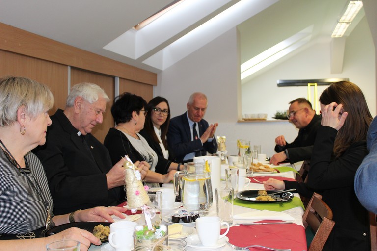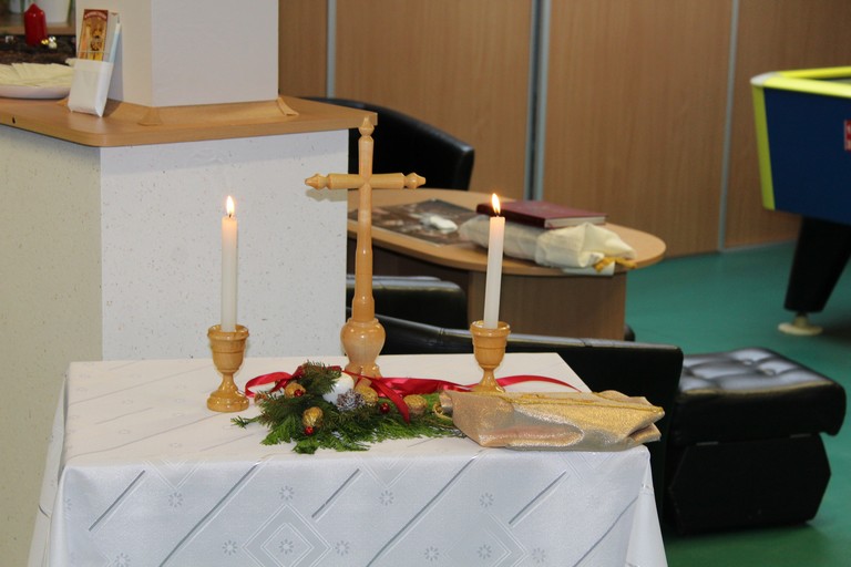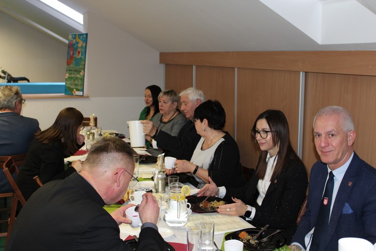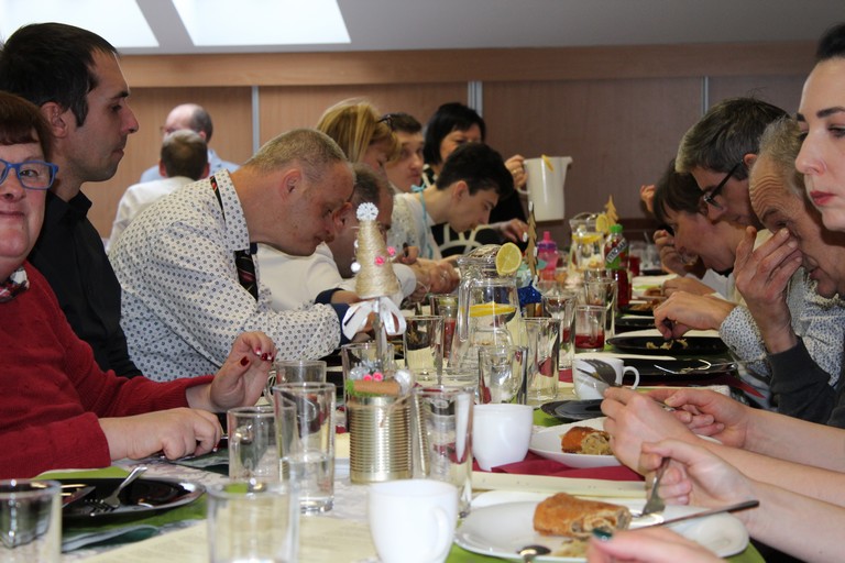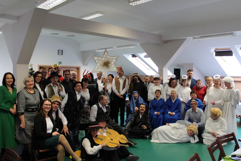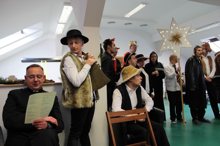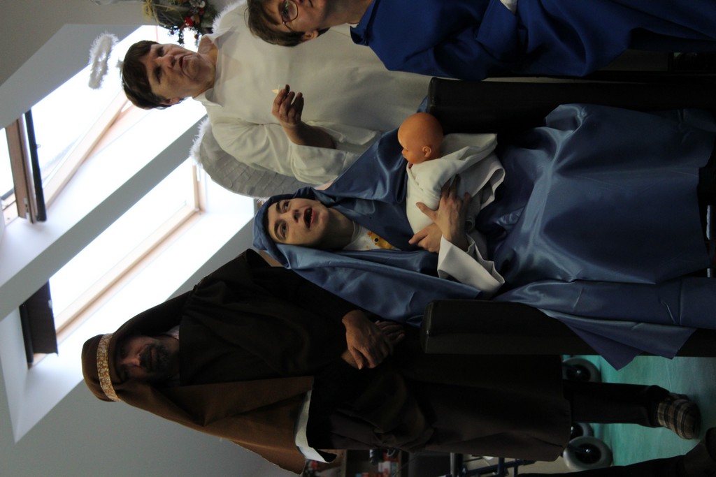 W poniedziałek pani Beata przeprowadziła test wiedzy o zdrowiu i sporcie, podczas którego podzieleni na 3 drużyny: atletów, żeglarzy i pływaków, rozwiązywaliśmy różnego rodzaju tematyczne quizy i zagadki. Wtorek był dniem przygotowania duchowego poprzez spowiedź, której udzielił nam nasz proboszcz ks. Dobroń. Tego dnia obejrzeliśmy również film opowiadający świąteczną historię, oraz przygotowywaliśmy świąteczne potrawy. Środa była czasem największych przygotowań do wigilijnego spotkania. Ustawiliśmy stoły oraz nakryliśmy je, przygotowaliśmy potrawy, odbyliśmy próbę generalną świątecznego przedstawienia. Tego dnia podsumowaliśmy także grudniowe konkursy zorganizowane w ramach programu Rady Domu takie jak : „Jesień w moich oczach” oraz „Świąteczne tradycje – kartka bożonarodzeniowa”. W czwartek, dzień Wigilii w naszym Domu spotkaliśmy się przy wspólnym stole. Na uroczystość przybyli także zaproszeni goście w osobach pani Haliny Florek – członkini Zarządu Powiatu Leszczyńskiego oraz Fundacji „Jesteśmy – więc pomagamy”, pana Roberta Kasperczaka – Wójta Gminy Włoszakowice, pani Karoliny Chlebowskiej – Sekretarz Gminy Włoszakowice, ks. proboszcza Zbigniewa Dobronia, ks. kan. Andrzeja Szulca, pani Marioli Żołędziejewskiej – byłej kierownik ŚDS oraz pani Magdaleny Spławskiej – przedstawicielki Rady Rodzin. Uroczystość rozpoczęła się od powitania wszystkich przybyłych przez panią kierownik, po czym ks. proboszcz Zbigniew Dobroń odprawił krótkie nabożeństwo. Następnie pani kierownik oraz pan Wójt złożyli wszystkim życzenia świąteczne, a po krótkiej modlitwie wszyscy zasiedli do stołu. Kolejnym punktem programu było przedstawienie „Kolędnicy” w wykonaniu grupy uczestników i kadry ŚDS przygotowanych przez p. Aleksandrę Zając z aktywnym udziałem wszystkich zebranych, którzy mieli okazję pośpiewać razem z kolędnikami. Spotkanie zwieńczyła wspólna kawa przy cieście przygotowanym przez uczestników ŚDS, rodziców i opiekunów. Wszyscy goście w podziękowaniu za to, że znaleźli czas, by być z nami w tak szczególnym dniu otrzymali drobny upominek w postaci ręcznie wykonanych podczas terapii makramowych ozdób na choinkę.