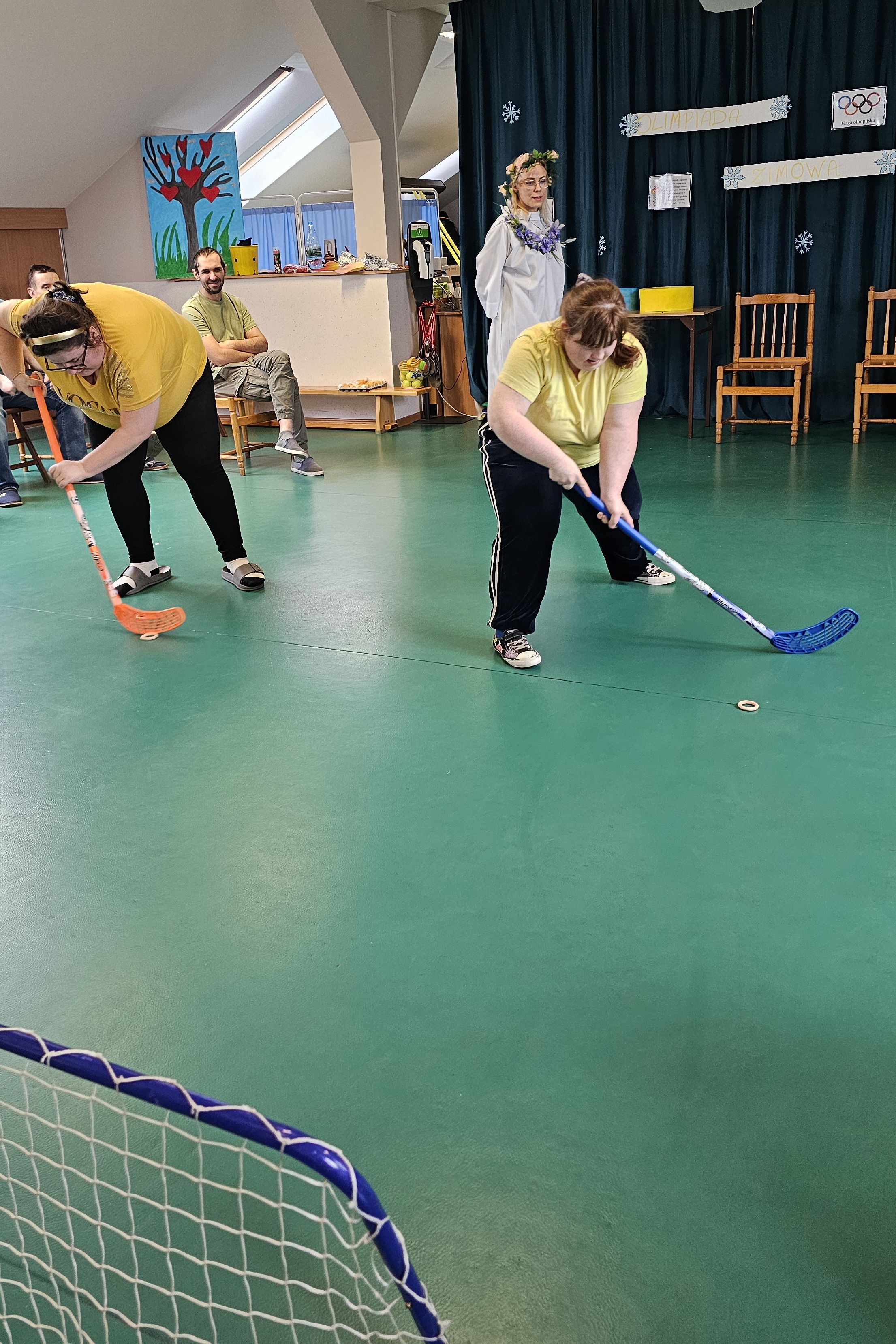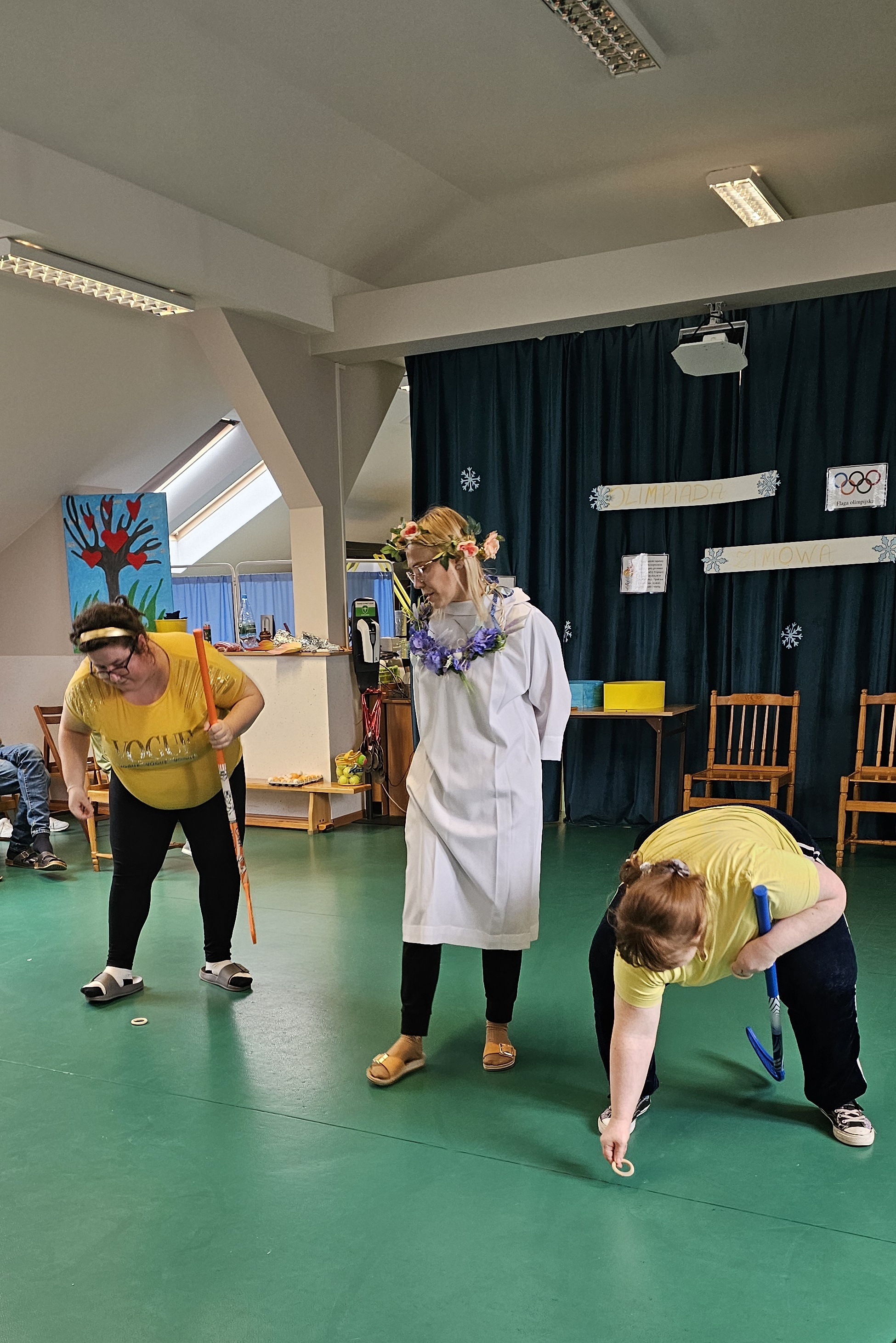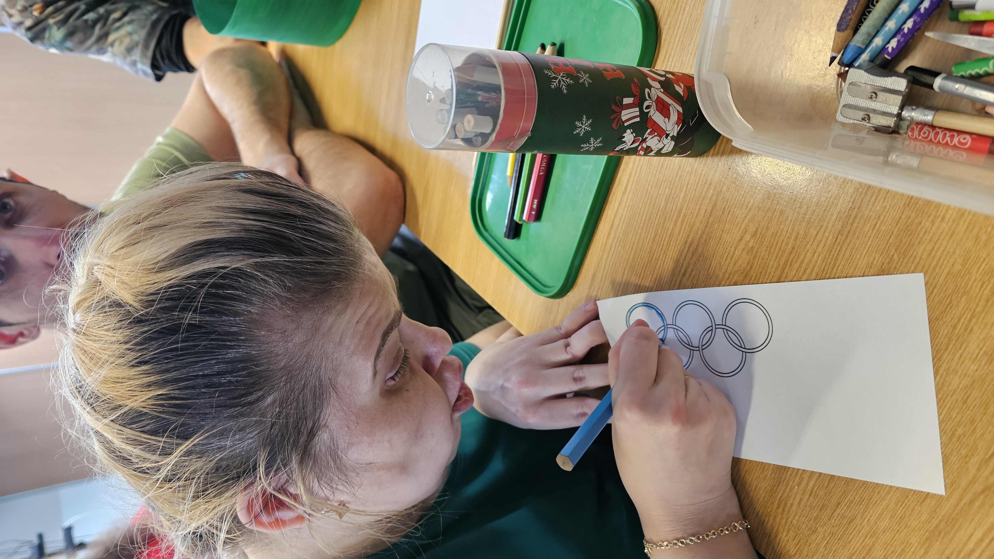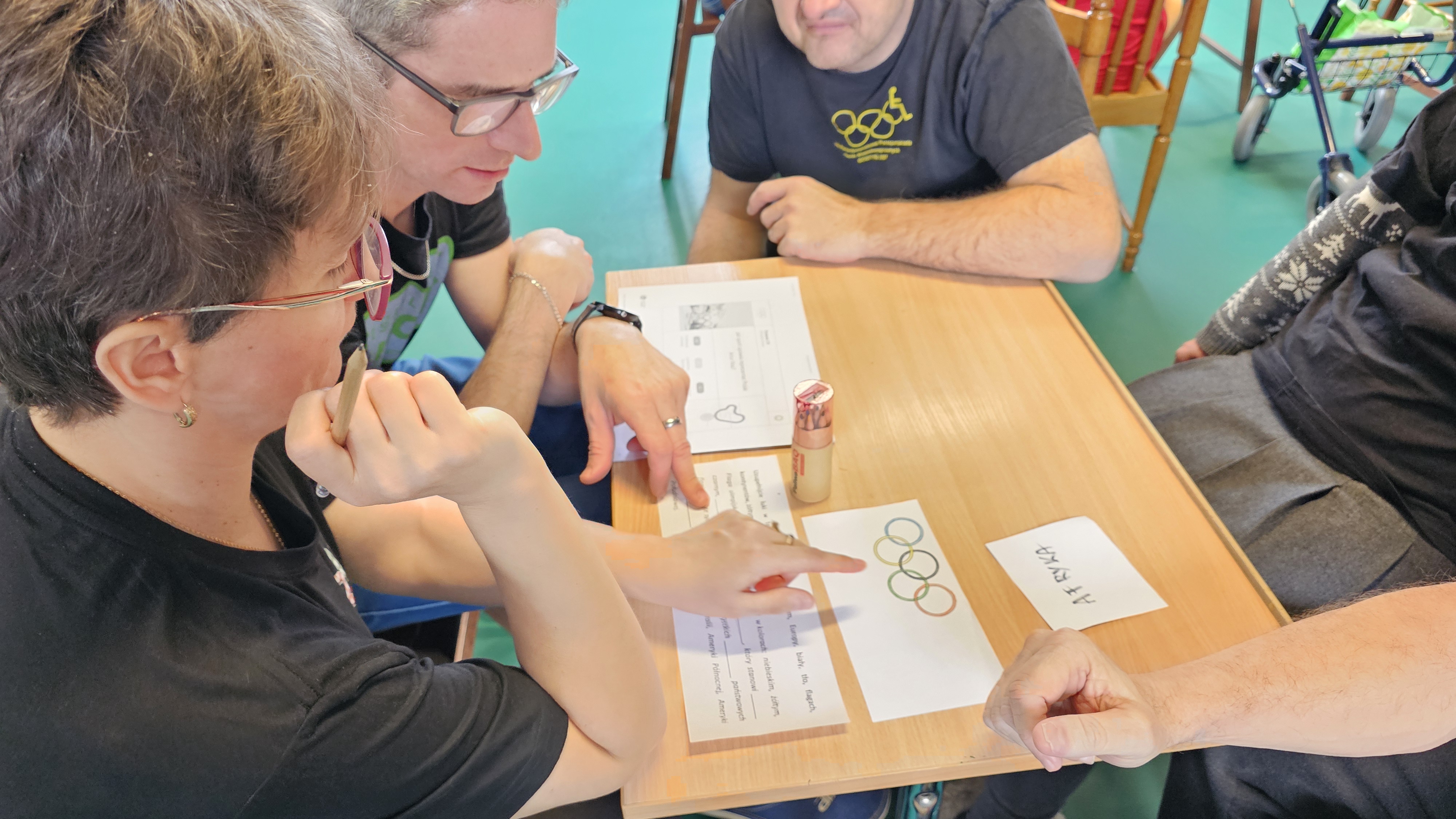 Najpierw było trochę teorii, żebyśmy sobie przypomnieli na czym polega olimpiada i jakie są jej symbole. Zostaliśmy podzieleni na 5 drużyn i ubrani w koszulki w kolorach kół olimpijskich, które splecione ze sobą reprezentują pięć kontynentów świata, połączonych ideą olimpijską. Każda drużyna reprezentowała zatem inny kontynent. Swoją wiedzę mogliśmy sprawdzić rozwiązując quizy i za pomocą kolorowanki. Olimpiada to jednak przede wszystkim sport i rywalizacja, więc był bieg z ogniem olimpijskim, saneczkarstwo i hokej. Zabawa była świetna! Dziękujemy pani Beacie za tą sportową rozrywkę![]()
