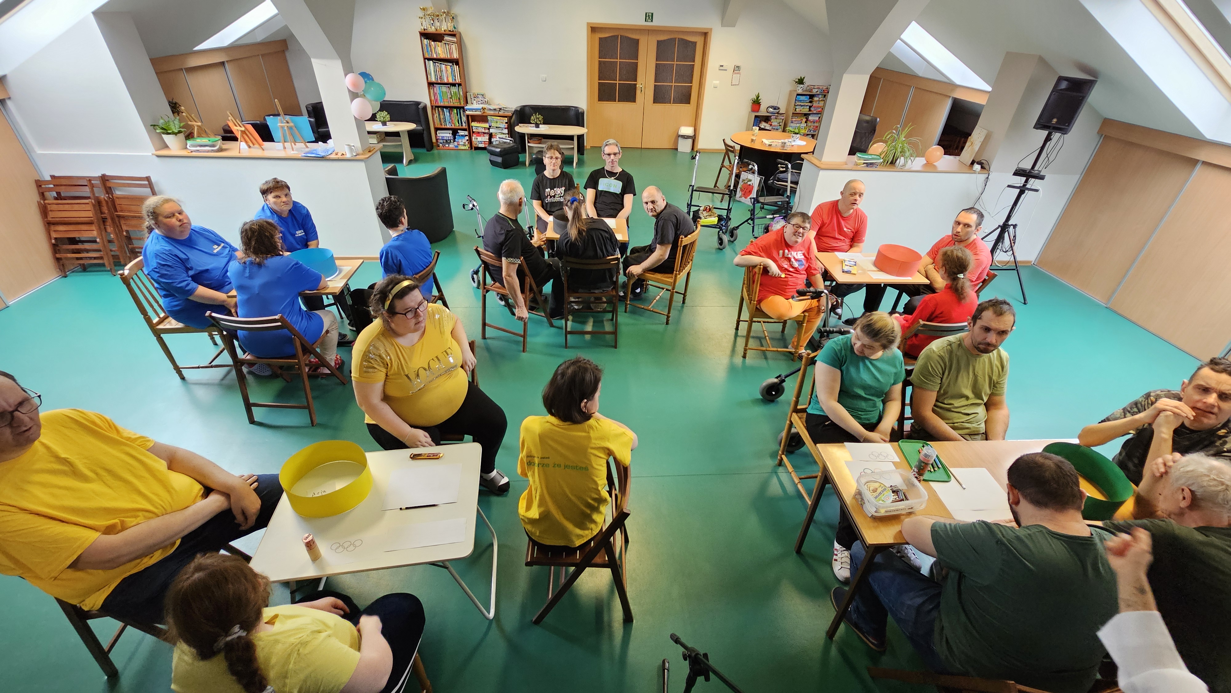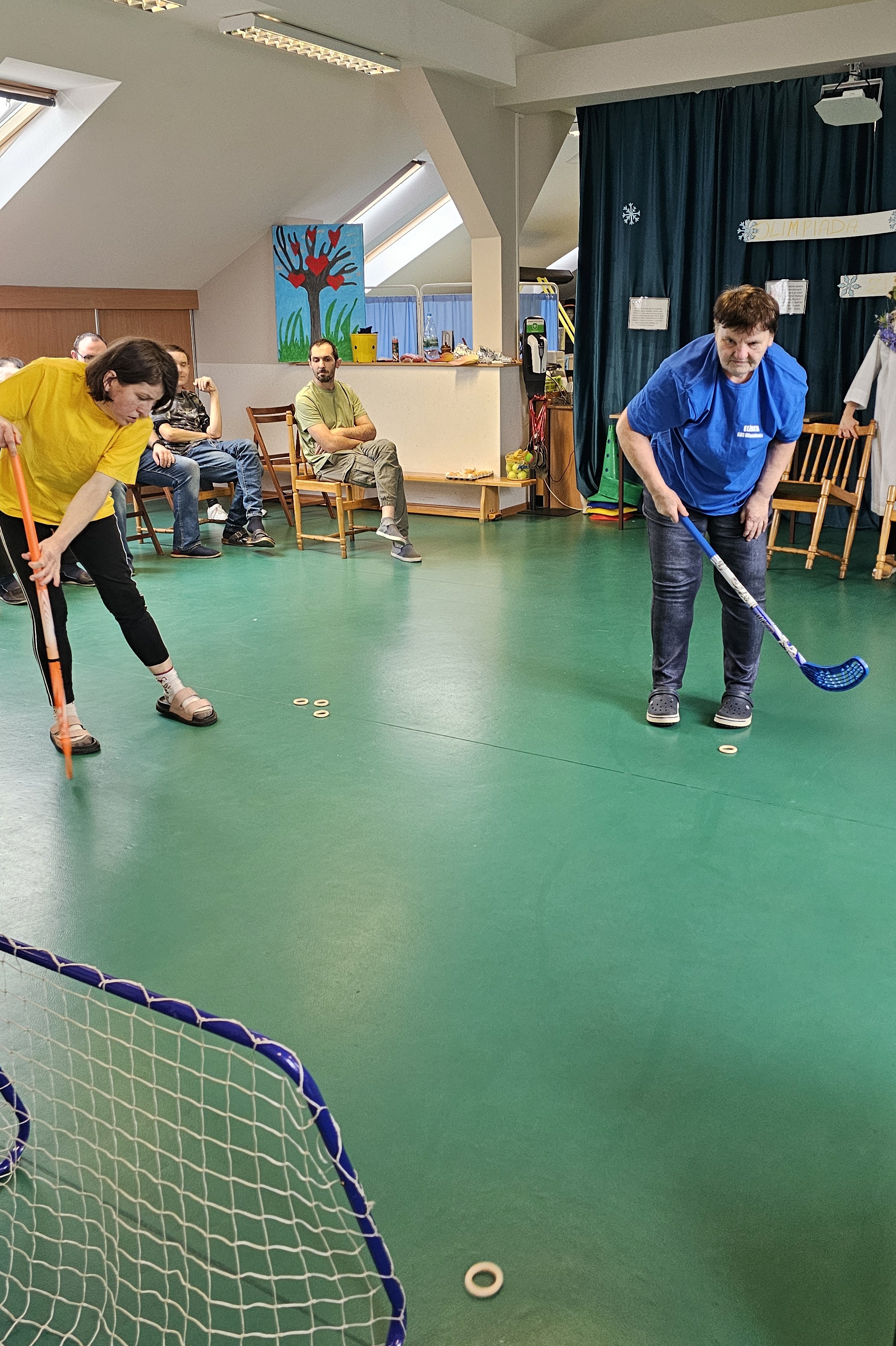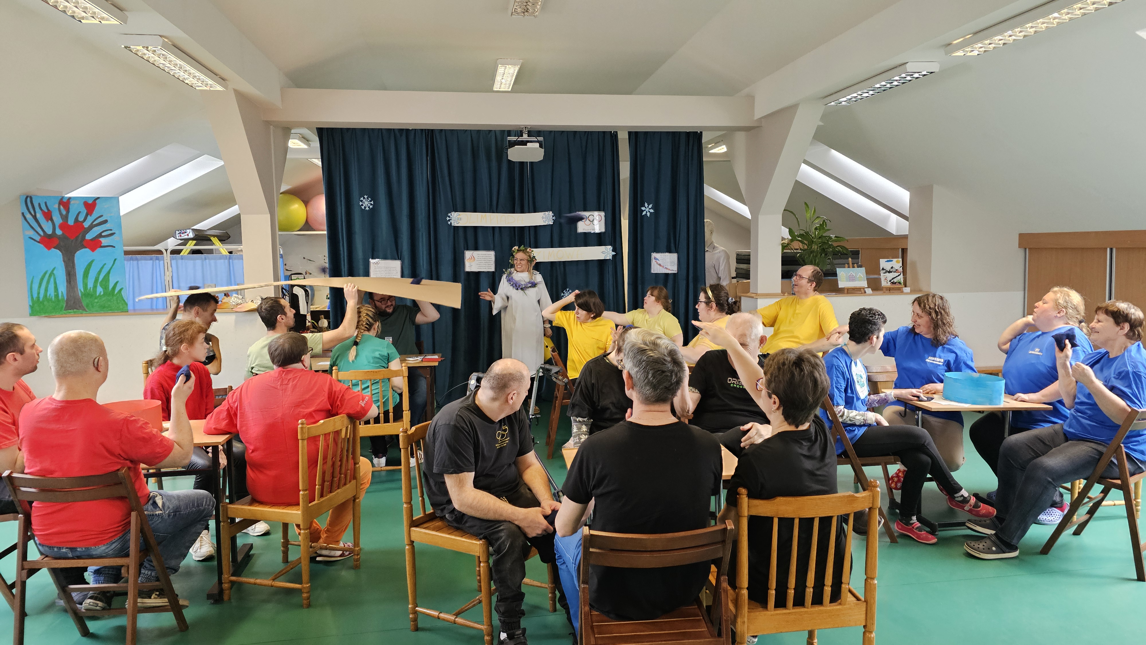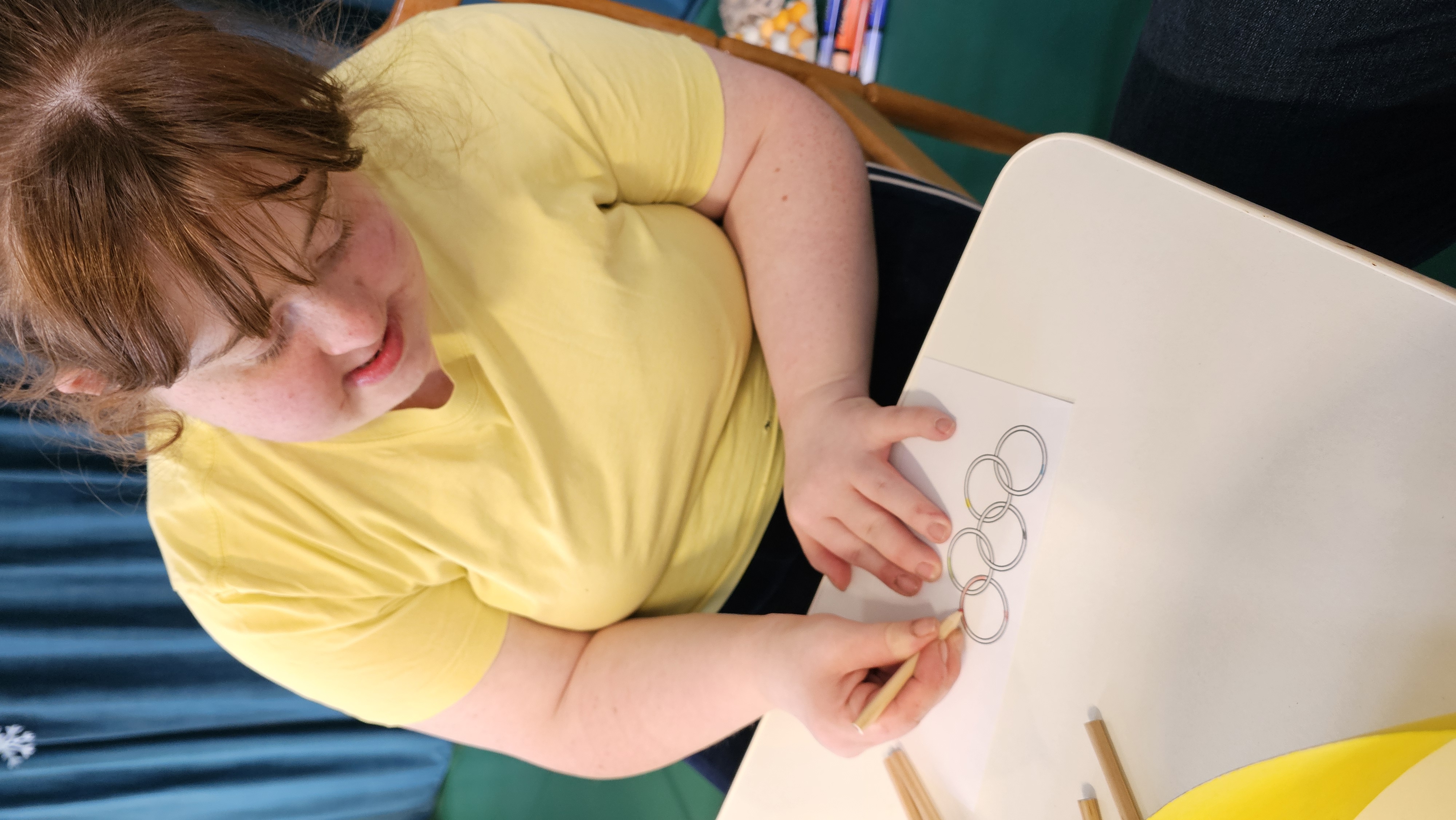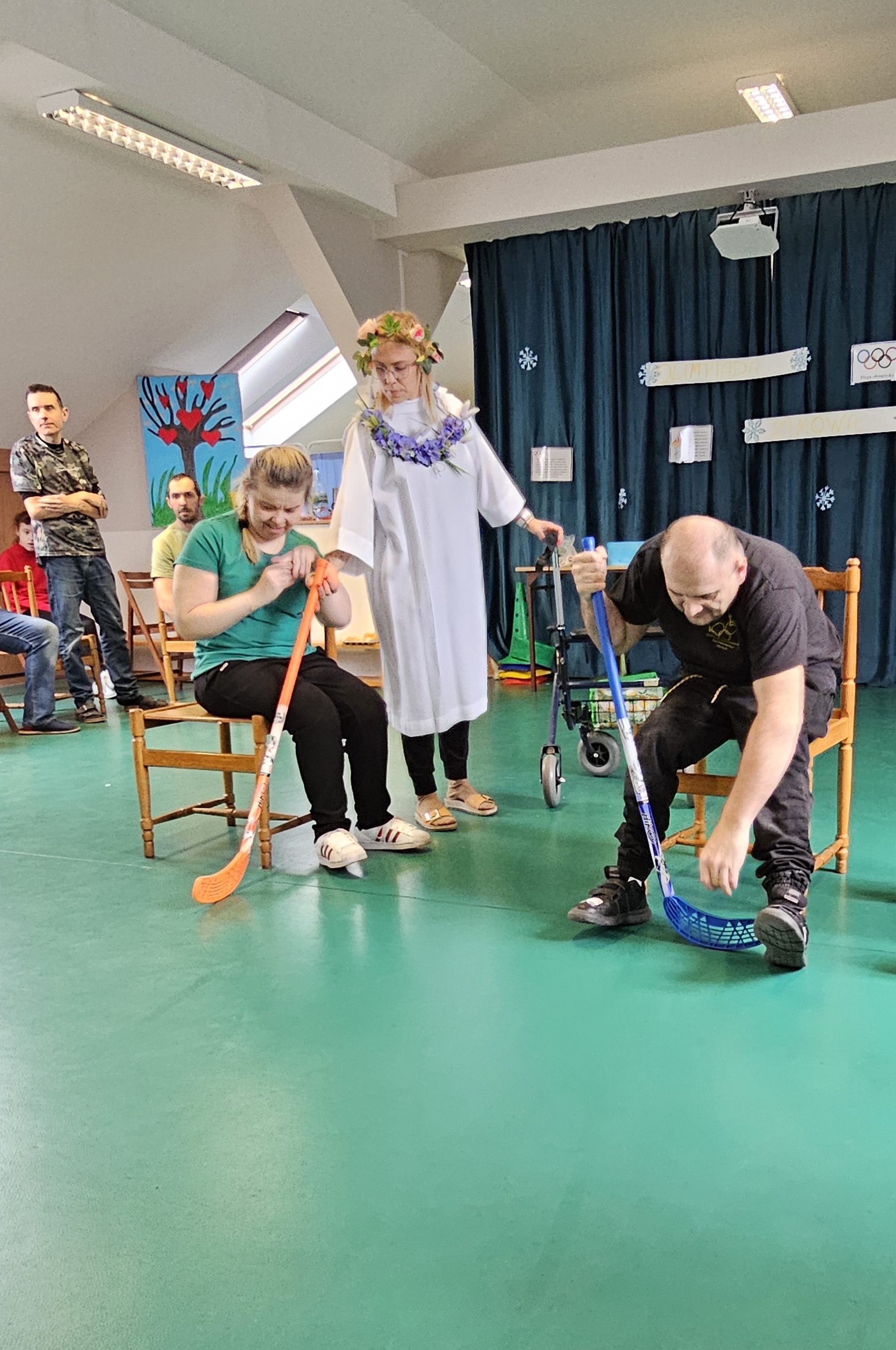 Najpierw było trochę teorii, żebyśmy sobie przypomnieli na czym polega olimpiada i jakie są jej symbole. Zostaliśmy podzieleni na 5 drużyn i ubrani w koszulki w kolorach kół olimpijskich, które splecione ze sobą reprezentują pięć kontynentów świata, połączonych ideą olimpijską. Każda drużyna reprezentowała zatem inny kontynent. Swoją wiedzę mogliśmy sprawdzić rozwiązując quizy i za pomocą kolorowanki. Olimpiada to jednak przede wszystkim sport i rywalizacja, więc był bieg z ogniem olimpijskim, saneczkarstwo i hokej. Zabawa była świetna! Dziękujemy pani Beacie za tą sportową rozrywkę![]()