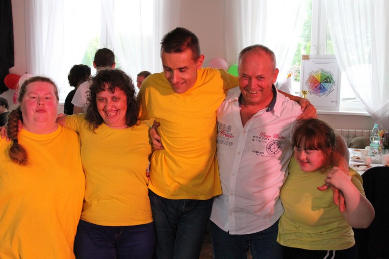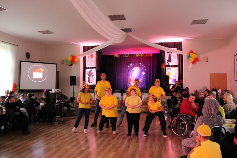 W tym roku motywem przewodnim przeglądu była bajka. Jak zawsze występy uczestników imprezy były bardzo pomysłowe i z przyjemnością się je oglądało. Oprócz naszej reprezentacji i gospodarzy w przeglądzie wzięły też udział ekipy z ŚDS w Lesznie, Kościanie, Krzywiniu, Krobi, Gostyniu i WTZ w Piaskach. Dodatkowo swoim występem zachwyciły dzieci z Przedszkola Samorządowego w Kąkolewie, które przeistoczyły się w urocze smerfy. Wśród występujących nie zabrakło Pięknej i Bestii, Kaczki Dziwaczki, Shreka czy Króla Lwa. My zaprezentowaliśmy układ taneczny Minionków. Na koniec wszystkie reprezentacje otrzymały dyplomy, puchary i upominki. Tradycyjnie kuchnia zaserwowała pyszny bigos i kiełbaski, więc nabraliśmy sił do tańca podczas dyskoteki. Dziękujemy ŚDS Kąkolewo za zaproszenie.