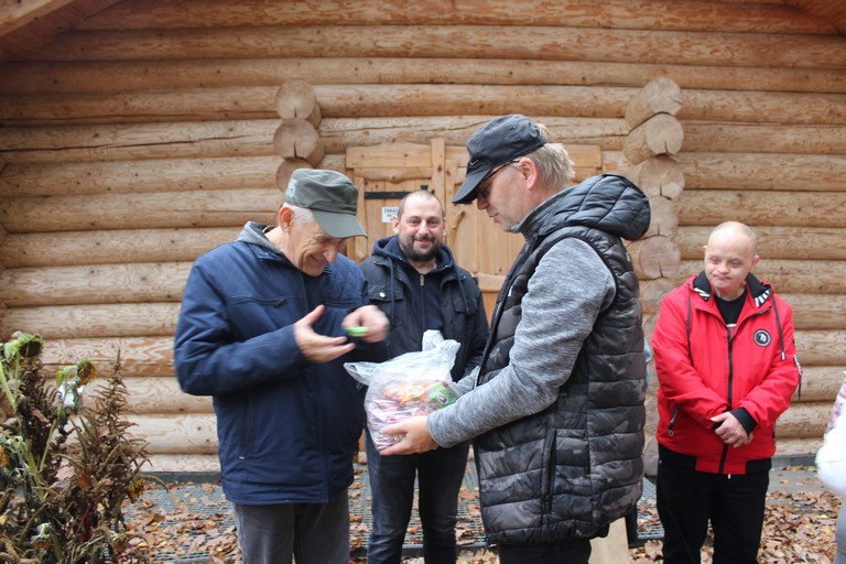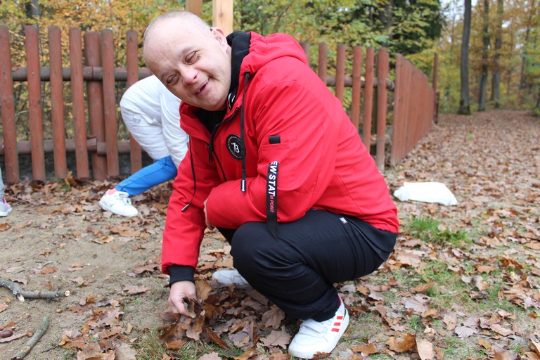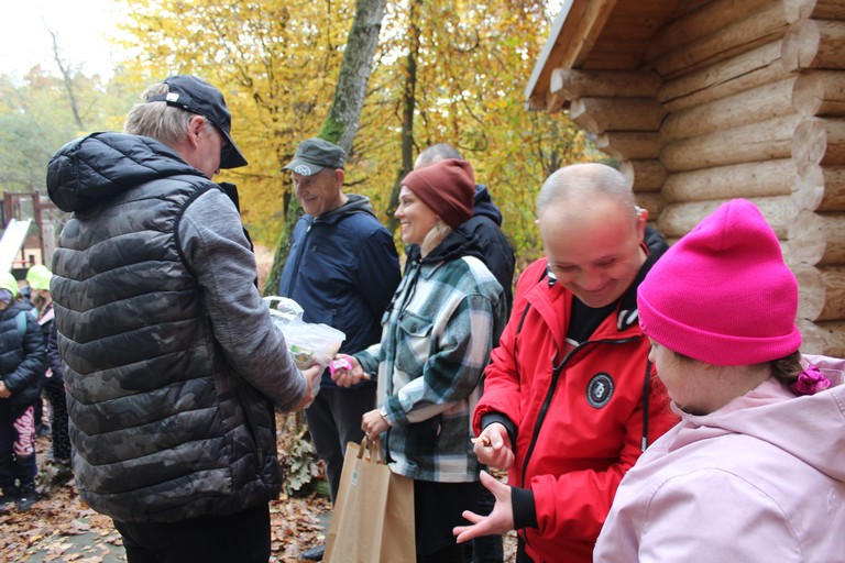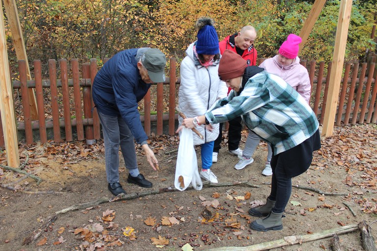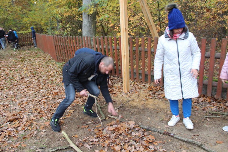 Po rozpoczęciu spotkania każda grupa poszła do lasu, aby podziwiać piękno jesiennej przyrody i zebrać dary lasu, z których później stworzyła tematyczną kompozycję. My, ze znalezionych liści, patyków, żołędzi i szyszek ułożyliśmy dużego jelenia. Później przyszedł czas na pyszną kiełbaskę z ogniska oraz biesiadę przy stołach. Na zakończenie spotkania organizatorzy wręczyli przygotowane przez Nadleśnictwo Włoszakowice upominki, pyszne cukierki oraz pogratulowali wszystkim właściwej postawy ekologicznej.